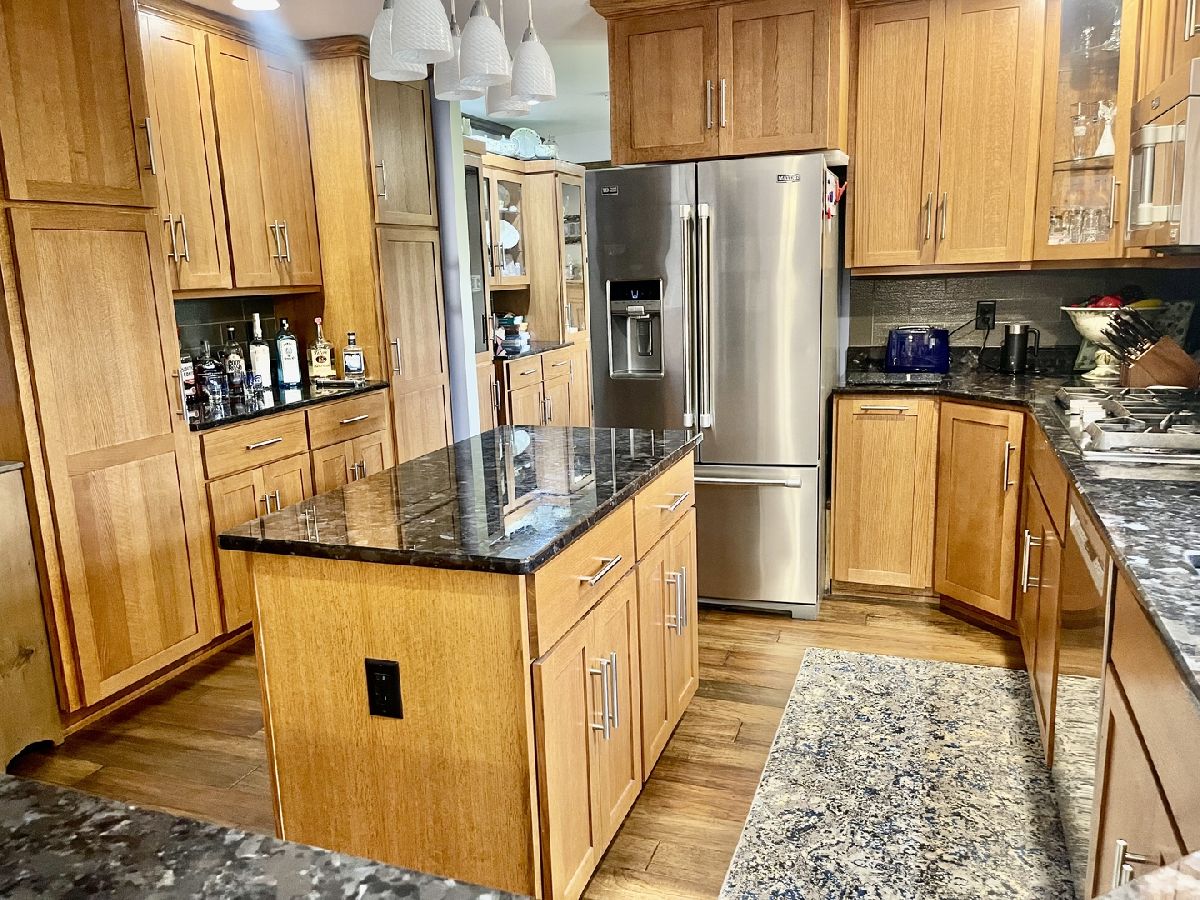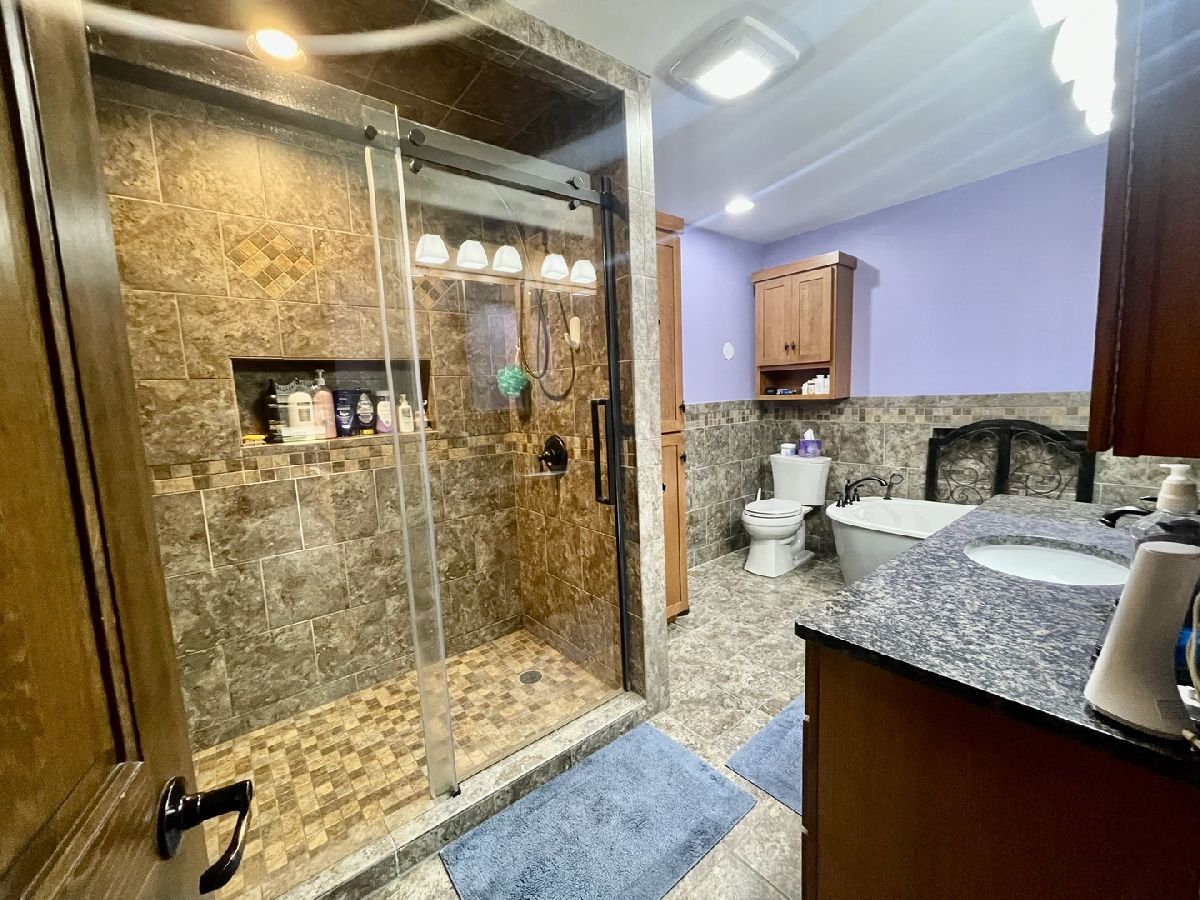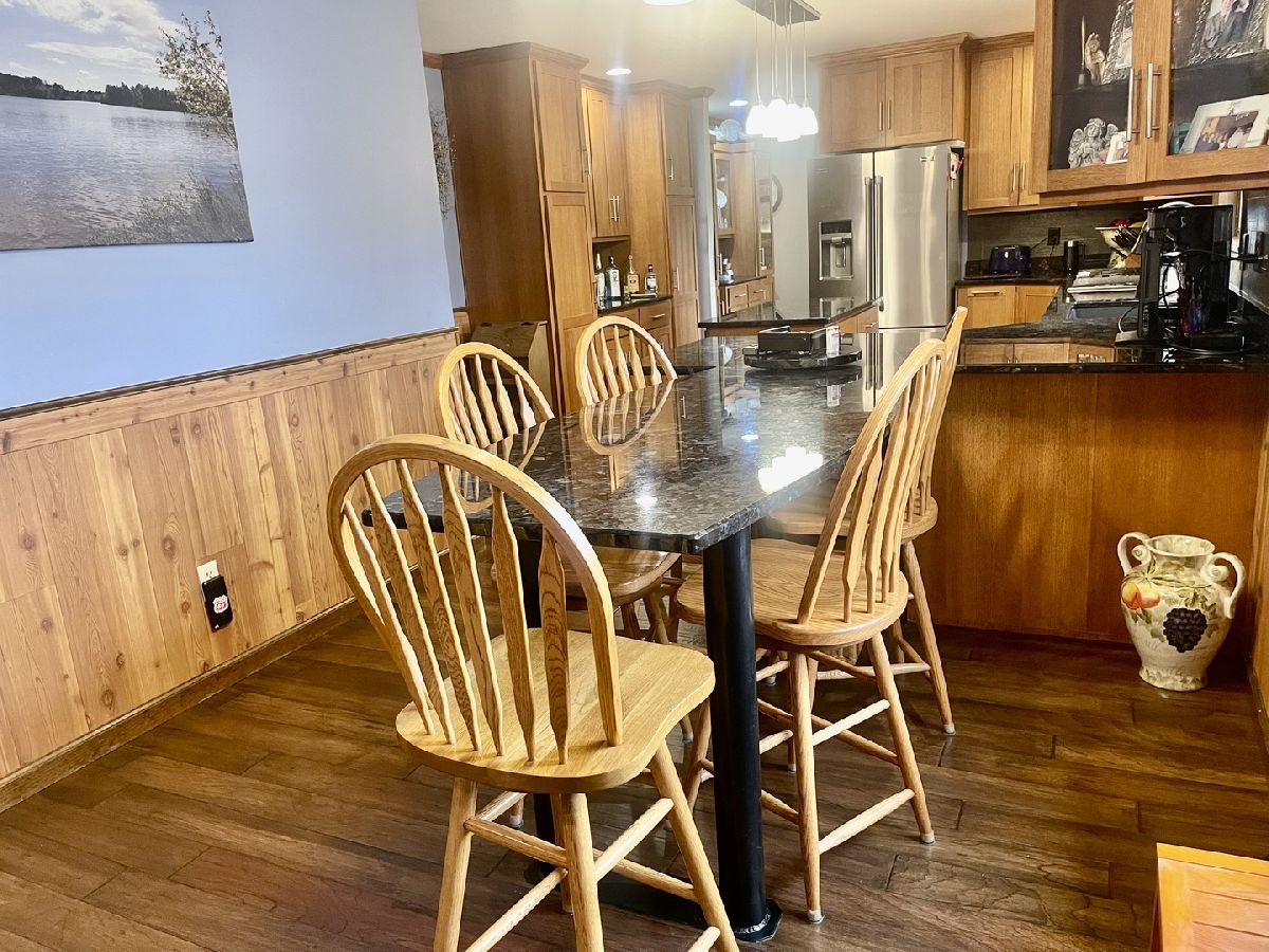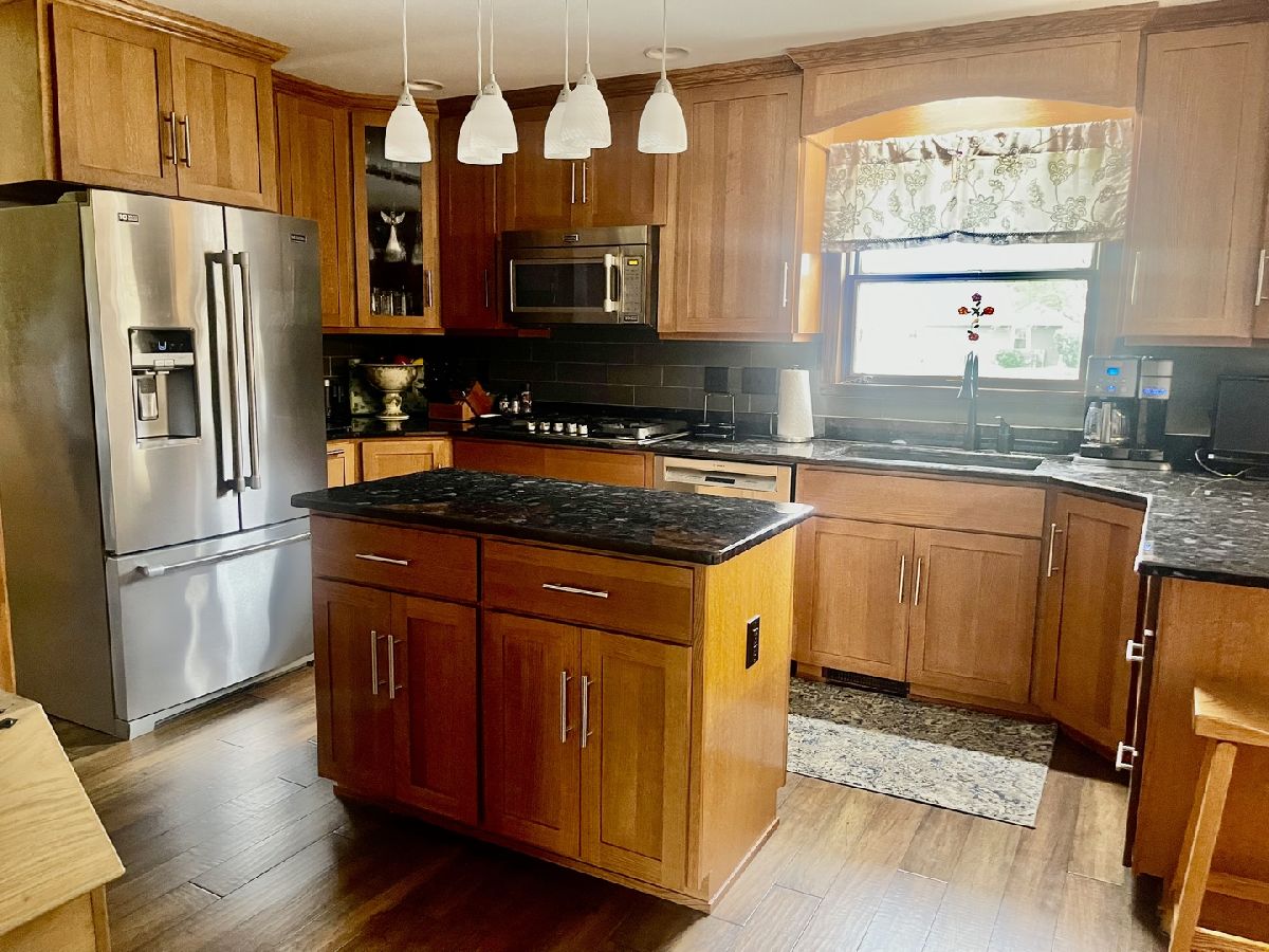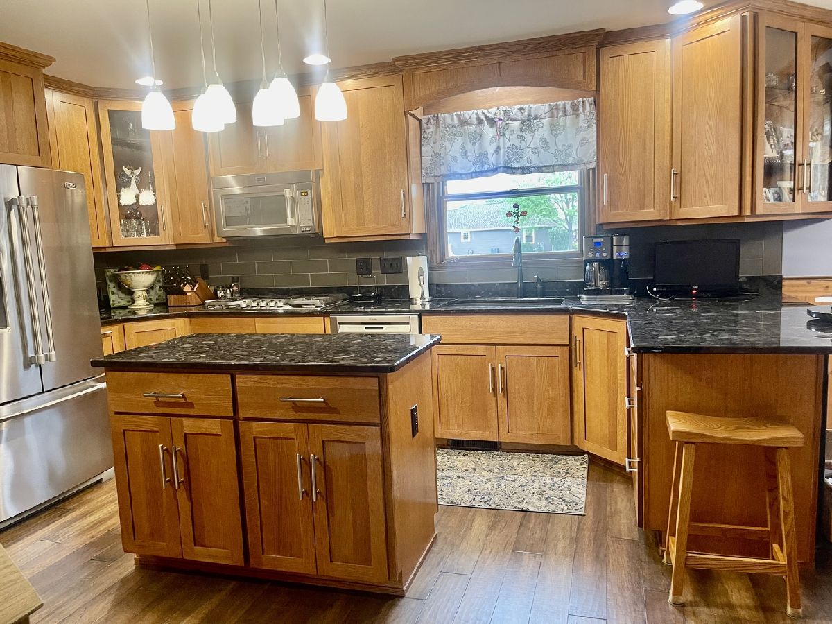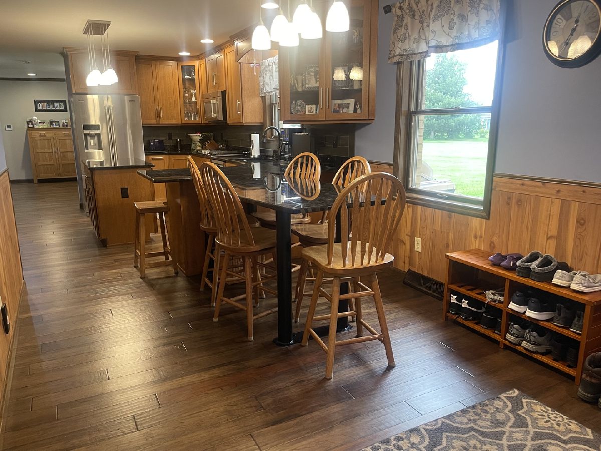Quality and attention to detail throughout this sprawling 4/5-bedroom,3 1/2-bathroom brick ranch in excellent condition. Features include engineered hardwood floors, solid wood 6 panel doors, spacious living room, formal dining room, huge custom kitchen with quarter sawn oak cabinets, pantry cabinet has pull out shelves, spice cabinet next to refrigerator, center island, peninsula and kitchen table all have beautiful granite top as well as the bar/coffee bar. Built in double oven, cook top, microwave and stainless-steel refrigerator. Tailor made sliding doors to the bedrooms. Primary bedroom has roomy walk-in closet (previously a bedroom and could be easily put back into a bedroom) bathroom with tiled wall and shower, tub, vanity, and cabinets of quarter sawn oak. Two other good-sized bedrooms. A large office with built-in shelving could be 4th or 5th bedroom. Large main level laundry room with closet and 1/2 bath. Whole house fan. Lovely 11'x27' three season room with access to storage area, and garage. The full basement has kitchen area and full bathroom. 2 furnaces (2014 & 2016), 2 central air conditioners, 2 water heaters, 2 electrical boxes and a whole house generator. Oversized 2 car attached garage with 2 overhead doors and openers. Huge, manicured back yard, concrete patio and 18'x 33' heated above ground pool surrounded by maintenance free deck, pool patio furniture on deck stays. A second 24'x30' insulated garage has a small overhead door and storage for pool equipment, mowers, snowblower, Christmas decorations (included) and toilet. The owner has never used the heater in 2nd garage. The front of the house has a concrete entry area and concrete pad off driveway for basketball hoop and additional parking. The property line on the north side is 23 feet off the neighbor's lot.