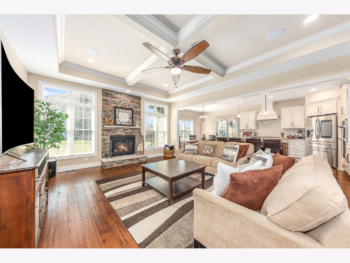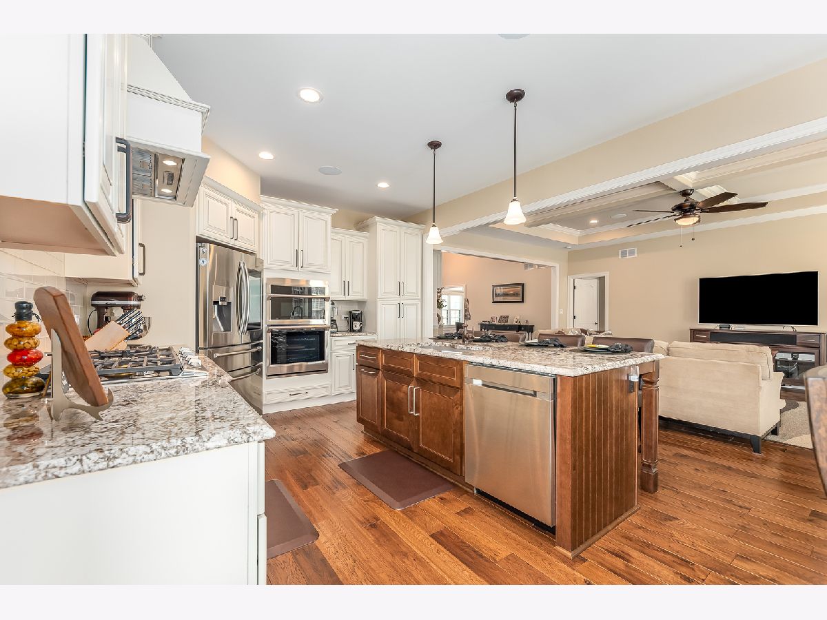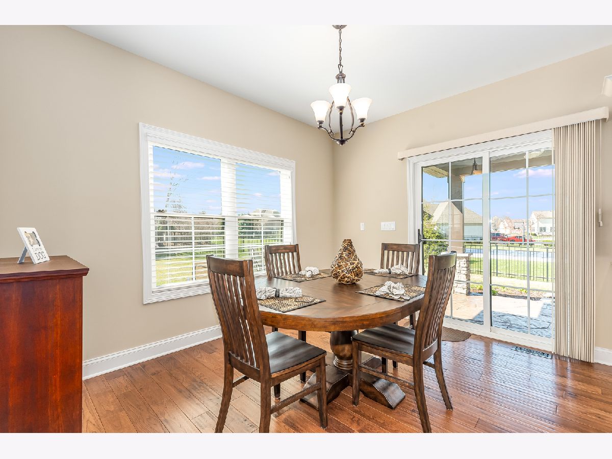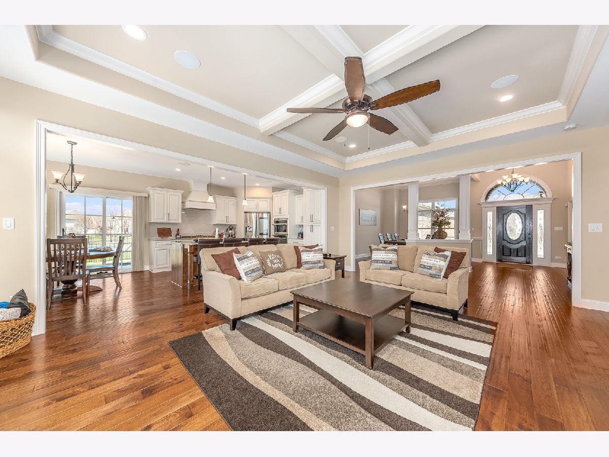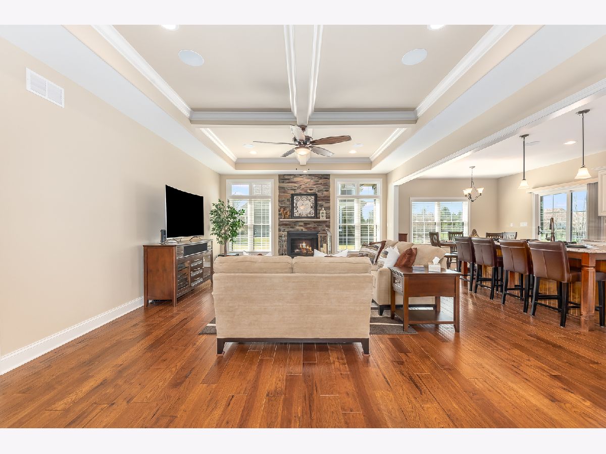 Exquisite home & meticulously maintained!! Just a couple of years young, sellers hate to leave! This custom built, open concept ranch has a gorgeous kitchen including white, soft close cabinets & drawers, granite counters, beautiful glass tile backsplash, gas cooktop and a large island that seats four plus a large eat in area that overlooks the beautiful yard. There are glowing chestnut color hardwood floors throughout the main level with upgraded carpeting & padding in the bedrooms. The spacious family room boasts a coffered ceiling, floor to ceiling stone heatilator fireplace, surround sound, beautiful custom molding & rounded drywall throughout. The large, bright office featuring french doors with hammered glass for privacy, wainscoting and volume ceilings, is the perfect space to work from home or to elearn. The master bedroom offers a custom built in combination entertainment center & cabinet. A custom barn door leads to the luxury bath featuring marble floors & quartz counters, soaking tub & a great closet organizer. Positioned on a large corner lot, the covered stamped concrete patio off kitchen also has a ceiling fan for enjoying summer nights. So many extras, Laundry room & baths all with quartz counters, faux wood blinds, surround sound system inside & on covered patio. The spacious three car garage offers epoxy/dura bond floors for easy clean up & great appearance. There is a full basement with plumbing rough in for bath just waiting to be built out to double your living space. The exterior offers gorgeous professional landscaping, sprinkler system & outdoor solar lights which are on a timer. Plus there is a security system with motion sensors & a ring doorbell. This truly is a must see, don't miss this exquisite home! Minooka school district too! Professional photos to be uploaded shortly.