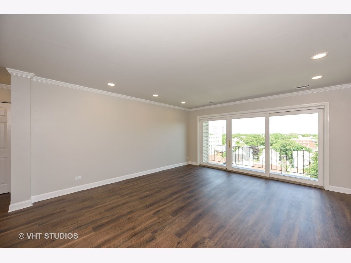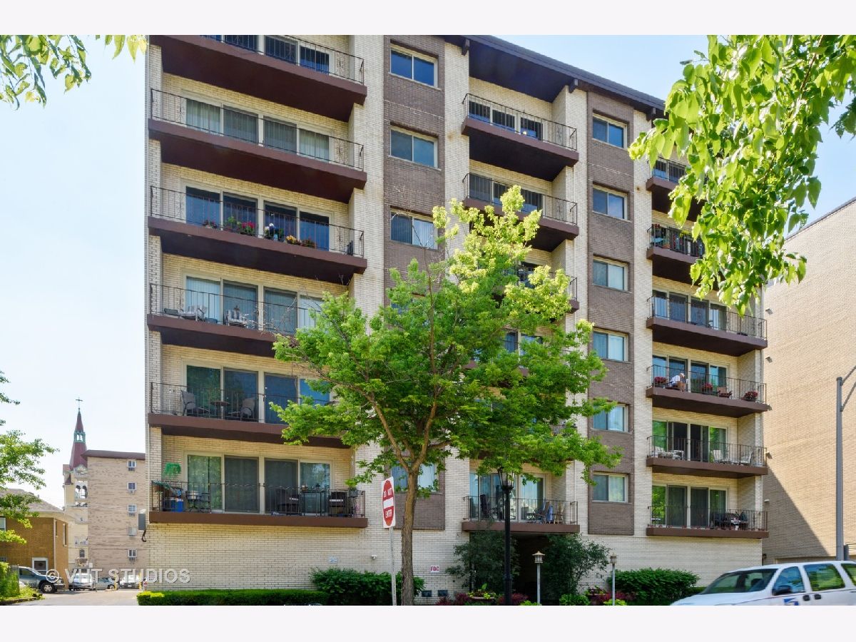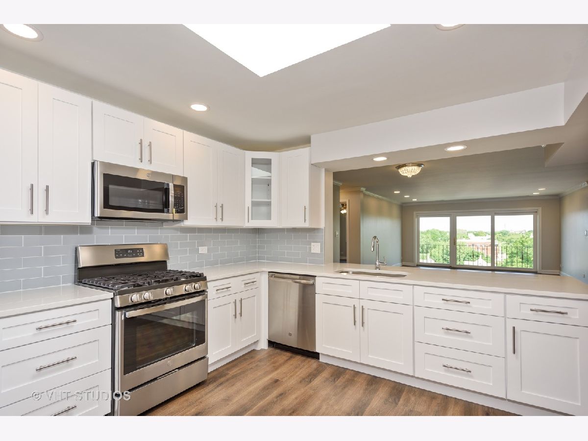 " TOTALLY REDONE" W/PERMITS ! 2bed/2bath top floor.All new kitchen opened up giving you view of Downtown Chicago. Along with SS appliances and Quartz CT. Split bedroom layout each with new baths, tons of closet space.All new floors throughout along with light fixtures and reassessed lighting. This unit is located on top floor facing East towards Downtown Chicago enjoyed on your own balcony. Elevator building and includes 2 parking spots, 1 garage and 1 assigned exterior space. Laundry and storage in building. ''GREAT LOCATION" walk to restaurants and shopping. Note: New fridge 6/25 delivery...