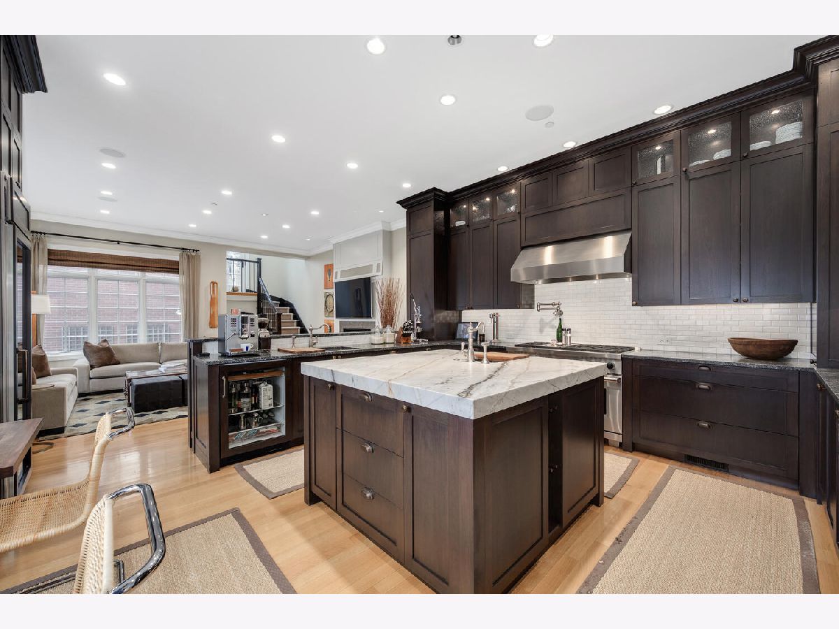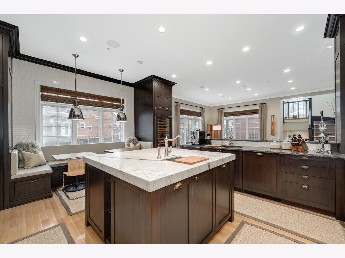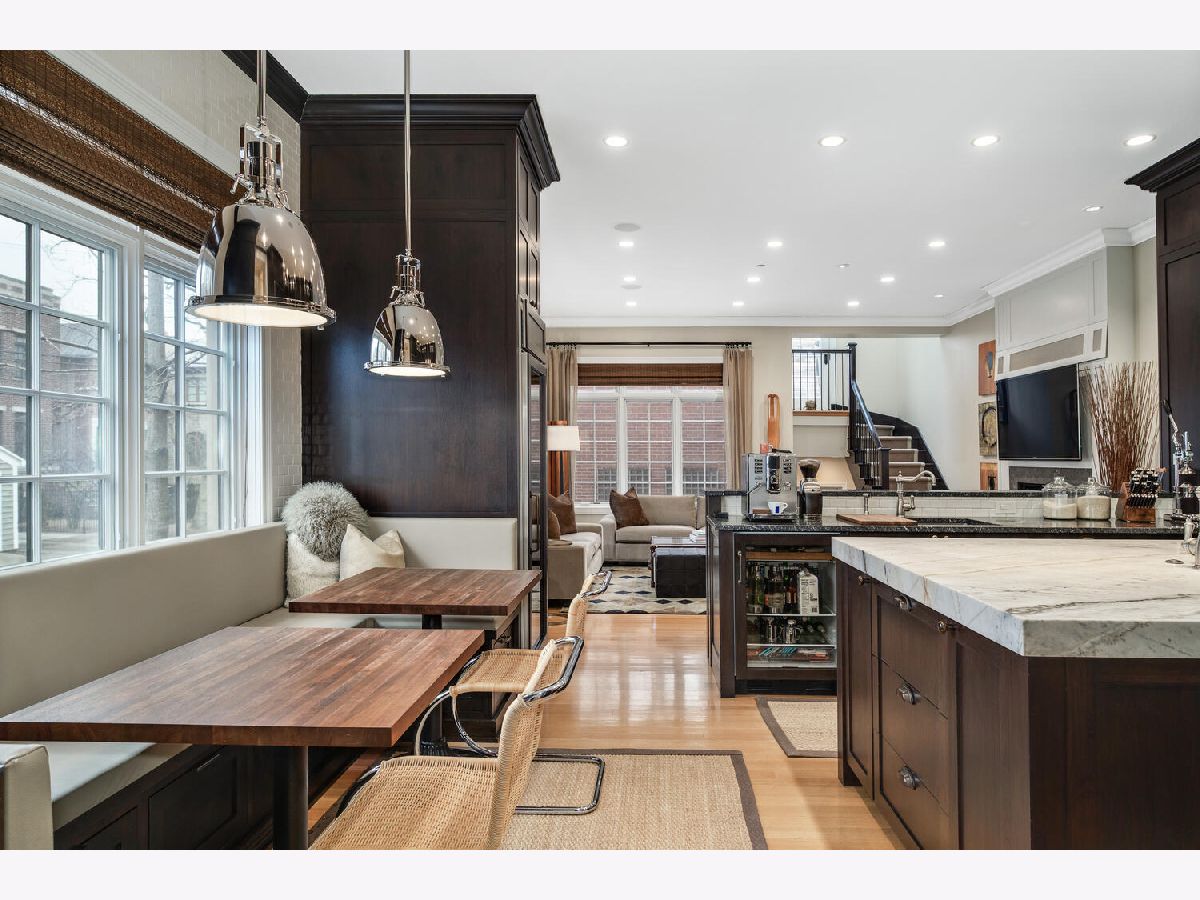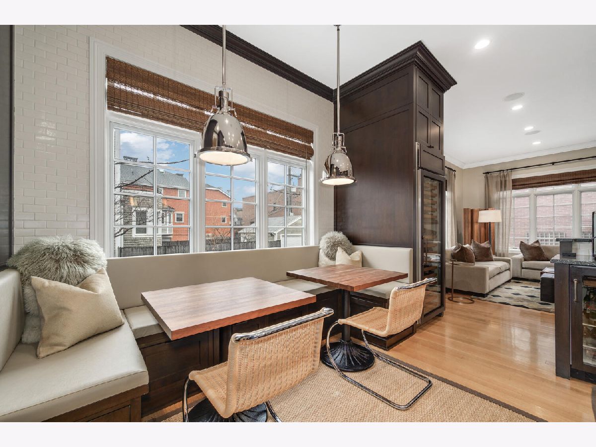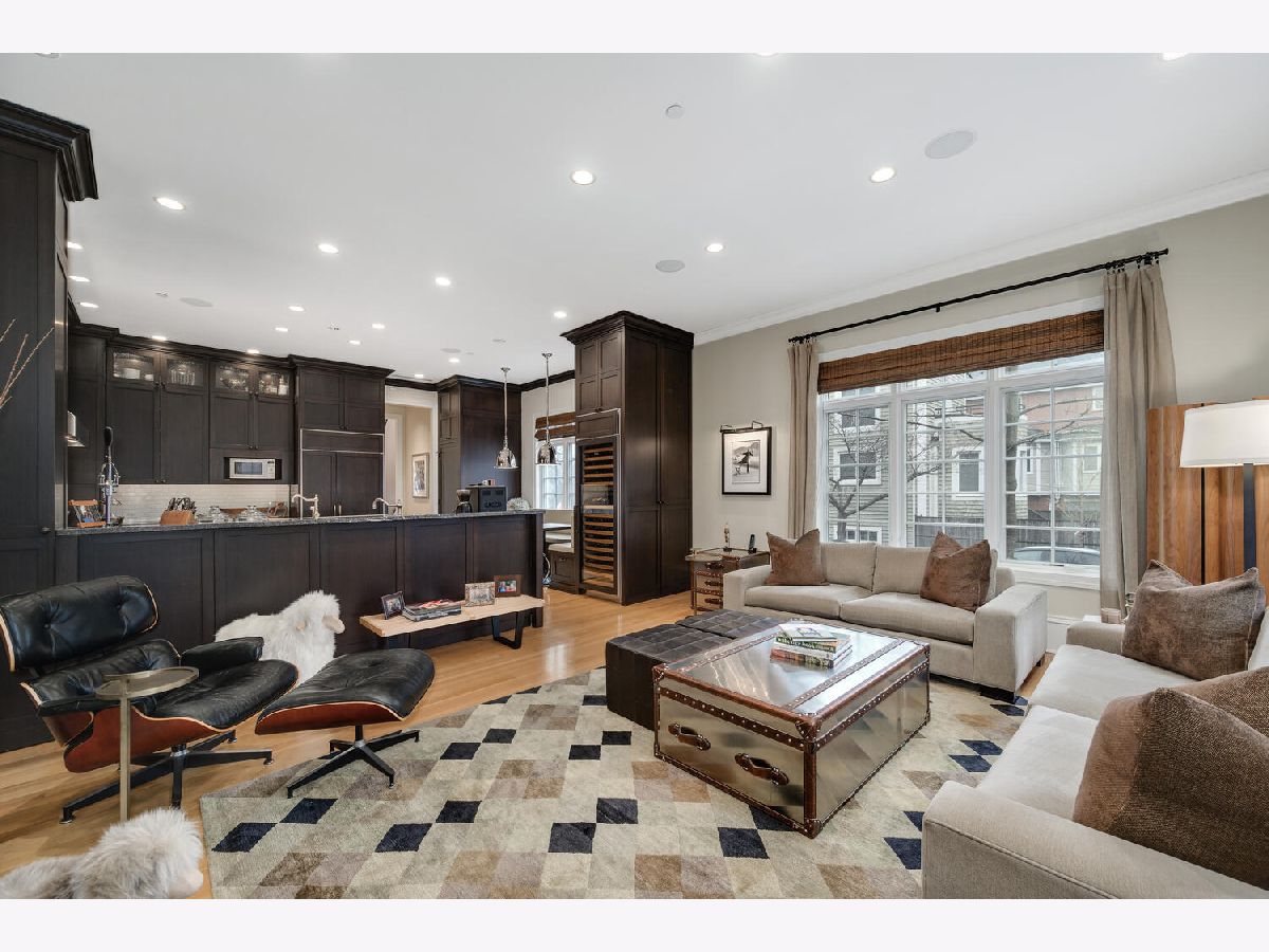 Incredibly stylish, Double RL vibe in this sun-drenched, park-facing home on a corner lot! Upon entry, you are greeted with exquisite details throughout. The corner lot allows for two sides of windows. The tall ceilings, beautiful moldings, and woodwork add to the grandeur of this immaculate home. Large west-facing windows bathe the main living space in natural light. The front living room features a stately fireplace with a limestone surround. A spacious formal dining space opens into the living room and offers ample space for a large table as well as a built-in buffet for easy storage and display. The kitchen is a chef's dream with an oversized island with prep sink, beautiful cabinetry and countertops, amazing storage, full sized wine fridge plus an additional beverage fridge. A perfectly hidden walk-in pantry is a thoughtful surprise. A charming breakfast nook with a built-in banquette and super hip floor-to-ceiling subway tile allows for the perfect spot to dine informally. Completely open to the kitchen is the huge greatroom with an additional fireplace and huge corner windows for sensational light. A rear staircase leads up to the garage roof deck, or down to the extra-large true mudroom, patio space, and rare attached garage. Three bedrooms are found on the second level of the home. The oversized primary has two fabulously built out walk-in closets and an oversized, spa-like bath with dual sinks, large shower, separate water closet, and amply storage. The two additional bedrooms on this level each of great closet space and ensuite baths. Bedroom level laundry completes this floor. A super sunny third level has the perfect office or den, opening onto a west facing terrace. Currently used as a media/entertaining room with a wet bar, the fourth bedroom also opens onto an east facing deck. A full bath completes this floor. The lower level is complete with an exercise or media room, comfortable guest suite, wine storage, and a stylish rec room with a wet bar. Bedroom level and lower level laundry make for convenient living and upper and lower level wet bars make entertaining a breeze! With Wrightwood Park as your front yard and an easy walk to restaurants and coffee shops, this home is perfectly situated in a fabulous Lincoln Park locale!