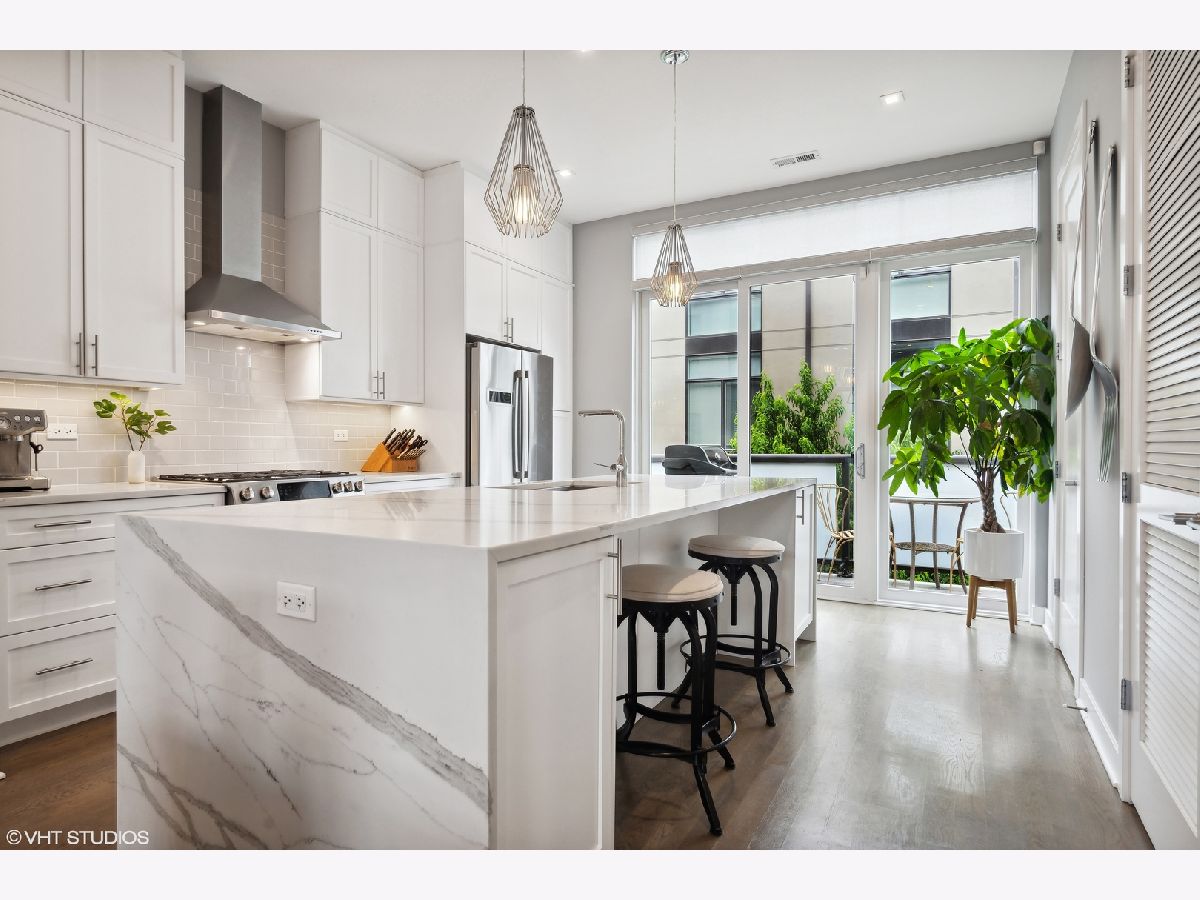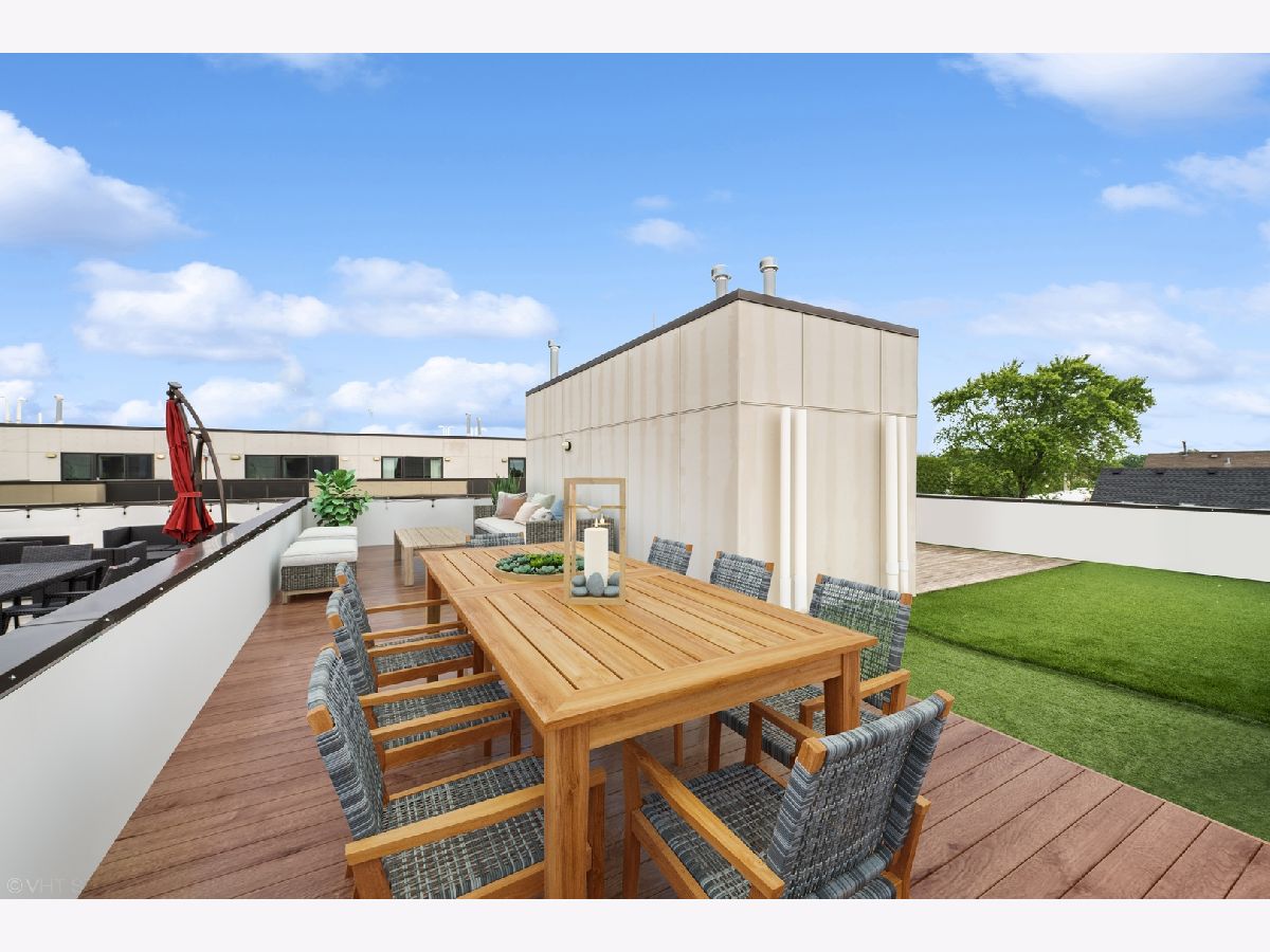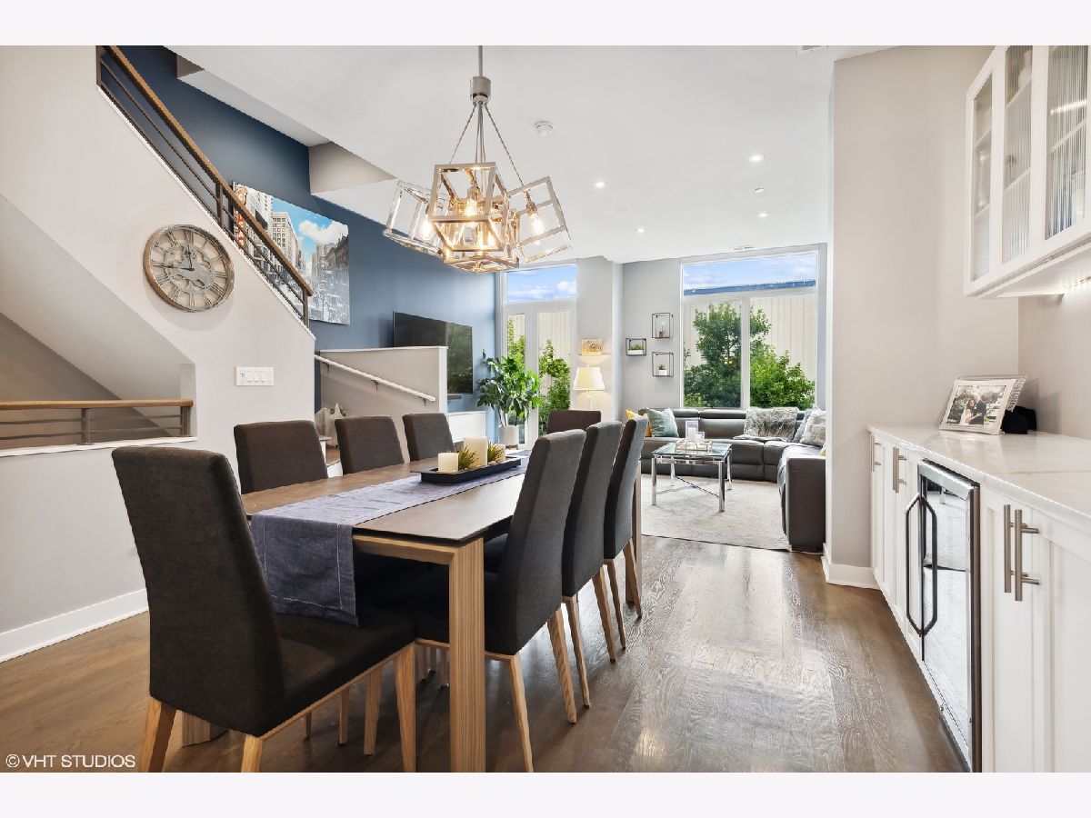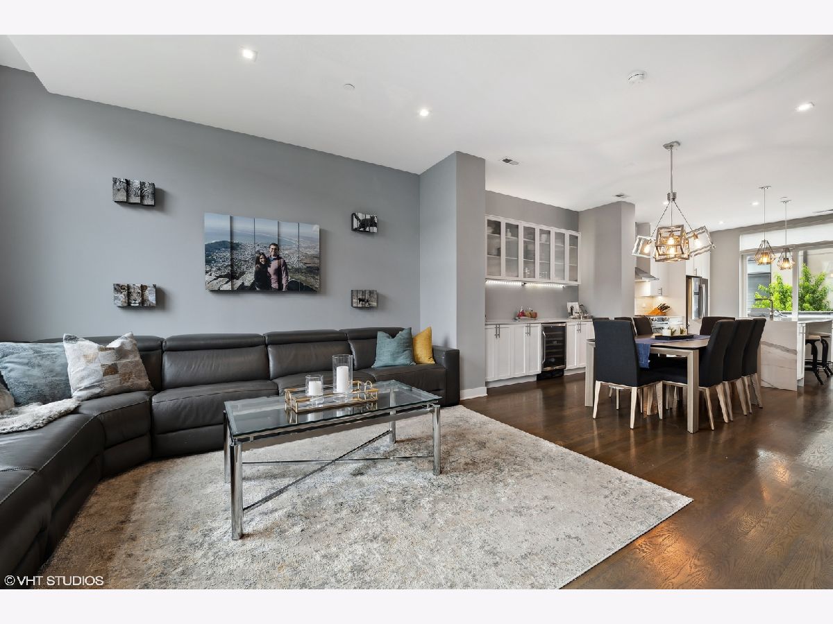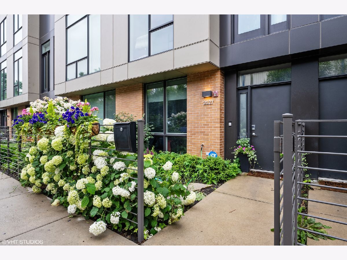Welcome to this stunning Bucktown 3 bedroom, 3.1 bathroom extra wide townhome with an expansive PRIVATE ROOF DECK, attached 2-car garage, and top-of-the-line Kohler and Grohe finishes throughout. Truly lives like a single-family home! Through the beautifully landscaped private fenced in front yard is the welcoming foyer with a smart lock front door, modern light fixture, coat closet, and sizable bedroom with tile flooring and an ensuite bathroom with a grey oak vanity and a frameless glass stand-up shower. The bright and airy main level with an open floor plan features a high-end chef-inspired kitchen with Bosch appliances including a 5-burner gas range with a vented hood, quartz countertops, double-stacked white European cabinetry with grey subway tile backsplash, and a 10' waterfall island with an under-mount single basin sink, integrated Sharp microwave, endless storage, custom pendant lighting, and an overhang for bar stools. Conveniently located off the kitchen is the private balcony that is perfect for grilling! The designated dining area is perfectly centered between the kitchen and living room with a custom built-in bar with quartz counters equipped with a wine beverage center, frosted glass cabinets + under lighting, and an eye-catching chandelier. The spacious living room overlooks the tree-lined street and is flooded with natural light through the oversized windows. A powder room completes the main level. Two bedrooms located on the top floor including a king-sized primary bedroom that features floor-to-ceiling windows, a professionally organized walk-in closet, a sleek ceiling fan, and an ensuite marble bathroom with a modern double sink quartz vanity + inset drawers, a step-in pressure balanced shower, and water closet with pocket door. The second bedroom is located down the hallway and offers floor-to-ceiling windows and an ensuite bathroom with quartz countertop vanity, tile flooring, and a shower/tub combo. Easy access to the front-load LG washer/dryer, located in the hallway between the bedrooms. The fully built-out private roof top deck spans the entire length of the home and is a true oasis with durable decking + turf and can easily accommodate a full-size dining table and lounge furniture! Additional highlights of this dual-zoned home include oak flooring on the main and third floors, custom window shades throughout, Nest Thermostat, and ADT security system. Amazing Bucktown/Logan Square location, within walking distance to CTA Blue Line, 606 Trail, and all the best restaurants and shopping along Armitage Ave, Milwaukee Ave!