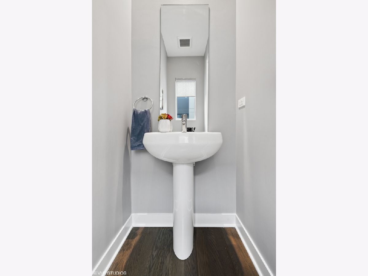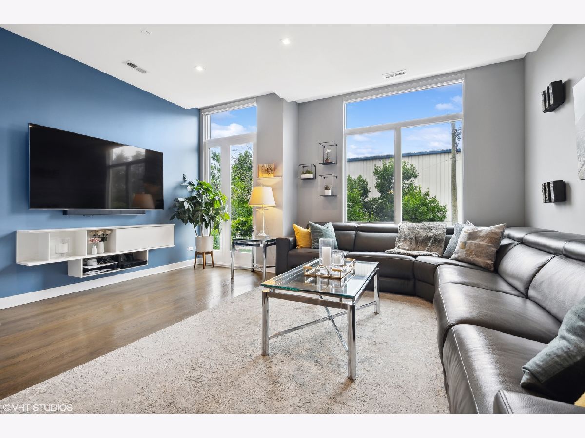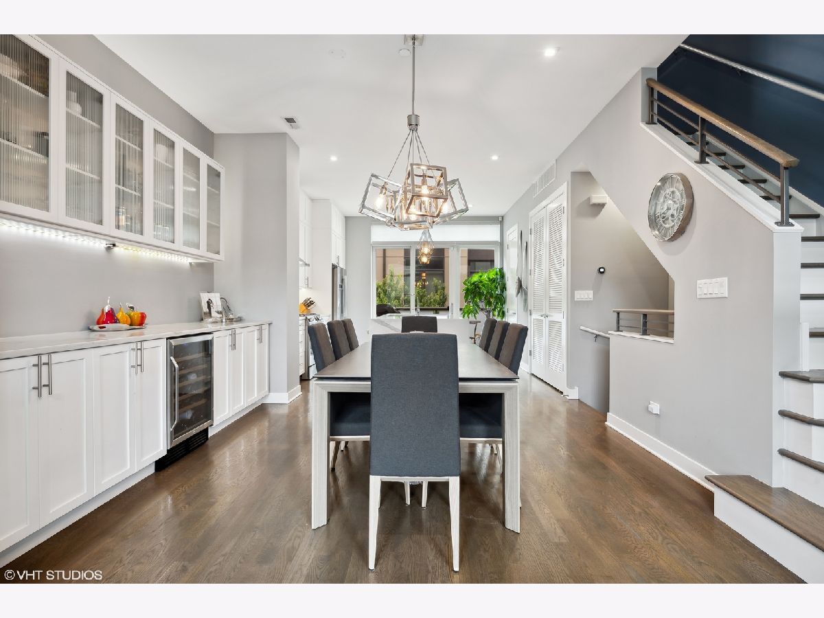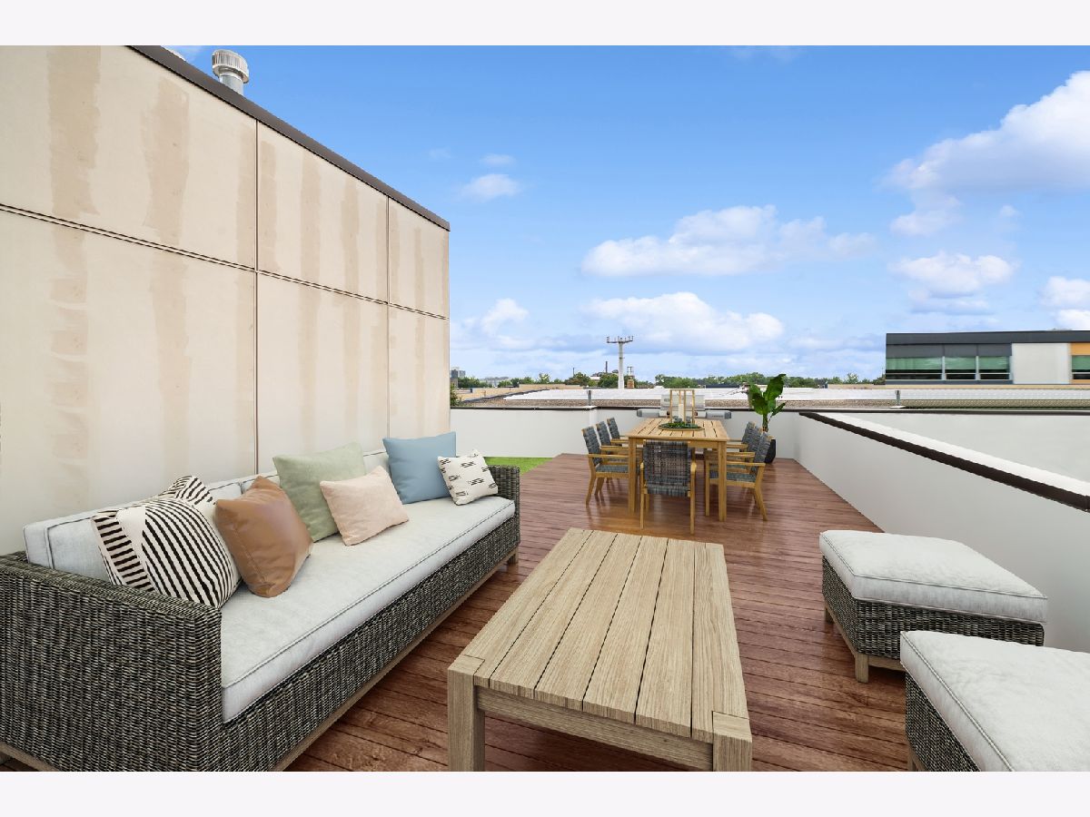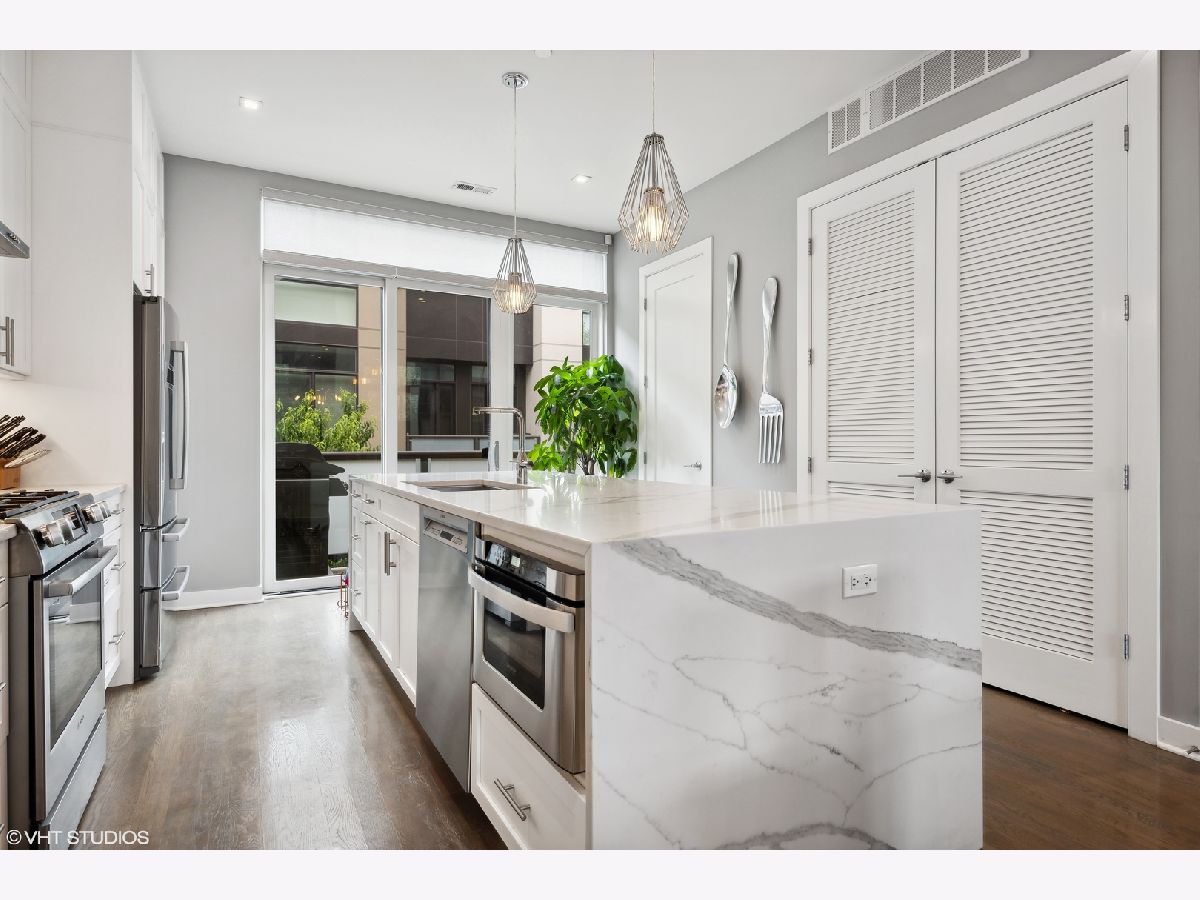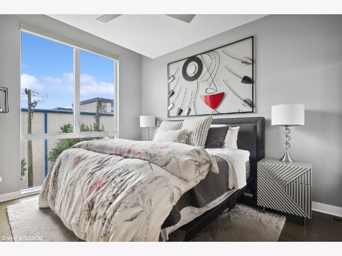 Welcome to this stunning Bucktown 3 bedroom, 3.1 bathroom extra wide townhome with an expansive PRIVATE ROOF DECK, attached 2-car garage, and top-of-the-line Kohler and Grohe finishes throughout. Truly lives like a single-family home! Through the beautifully landscaped private fenced in front yard is the welcoming foyer with a smart lock front door, modern light fixture, coat closet, and sizable bedroom with tile flooring and an ensuite bathroom with a grey oak vanity and a frameless glass stand-up shower. The bright and airy main level with an open floor plan features a high-end chef-inspired kitchen with Bosch appliances including a 5-burner gas range with a vented hood, quartz countertops, double-stacked white European cabinetry with grey subway tile backsplash, and a 10' waterfall island with an under-mount single basin sink, integrated Sharp microwave, endless storage, custom pendant lighting, and an overhang for bar stools. Conveniently located off the kitchen is the private balcony that is perfect for grilling! The designated dining area is perfectly centered between the kitchen and living room with a custom built-in bar with quartz counters equipped with a wine beverage center, frosted glass cabinets + under lighting, and an eye-catching chandelier. The spacious living room overlooks the tree-lined street and is flooded with natural light through the oversized windows. A powder room completes the main level. Two bedrooms located on the top floor including a king-sized primary bedroom that features floor-to-ceiling windows, a professionally organized walk-in closet, a sleek ceiling fan, and an ensuite marble bathroom with a modern double sink quartz vanity + inset drawers, a step-in pressure balanced shower, and water closet with pocket door. The second bedroom is located down the hallway and offers floor-to-ceiling windows and an ensuite bathroom with quartz countertop vanity, tile flooring, and a shower/tub combo. Easy access to the front-load LG washer/dryer, located in the hallway between the bedrooms. The fully built-out private roof top deck spans the entire length of the home and is a true oasis with durable decking + turf and can easily accommodate a full-size dining table and lounge furniture! Additional highlights of this dual-zoned home include oak flooring on the main and third floors, custom window shades throughout, Nest Thermostat, and ADT security system. Amazing Bucktown/Logan Square location, within walking distance to CTA Blue Line, 606 Trail, and all the best restaurants and shopping along Armitage Ave, Milwaukee Ave!