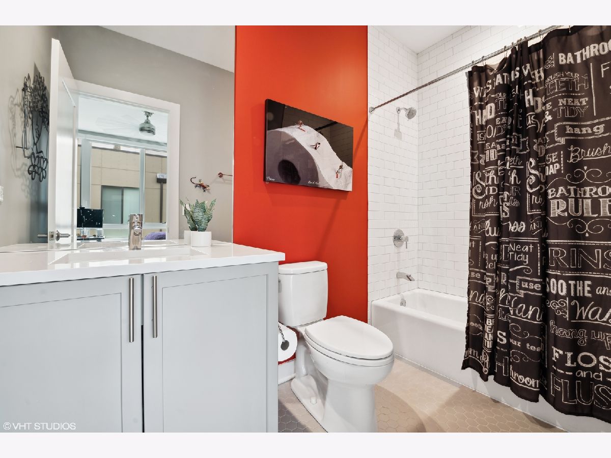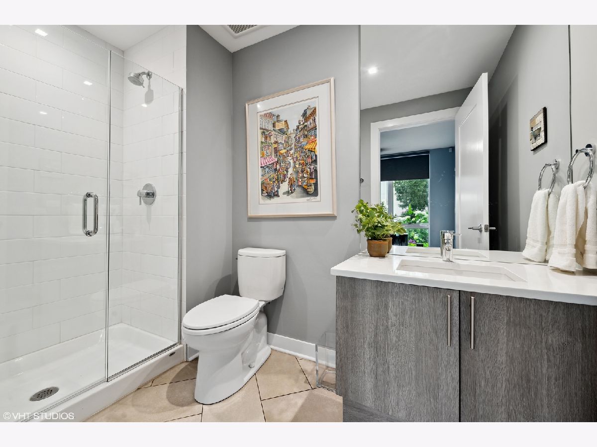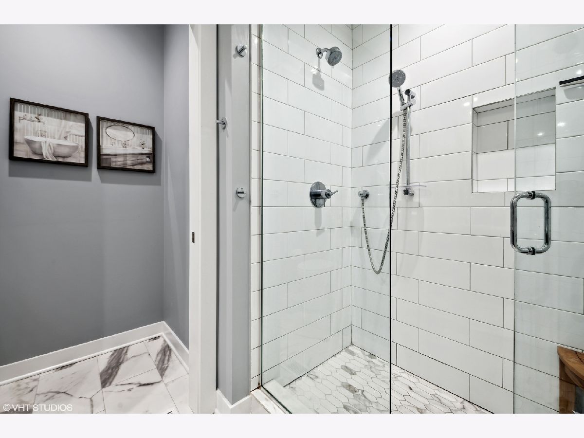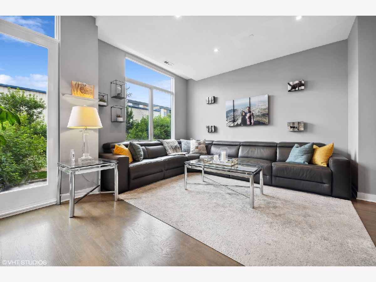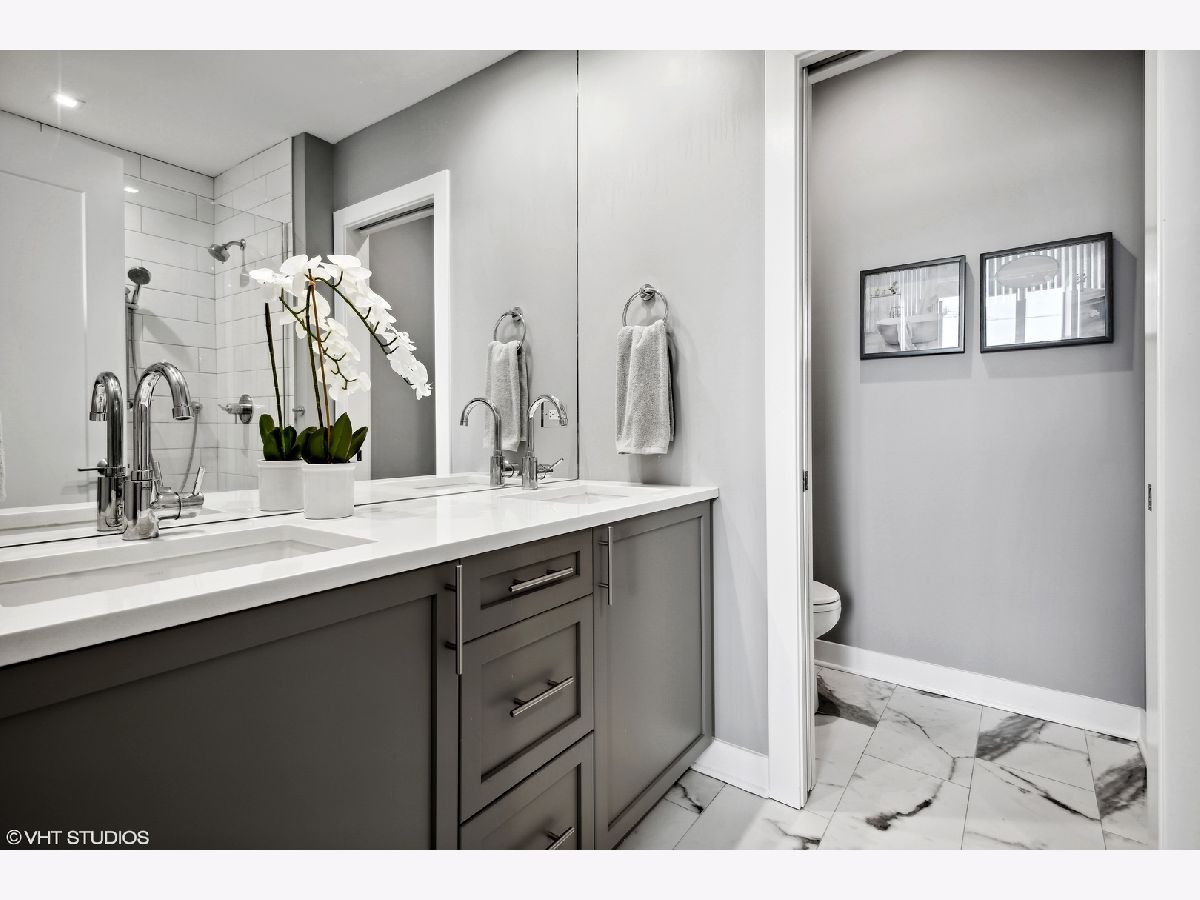 Welcome to this stunning Bucktown 3 bedroom, 3.1 bathroom extra wide townhome with an expansive PRIVATE ROOF DECK, attached 2-car garage, and top-of-the-line Kohler and Grohe finishes throughout. Truly lives like a single-family home! Through the beautifully landscaped private fenced in front yard is the welcoming foyer with a smart lock front door, modern light fixture, coat closet, and sizable bedroom with tile flooring and an ensuite bathroom with a grey oak vanity and a frameless glass stand-up shower. The bright and airy main level with an open floor plan features a high-end chef-inspired kitchen with Bosch appliances including a 5-burner gas range with a vented hood, quartz countertops, double-stacked white European cabinetry with grey subway tile backsplash, and a 10' waterfall island with an under-mount single basin sink, integrated Sharp microwave, endless storage, custom pendant lighting, and an overhang for bar stools. Conveniently located off the kitchen is the private balcony that is perfect for grilling! The designated dining area is perfectly centered between the kitchen and living room with a custom built-in bar with quartz counters equipped with a wine beverage center, frosted glass cabinets + under lighting, and an eye-catching chandelier. The spacious living room overlooks the tree-lined street and is flooded with natural light through the oversized windows. A powder room completes the main level. Two bedrooms located on the top floor including a king-sized primary bedroom that features floor-to-ceiling windows, a professionally organized walk-in closet, a sleek ceiling fan, and an ensuite marble bathroom with a modern double sink quartz vanity + inset drawers, a step-in pressure balanced shower, and water closet with pocket door. The second bedroom is located down the hallway and offers floor-to-ceiling windows and an ensuite bathroom with quartz countertop vanity, tile flooring, and a shower/tub combo. Easy access to the front-load LG washer/dryer, located in the hallway between the bedrooms. The fully built-out private roof top deck spans the entire length of the home and is a true oasis with durable decking + turf and can easily accommodate a full-size dining table and lounge furniture! Additional highlights of this dual-zoned home include oak flooring on the main and third floors, custom window shades throughout, Nest Thermostat, and ADT security system. Amazing Bucktown/Logan Square location, within walking distance to CTA Blue Line, 606 Trail, and all the best restaurants and shopping along Armitage Ave, Milwaukee Ave!