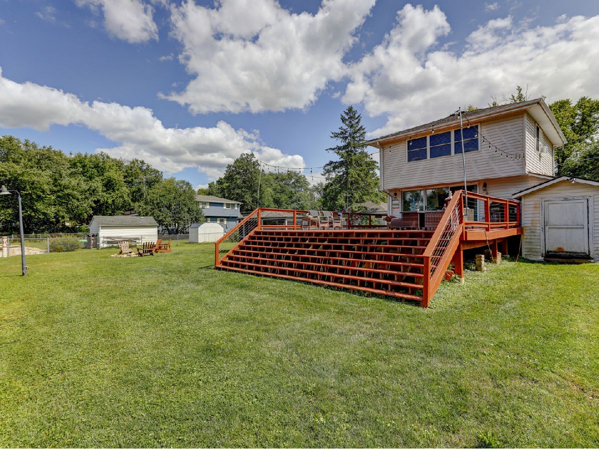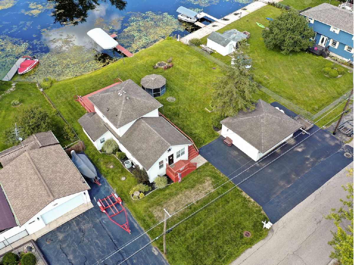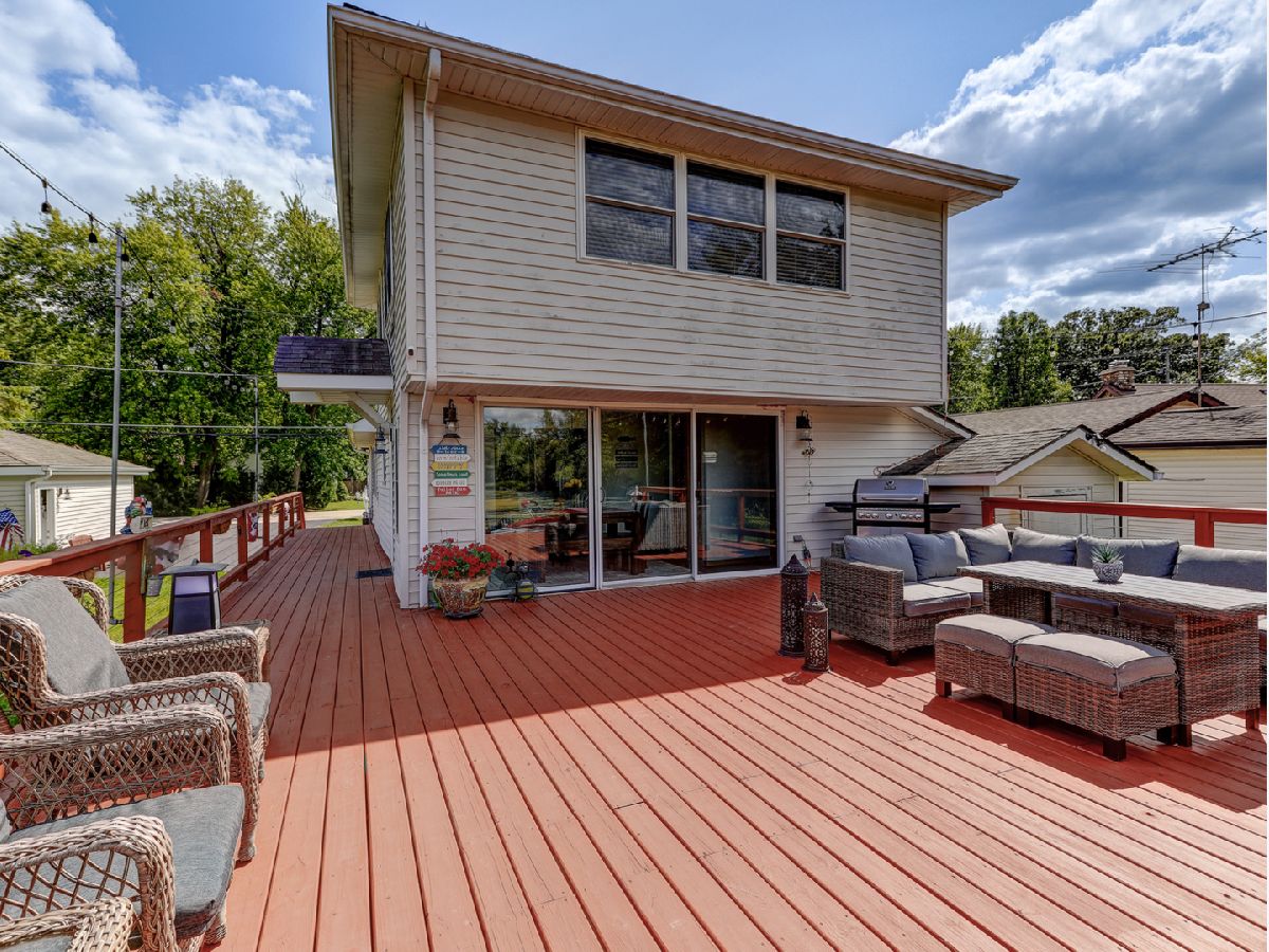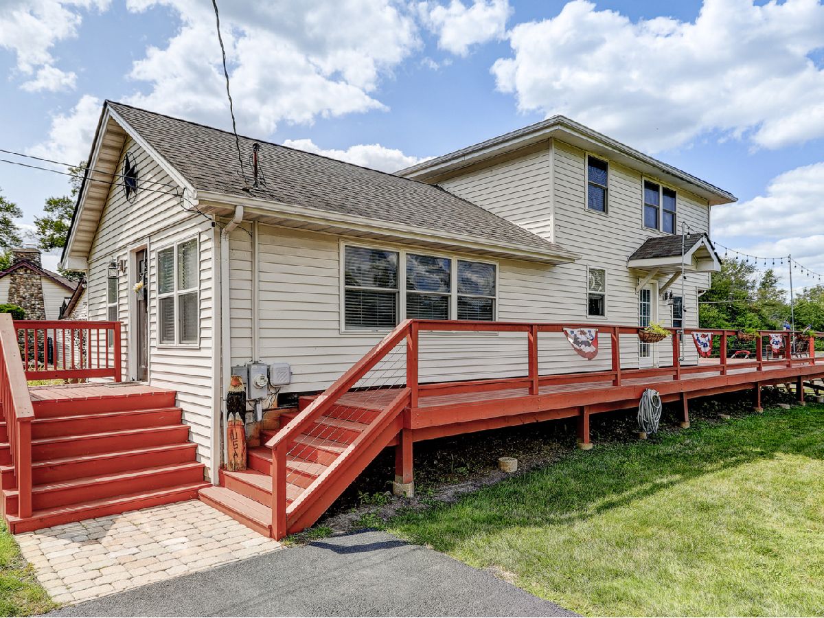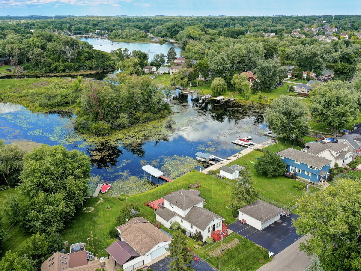 Amazing 2 story waterfront home with 3 bedrooms, 2 full baths, 2.5 car garage and full basement. Property sits on a double lot with 100 ft of frontage on wide channel that leads into Bluff Lake, Petite Lake and Fox Lake. Image waking up to the sound of nature sitting on your beautiful deck watching the fish jump out of the water, hearing the birds chirping and seeing the beautiful birds including the Pelicans in early Spring. Inside you will love the nice updates the home has to offer including hardwood floors in the kitchen with SS appliances, living room with volume ceiling and wood beams and large eating area. Main level includes 2 bedrooms and upstairs you will be amazed by the large master suite w/expansive windows overlooking the Lake with huge walk in closet and brand new updated master bathroom w/all new flooring, faucet, toilet, vanity and shower with nice lighting etc. Entertain guests on your 30 x 30 wrap around deck or in the gazebo. New features include new sump pump, new driveway (2020), new HVAC (2020), resealed deck (2021), new front porch (2021), new master bathroom (2022). Newer dock/boat pier, storage shed, fire pit and more. Move in ready and in time to enjoy the rest of the Summer.
