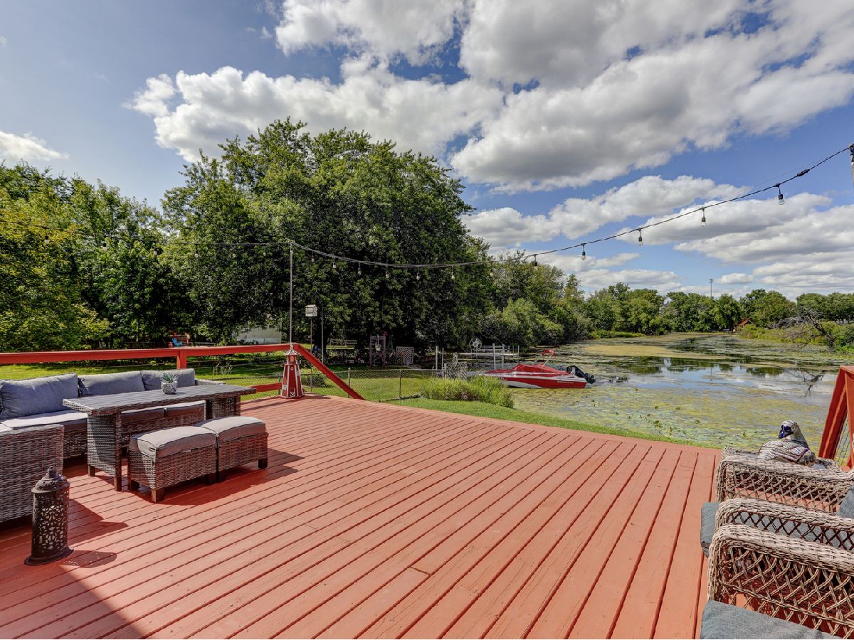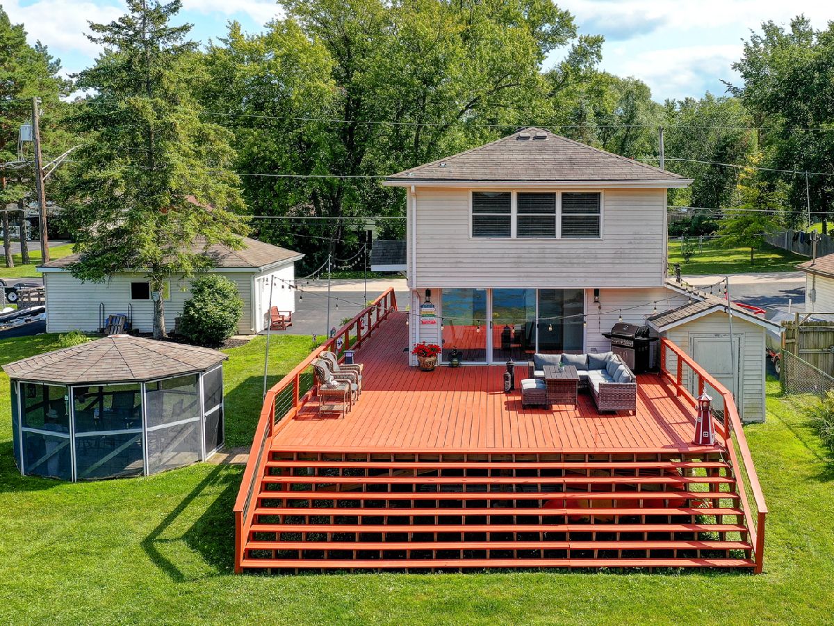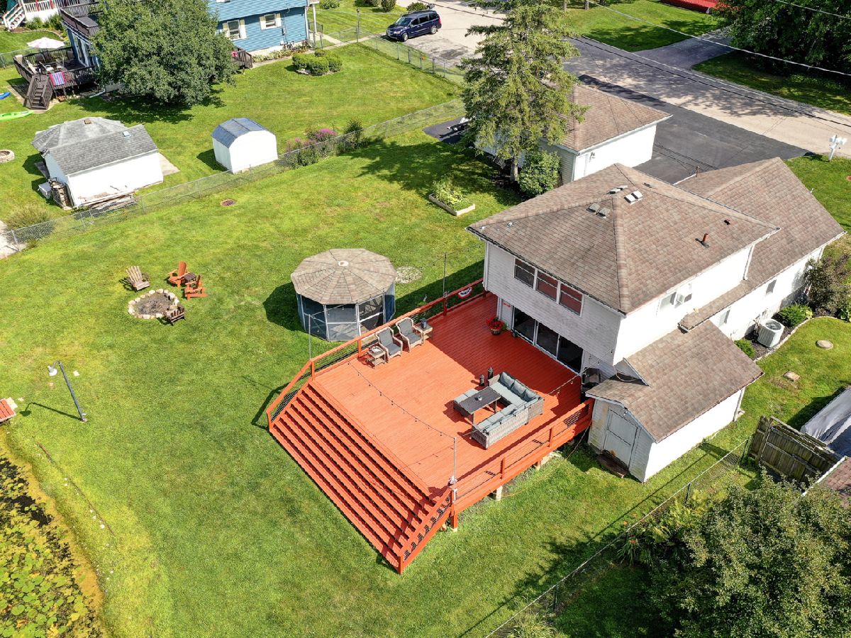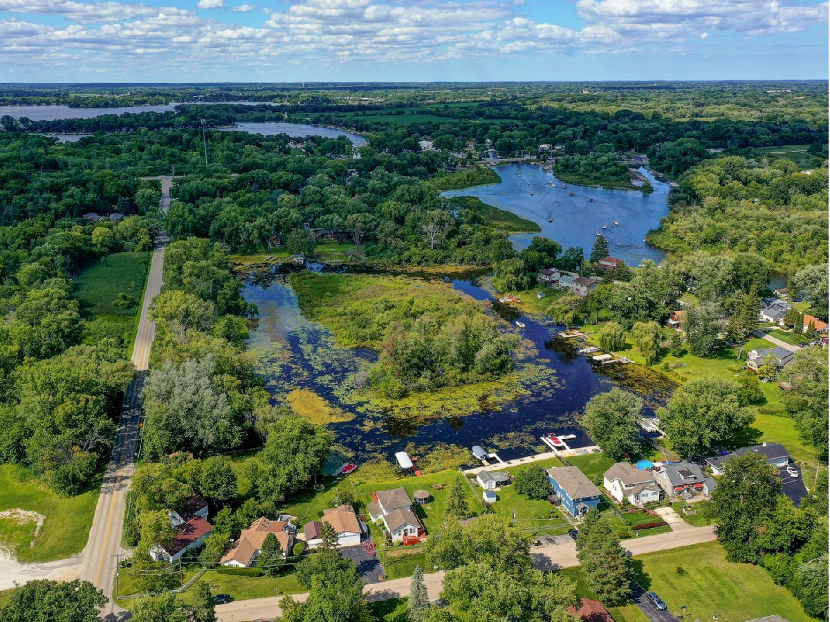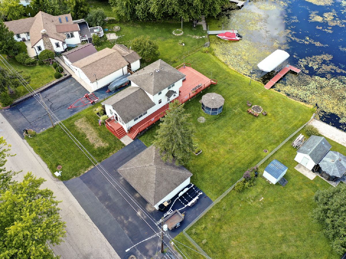 Amazing 2 story waterfront home with 3 bedrooms, 2 full baths, 2.5 car garage and full basement. Property sits on a double lot with 100 ft of frontage on wide channel that leads into Bluff Lake, Petite Lake and Fox Lake. Image waking up to the sound of nature sitting on your beautiful deck watching the fish jump out of the water, hearing the birds chirping and seeing the beautiful birds including the Pelicans in early Spring. Inside you will love the nice updates the home has to offer including hardwood floors in the kitchen with SS appliances, living room with volume ceiling and wood beams and large eating area. Main level includes 2 bedrooms and upstairs you will be amazed by the large master suite w/expansive windows overlooking the Lake with huge walk in closet and brand new updated master bathroom w/all new flooring, faucet, toilet, vanity and shower with nice lighting etc. Entertain guests on your 30 x 30 wrap around deck or in the gazebo. New features include new sump pump, new driveway (2020), new HVAC (2020), resealed deck (2021), new front porch (2021), new master bathroom (2022). Newer dock/boat pier, storage shed, fire pit and more. Move in ready and in time to enjoy the rest of the Summer.