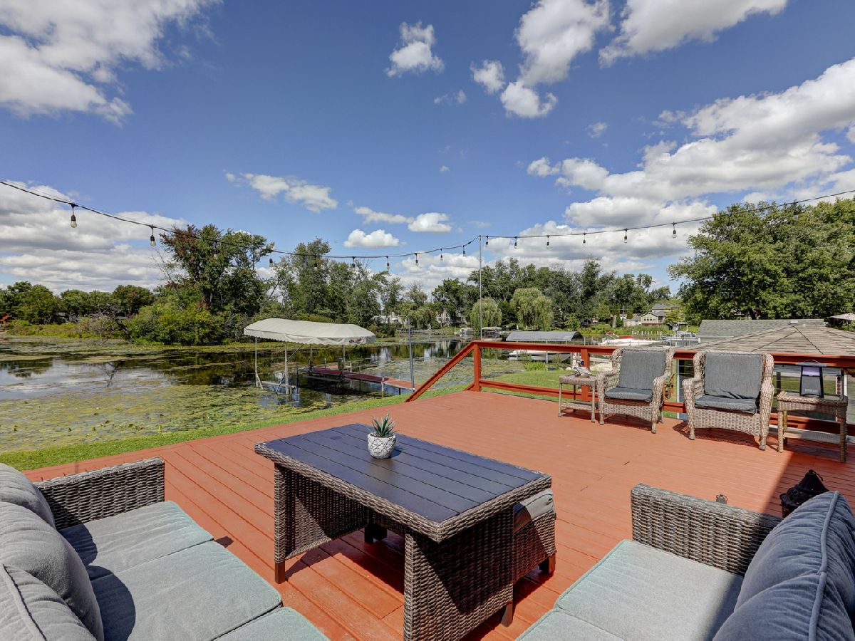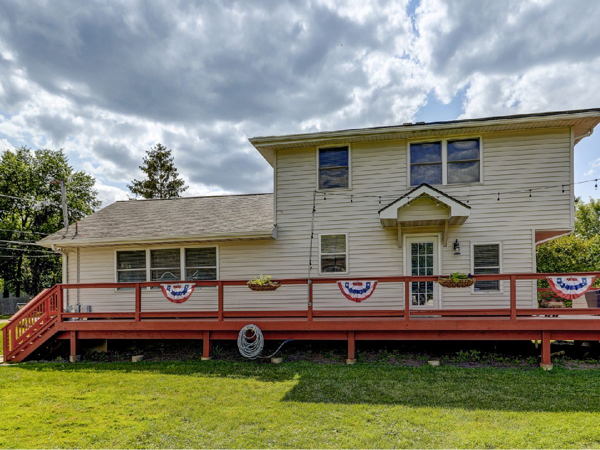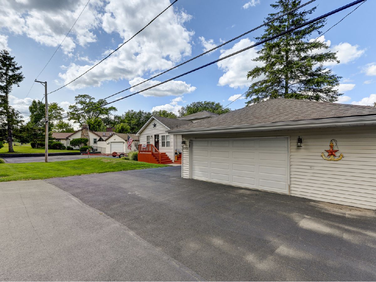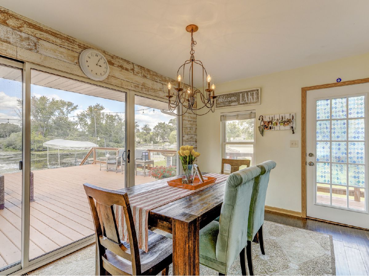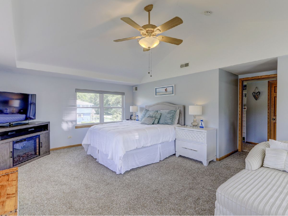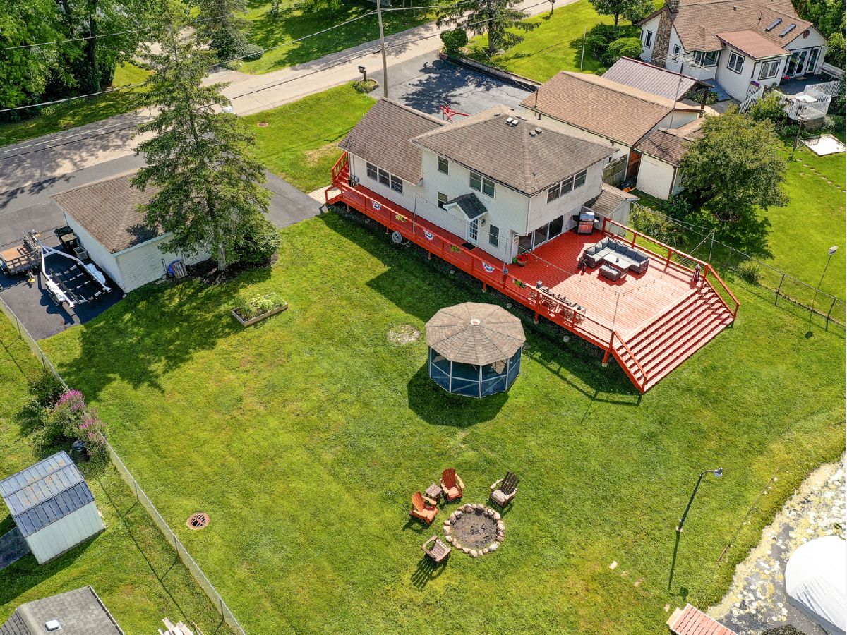 Amazing 2 story waterfront home with 3 bedrooms, 2 full baths, 2.5 car garage and full basement. Property sits on a double lot with 100 ft of frontage on wide channel that leads into Bluff Lake, Petite Lake and Fox Lake. Image waking up to the sound of nature sitting on your beautiful deck watching the fish jump out of the water, hearing the birds chirping and seeing the beautiful birds including the Pelicans in early Spring. Inside you will love the nice updates the home has to offer including hardwood floors in the kitchen with SS appliances, living room with volume ceiling and wood beams and large eating area. Main level includes 2 bedrooms and upstairs you will be amazed by the large master suite w/expansive windows overlooking the Lake with huge walk in closet and brand new updated master bathroom w/all new flooring, faucet, toilet, vanity and shower with nice lighting etc. Entertain guests on your 30 x 30 wrap around deck or in the gazebo. New features include new sump pump, new driveway (2020), new HVAC (2020), resealed deck (2021), new front porch (2021), new master bathroom (2022). Newer dock/boat pier, storage shed, fire pit and more. Move in ready and in time to enjoy the rest of the Summer.