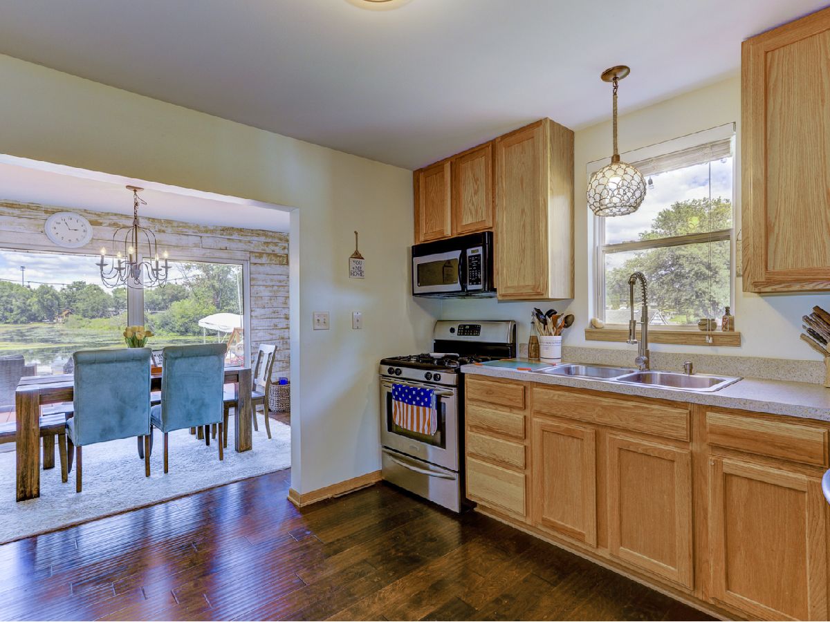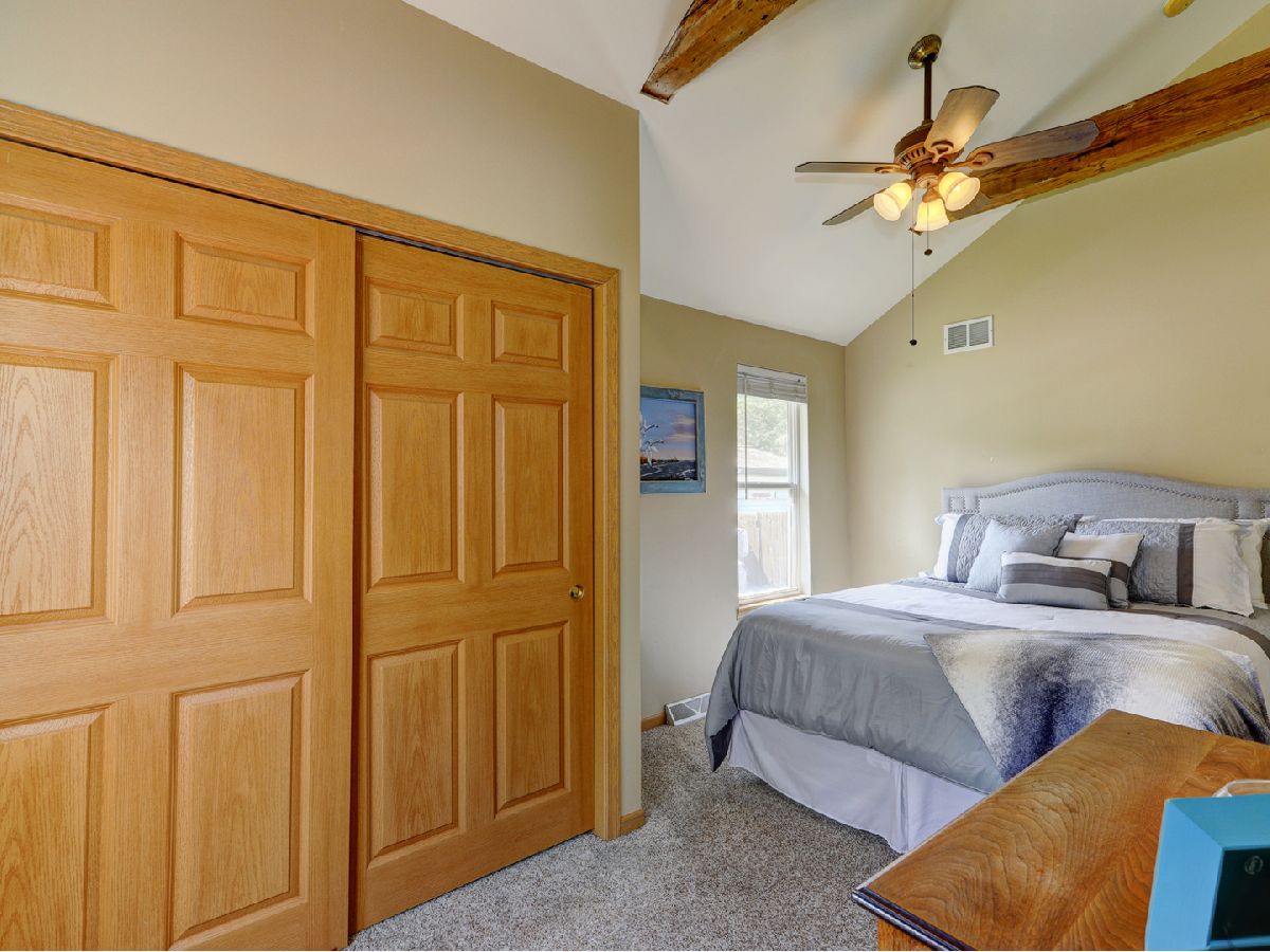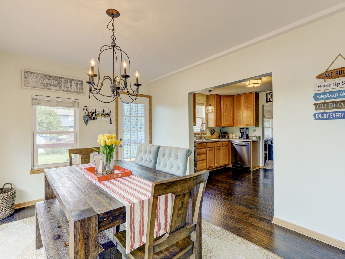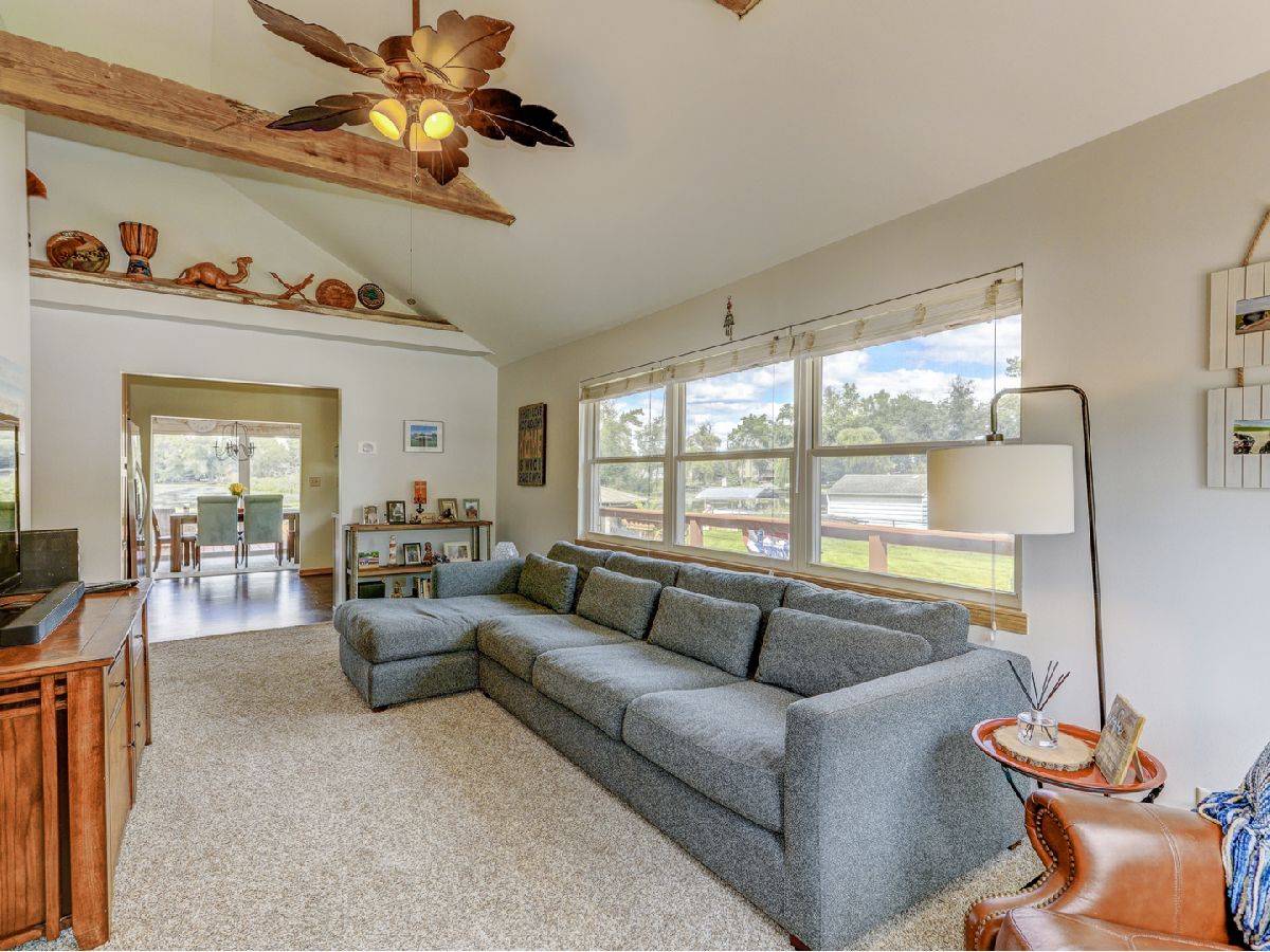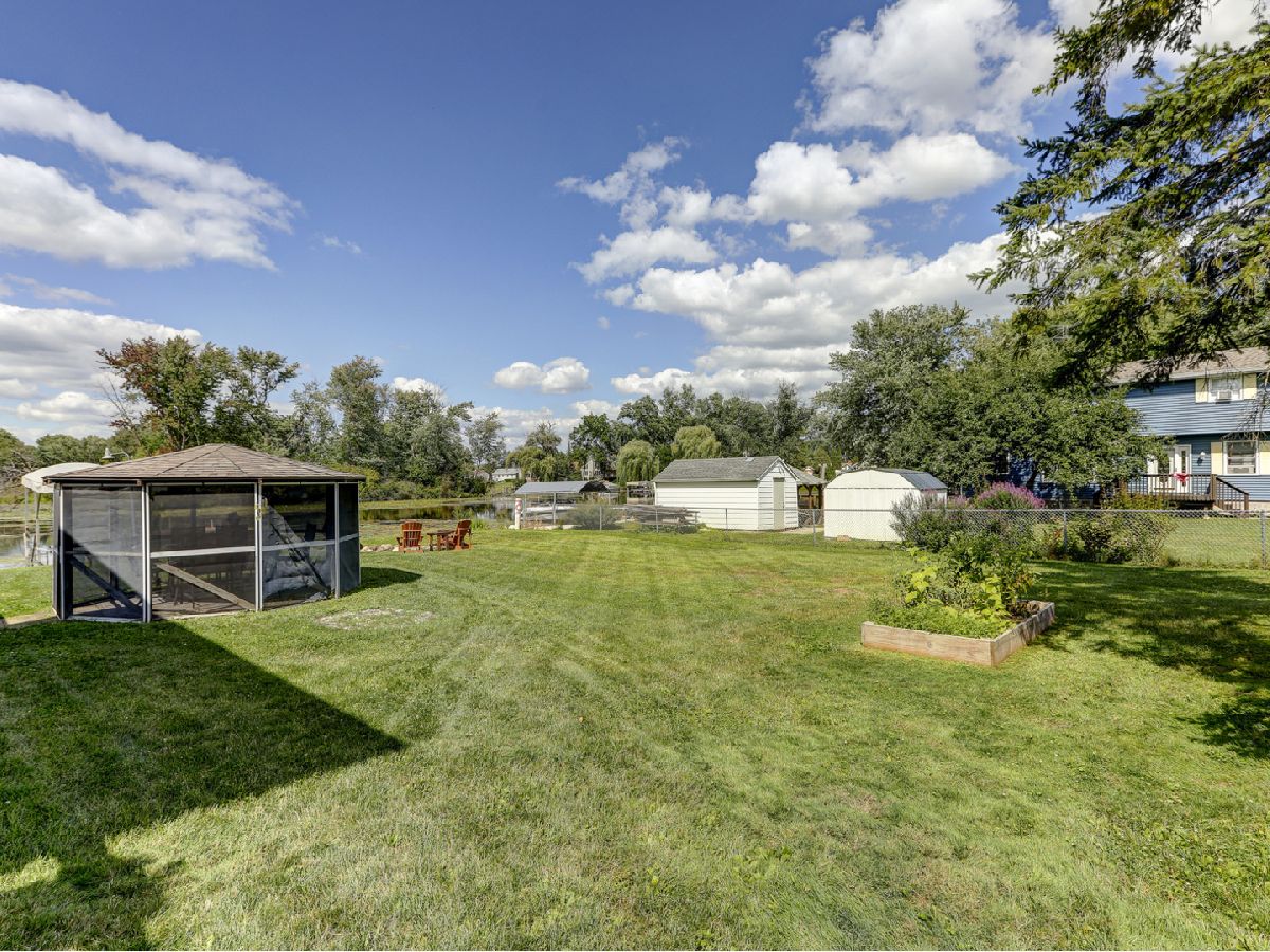 Amazing 2 story waterfront home with 3 bedrooms, 2 full baths, 2.5 car garage and full basement. Property sits on a double lot with 100 ft of frontage on wide channel that leads into Bluff Lake, Petite Lake and Fox Lake. Image waking up to the sound of nature sitting on your beautiful deck watching the fish jump out of the water, hearing the birds chirping and seeing the beautiful birds including the Pelicans in early Spring. Inside you will love the nice updates the home has to offer including hardwood floors in the kitchen with SS appliances, living room with volume ceiling and wood beams and large eating area. Main level includes 2 bedrooms and upstairs you will be amazed by the large master suite w/expansive windows overlooking the Lake with huge walk in closet and brand new updated master bathroom w/all new flooring, faucet, toilet, vanity and shower with nice lighting etc. Entertain guests on your 30 x 30 wrap around deck or in the gazebo. New features include new sump pump, new driveway (2020), new HVAC (2020), resealed deck (2021), new front porch (2021), new master bathroom (2022). Newer dock/boat pier, storage shed, fire pit and more. Move in ready and in time to enjoy the rest of the Summer.