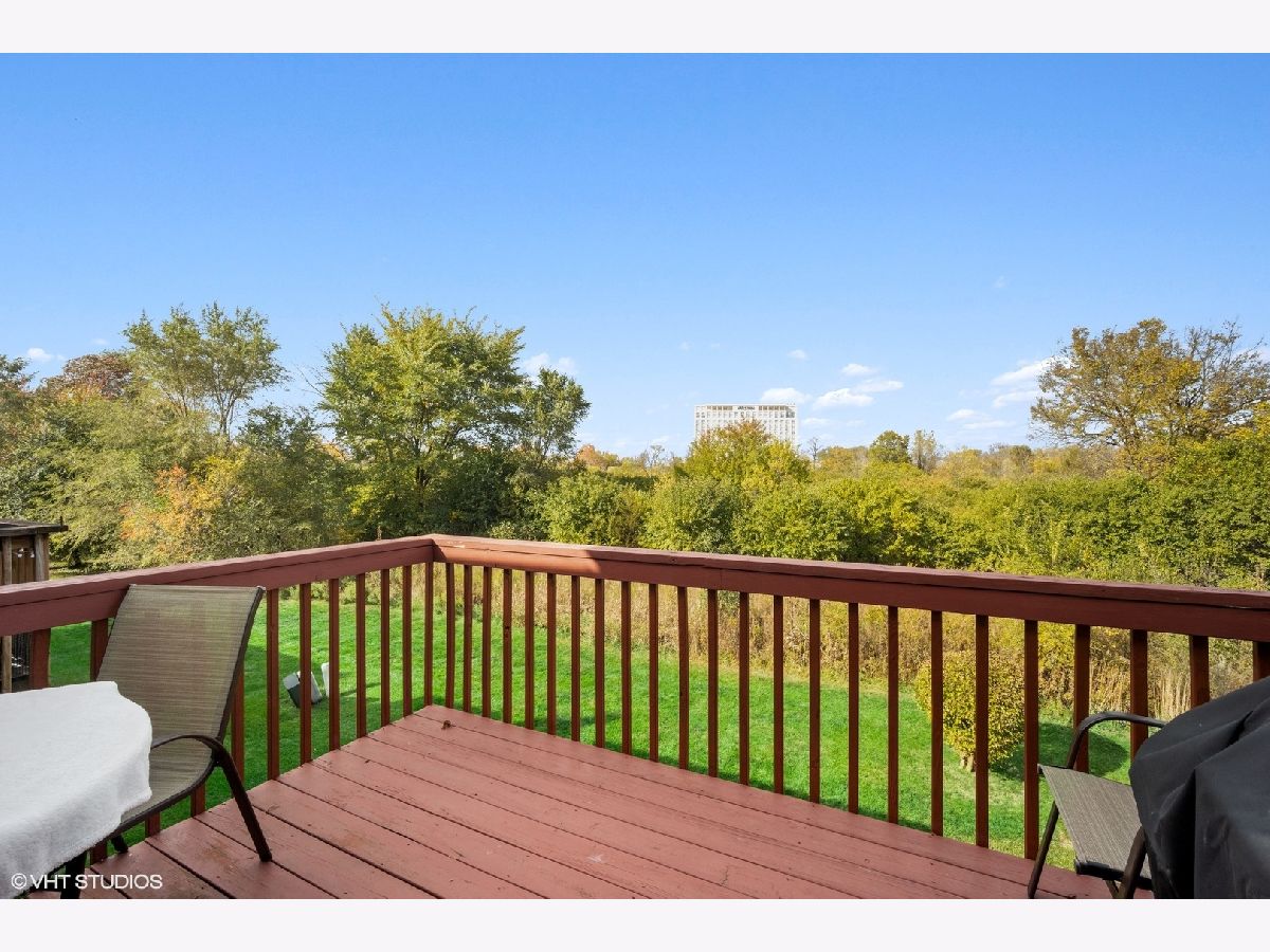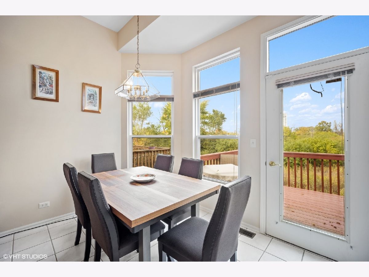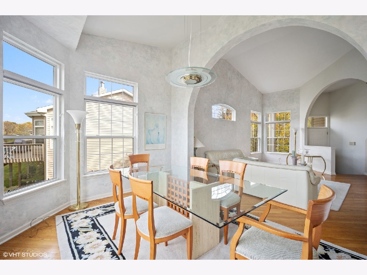 Spacious, sunny end-unit townhome nestled along a stunning forest preserve backdrop. The main floor boasts hardwood flooring, recessed lighting, soaring vaulted ceilings, dramatic curved archways and a fireplace as the centerpiece of a circular flowing floorplan. Highlights include the bright and airy living room, separate dining room and kitchen featuring stainless appliances, granite counters and plentiful cabinet space, with eating area that opens to the deck overlooking the woods. It is only a few steps up to a full bath and bedroom, plus the primary bedroom suite, featuring skylit bath with double sinks and walk-in closet. Both second floor bedrooms feature hardwood flooring. The ground floor family room and convenient bedroom with full bath overlook a lovely paver patio and the delightful natural scenery. Laundry room and attached 2-car garage with expansive storage and entry to ground floor of unit. Perfect location near shopping, dining and transportation.