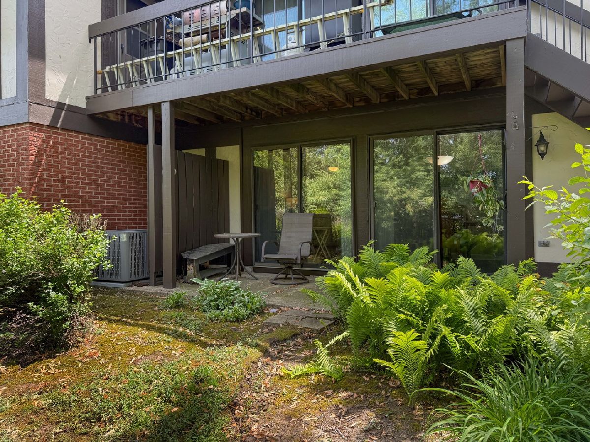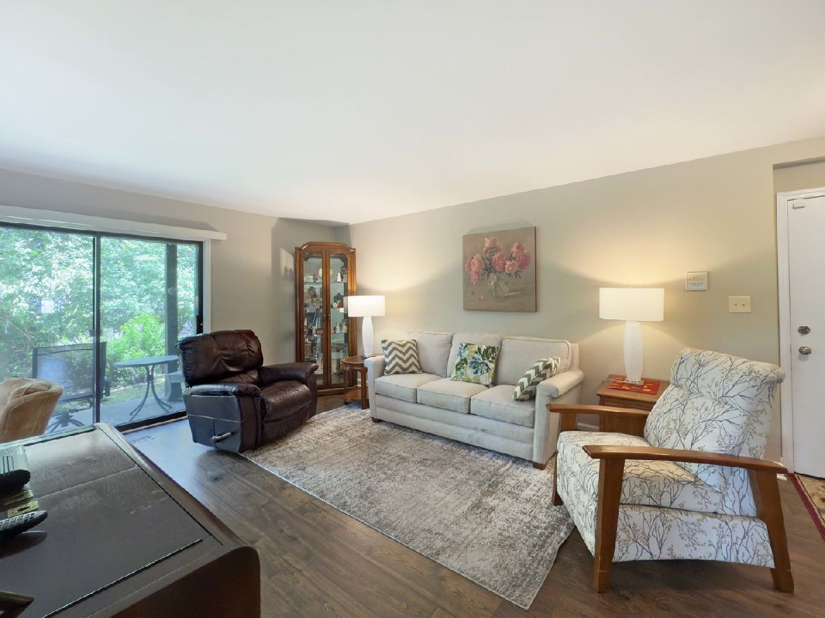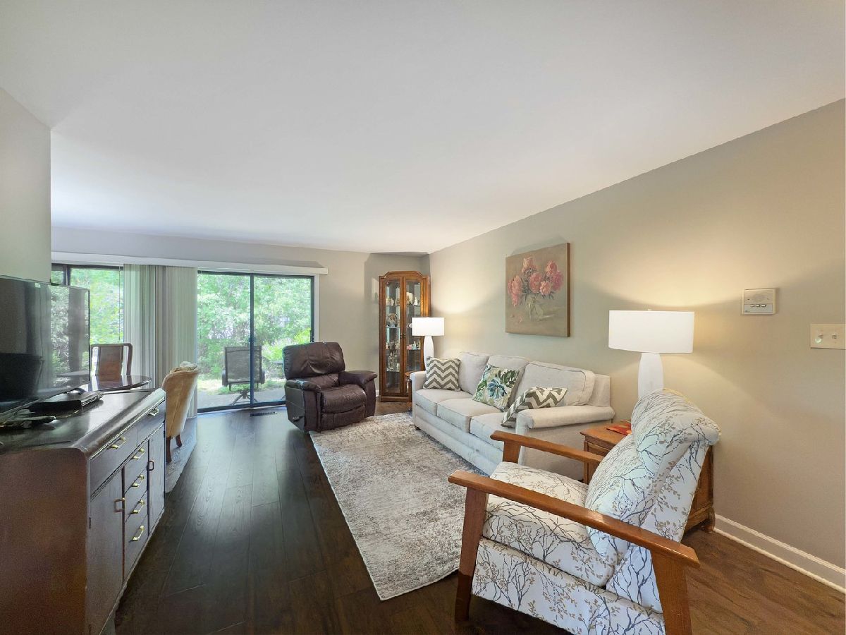 Beautiful first floor ranch features beautiful views and lots of windows to let in light and fresh air. Newer vinyl plank flooring and neutral decor in the living and dining rooms, sunny eat-in kitchen features stylish cabinets and a large pantry closet. Remodeled bath has a walk-in shower with grab bars. Spacious primary bedroom with walk-in closet, half bath, and windows on two walls. Laundry in unit and attached garage (with new garage door opener) for convenience and security. Double sliding doors open to patio and beautiful wooded view with babbling brook. New furnace and central air 2022. Home is in good condition but to be sold As-Is. You're home!
