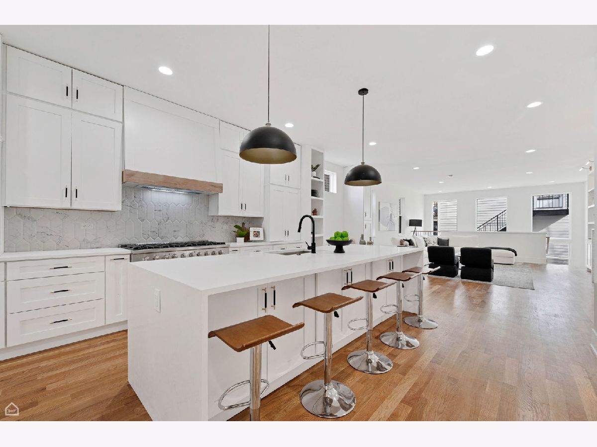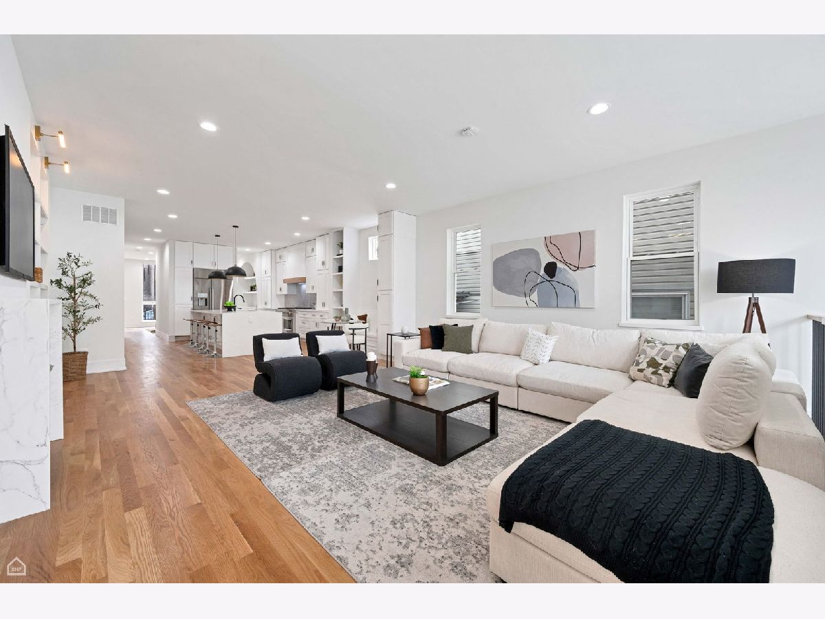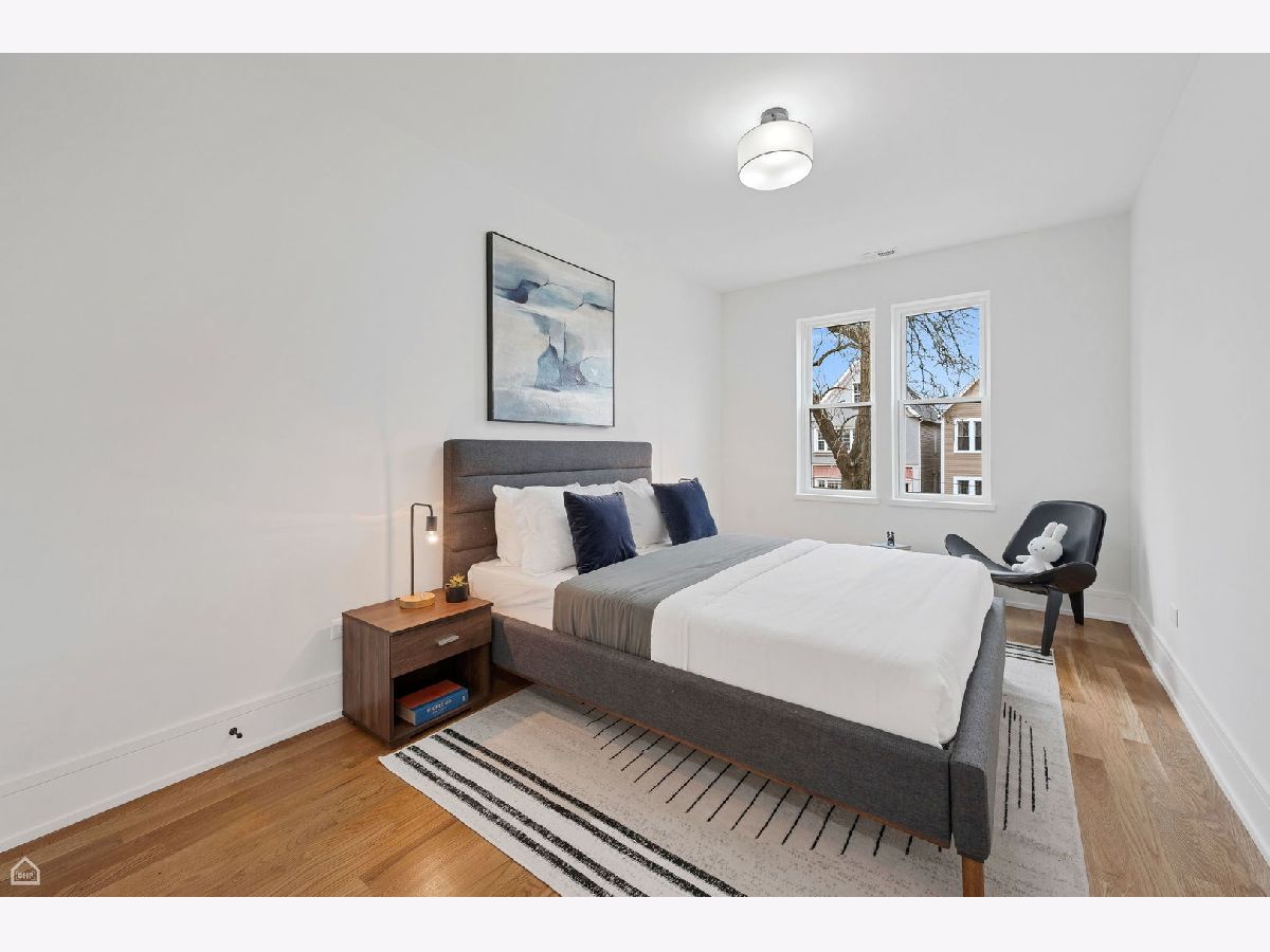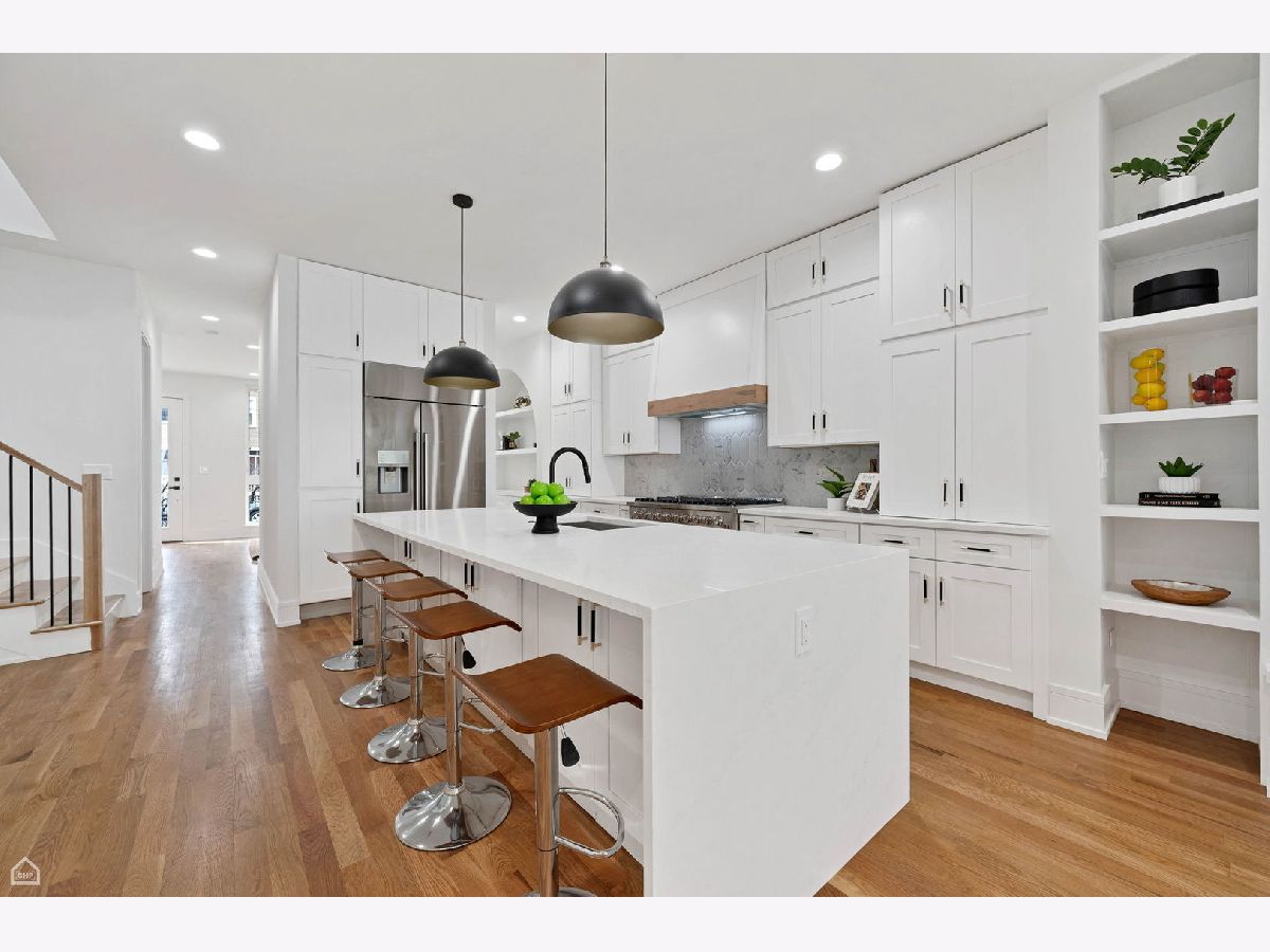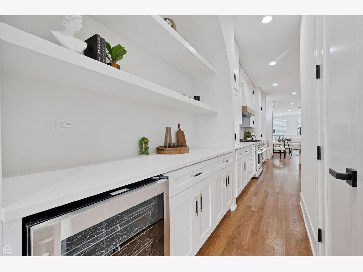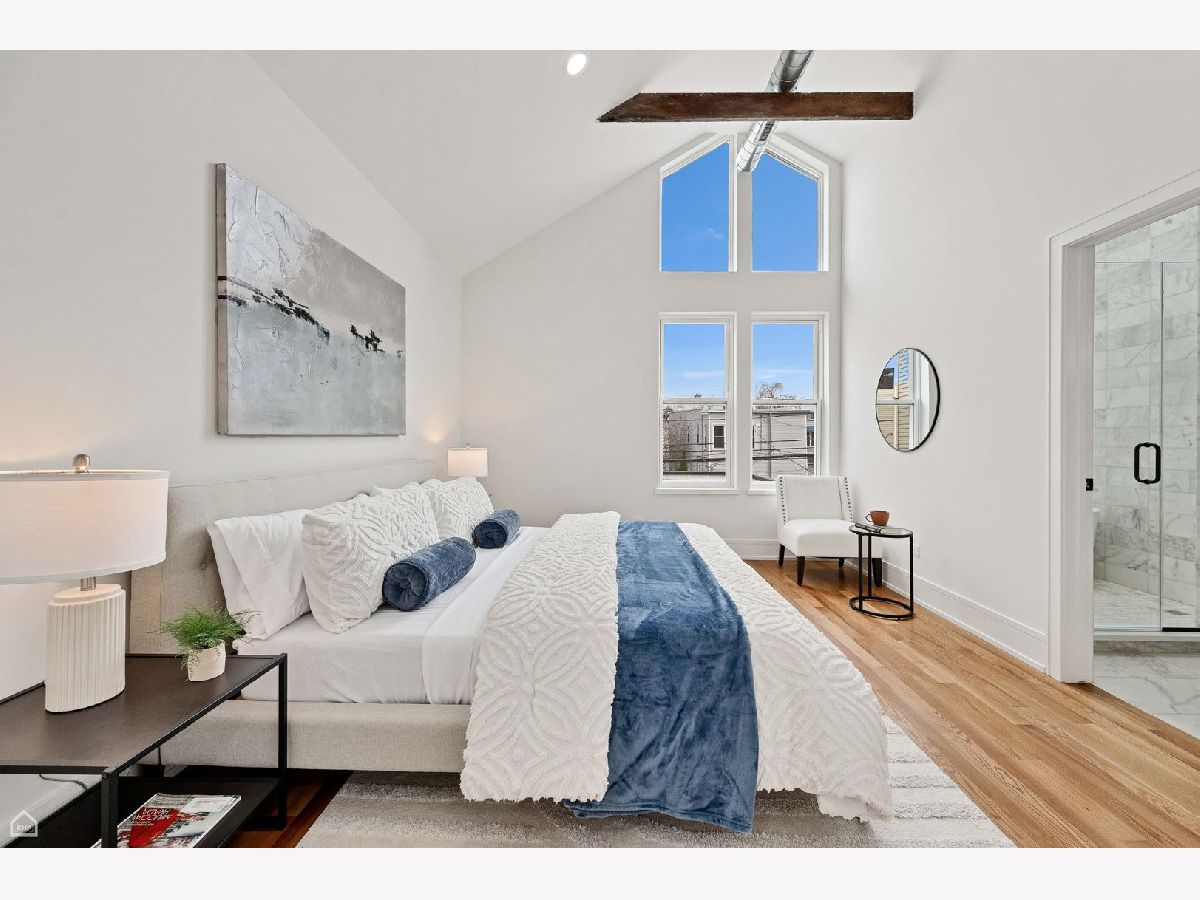 Experience the perfect blend of modern design and classic details in this fully renovated 6 bedroom, 3.1 bathroom single family home, ideally located on a tree lined street in Bucktown. The main level features soaring ceilings, white oak hardwood floors, and custom millwork. A gas fireplace with a sleek quartz surround and arched built-ins anchors the dining area, while oversized windows fill the space with natural light. The chef's kitchen is outfitted with double stacked custom cabinetry, a wood wrapped hood, high end appliances, and a 5-foot wide waterfall island. It opens to a spacious living area with a built-in entertainment center and a second fireplace. Upstairs, the primary suite impresses with vaulted ceilings, a large dressing room, and a spa-like bath with floor-to-ceiling Calacatta marble, soaking tub, rain shower, and double vanity. Three additional bedrooms and a full laundry room with custom cabinetry complete the level. The fully finished lower level offers endless possibilities with tall ceilings, a spacious recreation room featuring a stylish wet bar with quartz countertops and a wine fridge. Two additional bedrooms and a full bathroom make this level perfect for guests, a home office, or a workout space. Outdoor living is just as inviting, with a private garage rooftop deck and pergola perfect for entertaining. A mudroom off the back entrance and a 2 car garage add functionality, while dual zone HVAC ensures year round comfort. Located just minutes from Bucktown's top restaurants, shopping, and public transit, this home delivers an unbeatable combination of luxury and convenience. Don't miss the opportunity to make it yours!