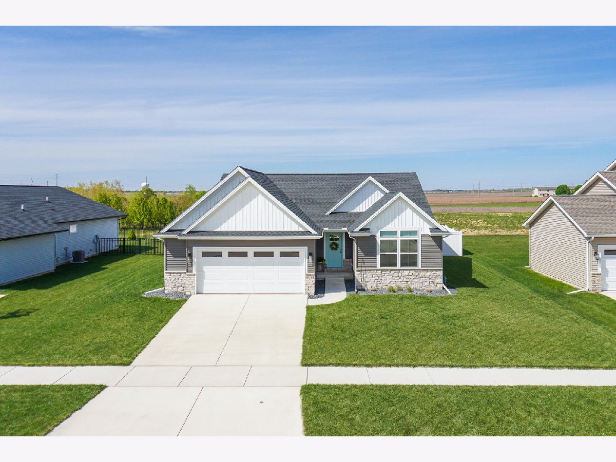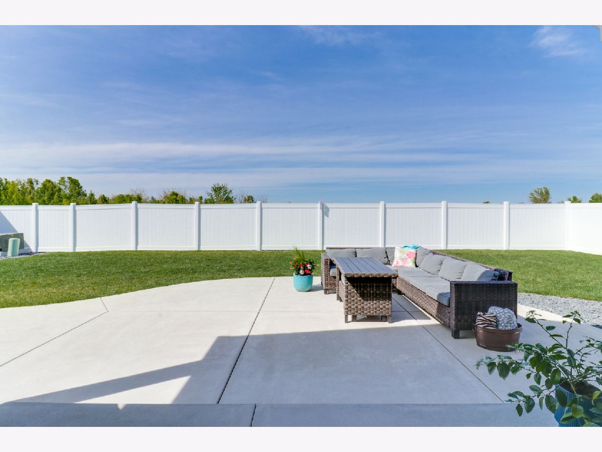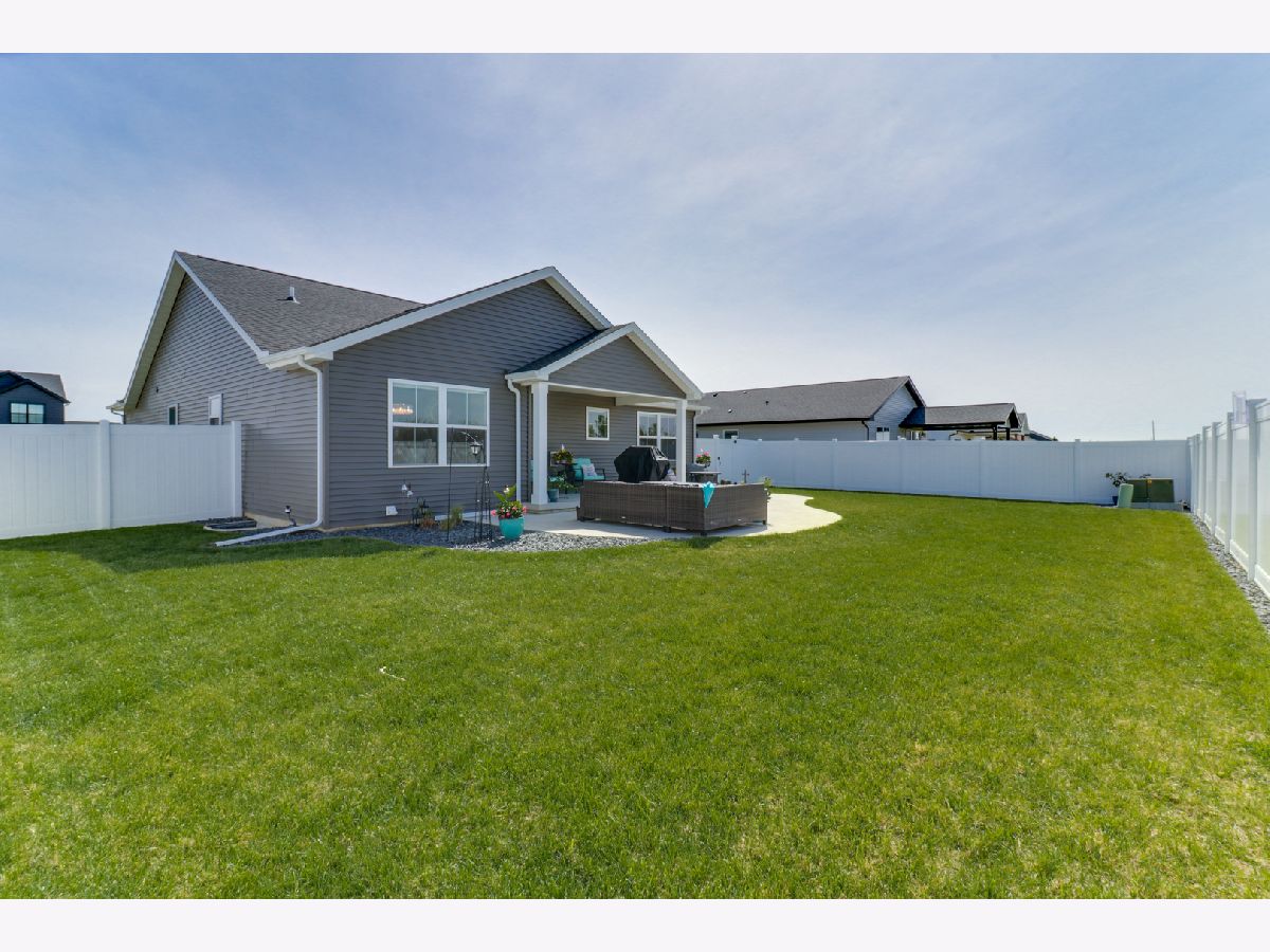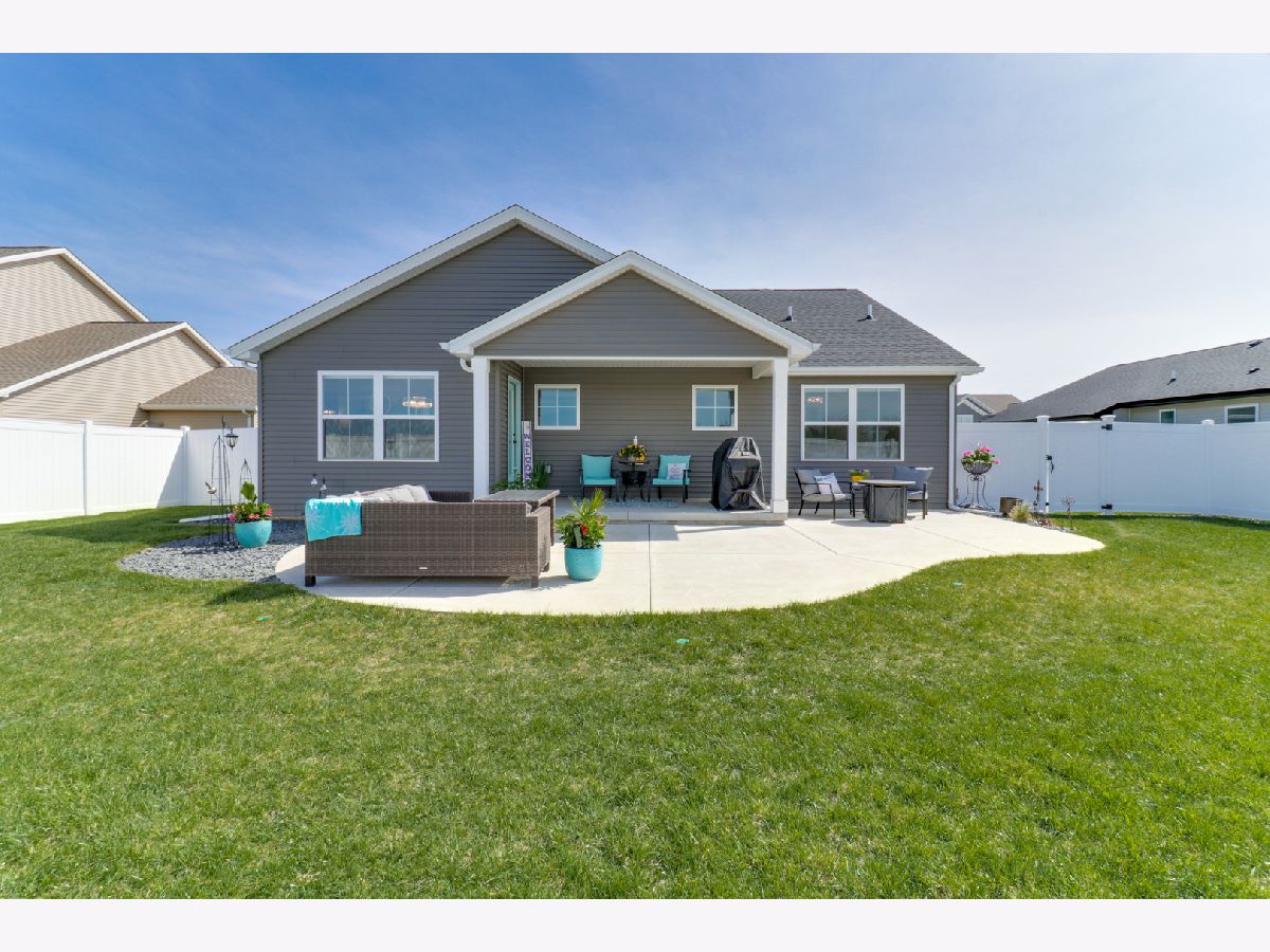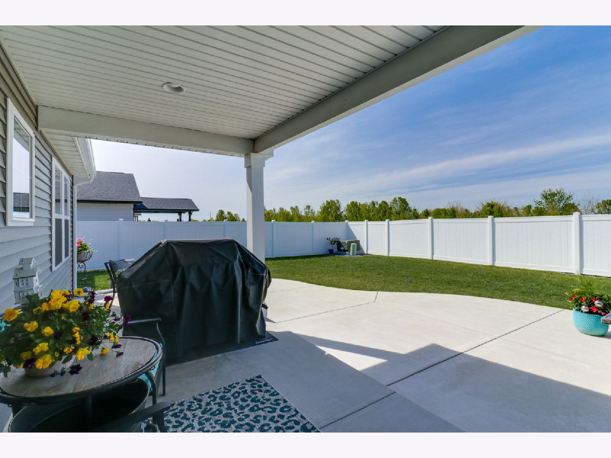 Welcome to the elegant Blackstone Trails subdivision, where this delightful three-year-young ranch-style home awaits. This home offers a perfect blend of modern comfort and serene surroundings. Step inside to discover a spacious living area adorned with sparkling upgraded lighting fixtures and professionally installed window coverings, setting the contemporary tone found throughout. In the heart of the home, the modern kitchen beckons with sleek quartz countertops, stainless steel appliances, and ample cabinet space. A center island doubles as a convenient breakfast bar, offering additional workspace and seating for casual meals. The open floor plan seamlessly connects the kitchen to the dining area and living room, including the fireplace. The master suite awaits, boasting a walk-in closet and en-suite complete with a tiled shower and dual vanity LED mirrors and sinks. Two additional bedrooms on the main level share a full bathroom, ensuring comfort and convenience for all. Gorgeous hardwood floors throughout the main level add a touch of warmth and sophistication. Venture downstairs to the unfinished basement with a finished full bath, reverse osmosis system, and installed water softener; pre-framed for future expansion, including a potential bedroom and family room. Experience serene outdoor living in this spacious backyard, featuring a vinyl white fence, a partially covered patio with an extended addition, and the privacy of currently having no backyard neighbors-perfect for tranquil relaxation or entertaining.