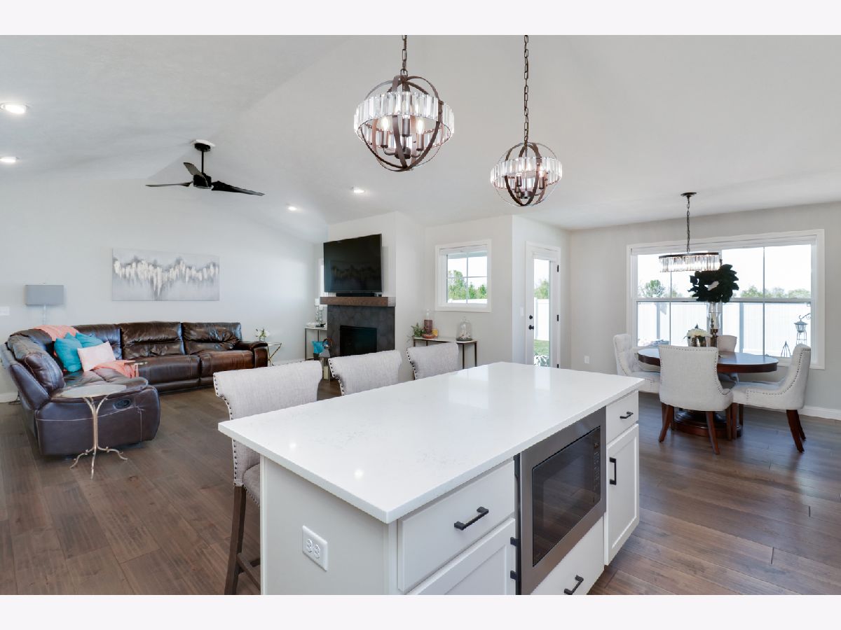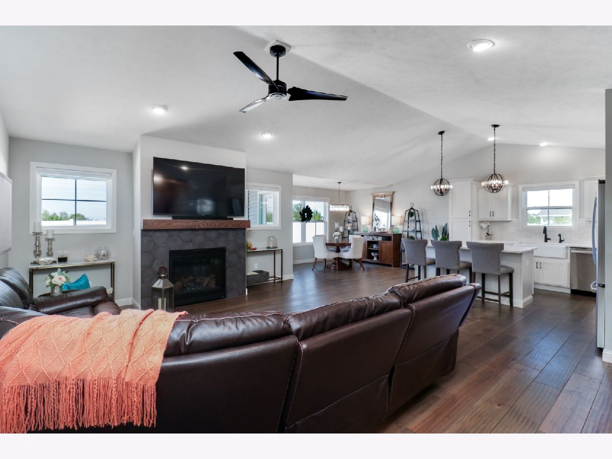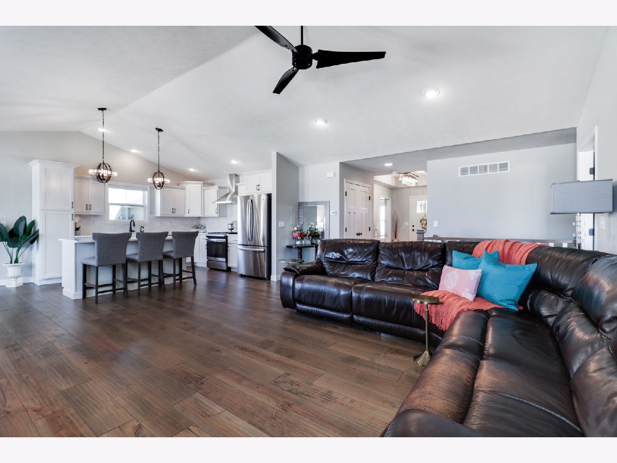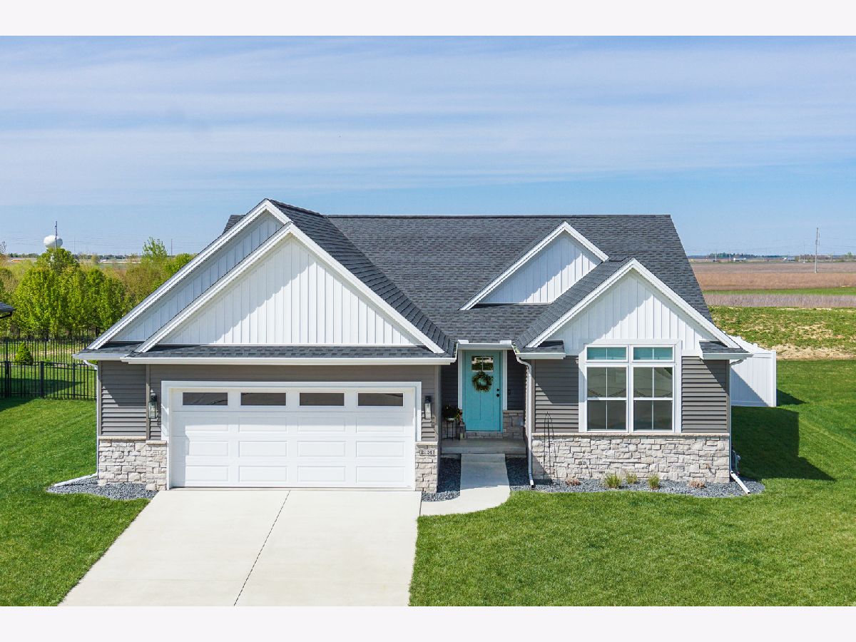Welcome to the elegant Blackstone Trails subdivision, where this delightful three-year-young ranch-style home awaits. This home offers a perfect blend of modern comfort and serene surroundings. Step inside to discover a spacious living area adorned with sparkling upgraded lighting fixtures and professionally installed window coverings, setting the contemporary tone found throughout. In the heart of the home, the modern kitchen beckons with sleek quartz countertops, stainless steel appliances, and ample cabinet space. A center island doubles as a convenient breakfast bar, offering additional workspace and seating for casual meals. The open floor plan seamlessly connects the kitchen to the dining area and living room, including the fireplace. The master suite awaits, boasting a walk-in closet and en-suite complete with a tiled shower and dual vanity LED mirrors and sinks. Two additional bedrooms on the main level share a full bathroom, ensuring comfort and convenience for all. Gorgeous hardwood floors throughout the main level add a touch of warmth and sophistication. Venture downstairs to the unfinished basement with a finished full bath, reverse osmosis system, and installed water softener; pre-framed for future expansion, including a potential bedroom and family room. Experience serene outdoor living in this spacious backyard, featuring a vinyl white fence, a partially covered patio with an extended addition, and the privacy of currently having no backyard neighbors-perfect for tranquil relaxation or entertaining.