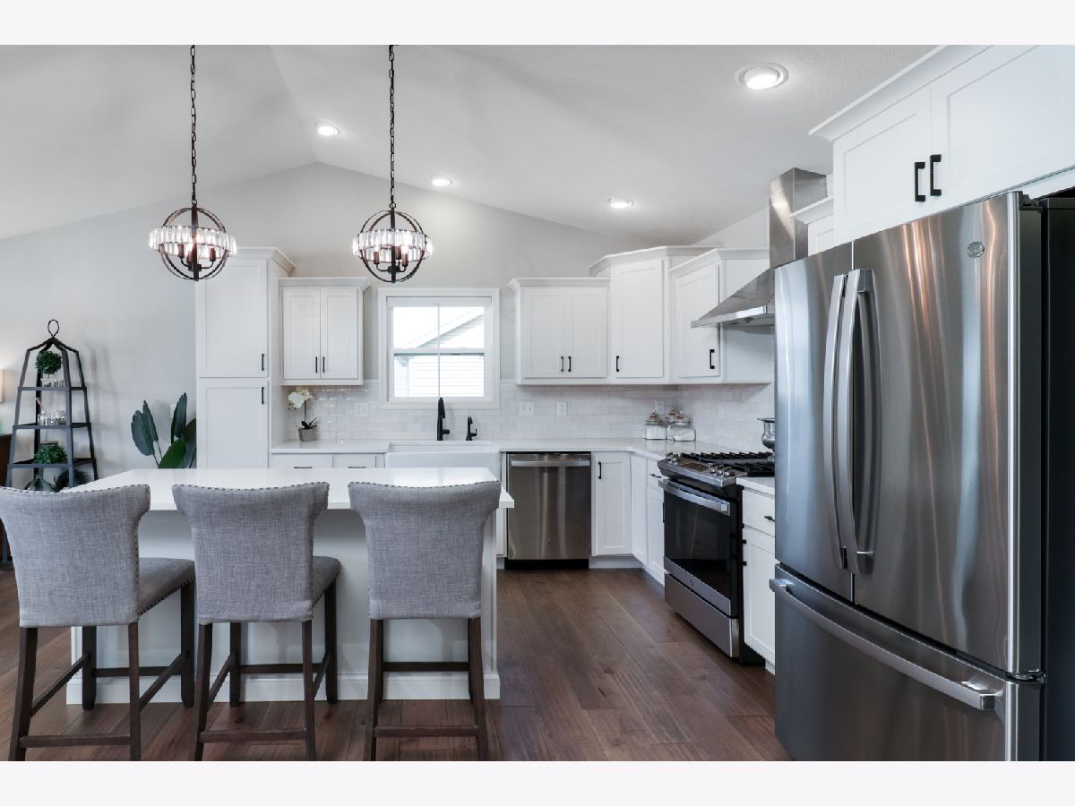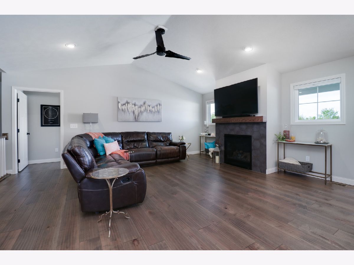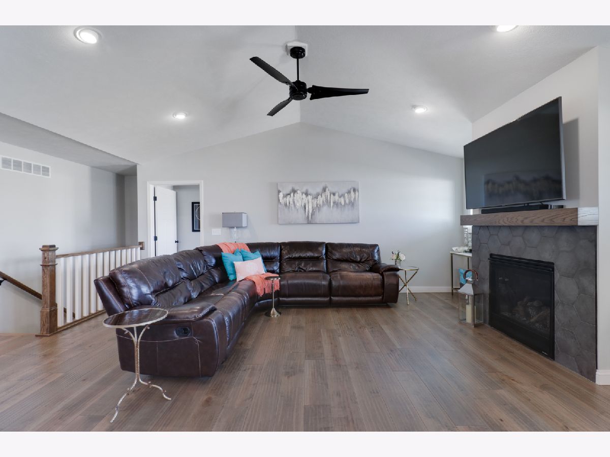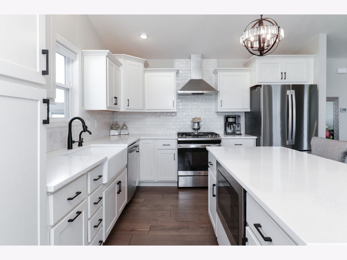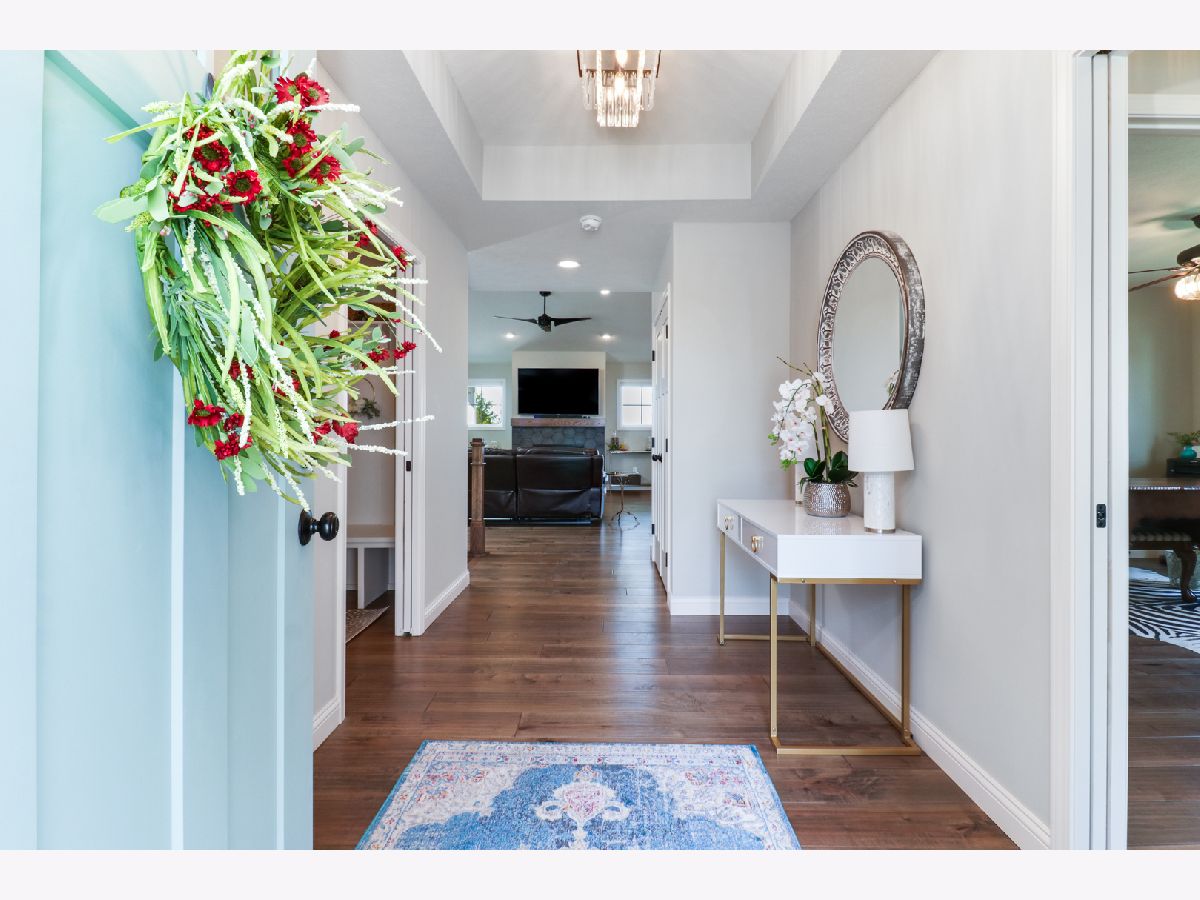 Welcome to the elegant Blackstone Trails subdivision, where this delightful three-year-young ranch-style home awaits. This home offers a perfect blend of modern comfort and serene surroundings. Step inside to discover a spacious living area adorned with sparkling upgraded lighting fixtures and professionally installed window coverings, setting the contemporary tone found throughout. In the heart of the home, the modern kitchen beckons with sleek quartz countertops, stainless steel appliances, and ample cabinet space. A center island doubles as a convenient breakfast bar, offering additional workspace and seating for casual meals. The open floor plan seamlessly connects the kitchen to the dining area and living room, including the fireplace. The master suite awaits, boasting a walk-in closet and en-suite complete with a tiled shower and dual vanity LED mirrors and sinks. Two additional bedrooms on the main level share a full bathroom, ensuring comfort and convenience for all. Gorgeous hardwood floors throughout the main level add a touch of warmth and sophistication. Venture downstairs to the unfinished basement with a finished full bath, reverse osmosis system, and installed water softener; pre-framed for future expansion, including a potential bedroom and family room. Experience serene outdoor living in this spacious backyard, featuring a vinyl white fence, a partially covered patio with an extended addition, and the privacy of currently having no backyard neighbors-perfect for tranquil relaxation or entertaining.