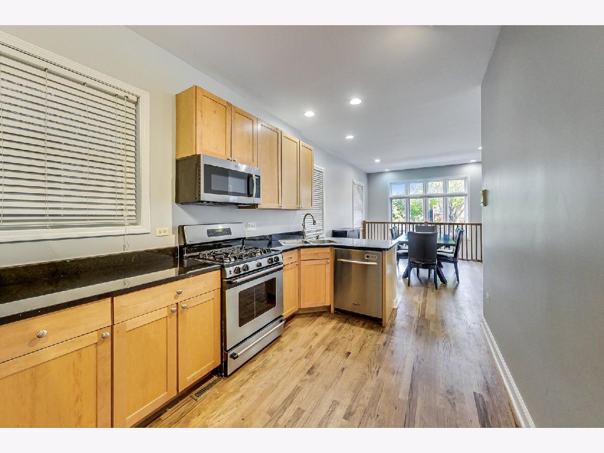 East Avondale advantageously located 3 bedroom, 3 bath duplex down with 2 outdoor living spaces and garage parking. The main level features a bright kitchen open to a flexible living space that is perfect for a dining or living area. The main level also has 2 bedrooms and 2 full bathrooms, including the primary suite, side by side washer/dryer, and recently refinished hardwood floors throughout. The generous primary suite has two sizable walk-in closets, a large bathroom with double vanity and soaking tub, as well as a private balcony. The lower level features a spacious family room with gas fireplace that opens to a private patio and a third bedroom and full bath. In addition to a garage parking space, this unit also features an enormous private storage room. Amazing location by the entrance to the Riverwalk, Metropolitan Brewery, BASH Sports Academy, and all that Avondale has to offer, as well as close to Lane Tech and Roscoe Village .