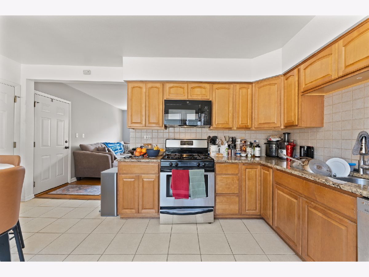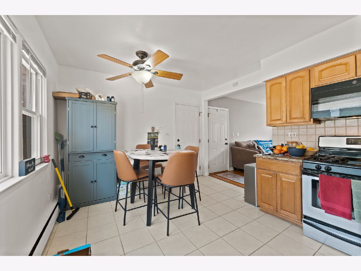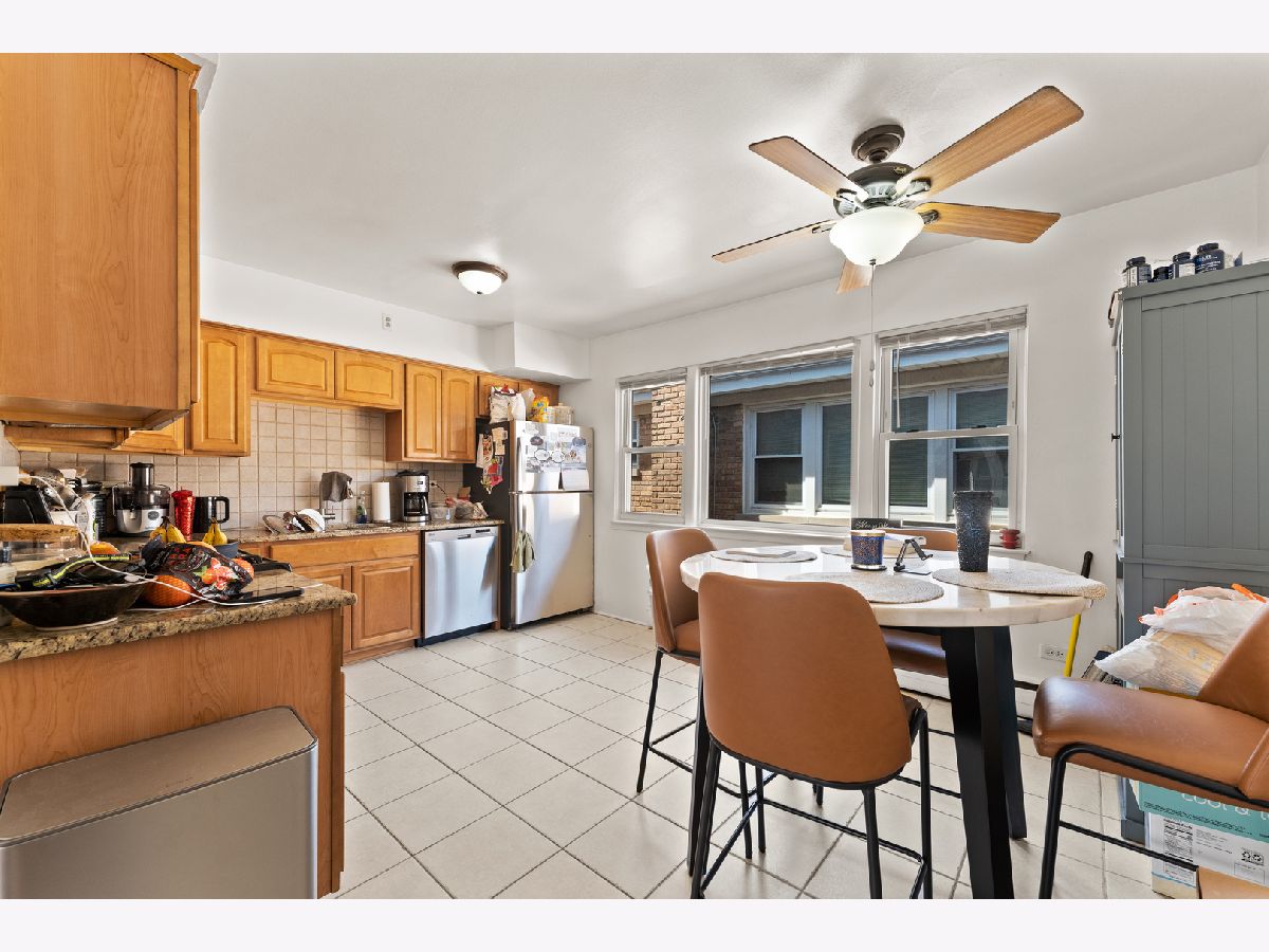 This bright and inviting top floor unit features two generously sized bedrooms and an open layout. The spacious eat-in kitchen has stainless steel appliances, granite countertops, tile flooring, and ample cabinet storage. A nicely updated bathroom and hardwood floors throughout the living room and bedrooms add warmth and charm. Oversized vinyl windows flood the space with natural light. Well-maintained, move-in ready! Enjoy nearby grocery stores, shops, and dining options. Shared laundry facilities are available in the basement. An excellent investment opportunity-rentals allowed! Low monthly HOA covers heat, water, exterior maintenance. Close to Metra and public transportation. A must-see!