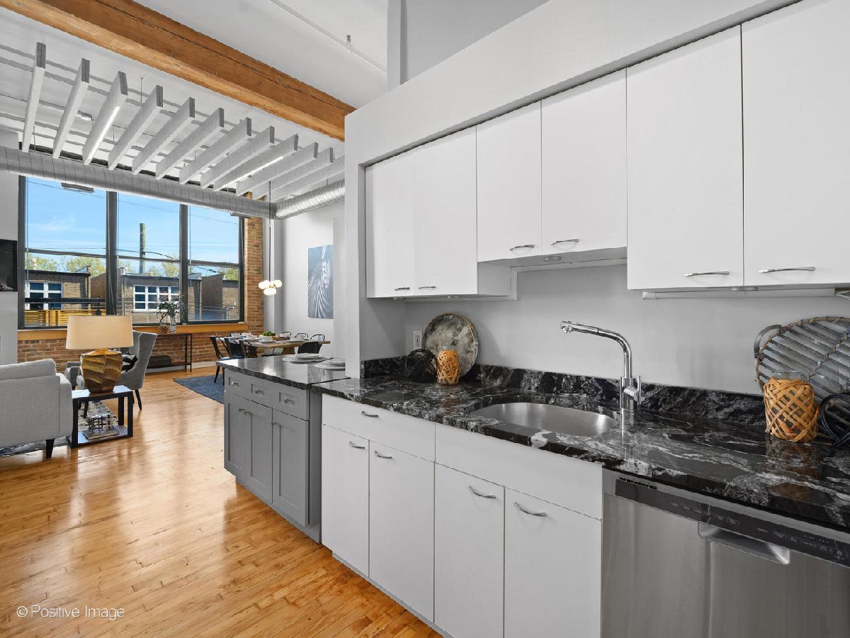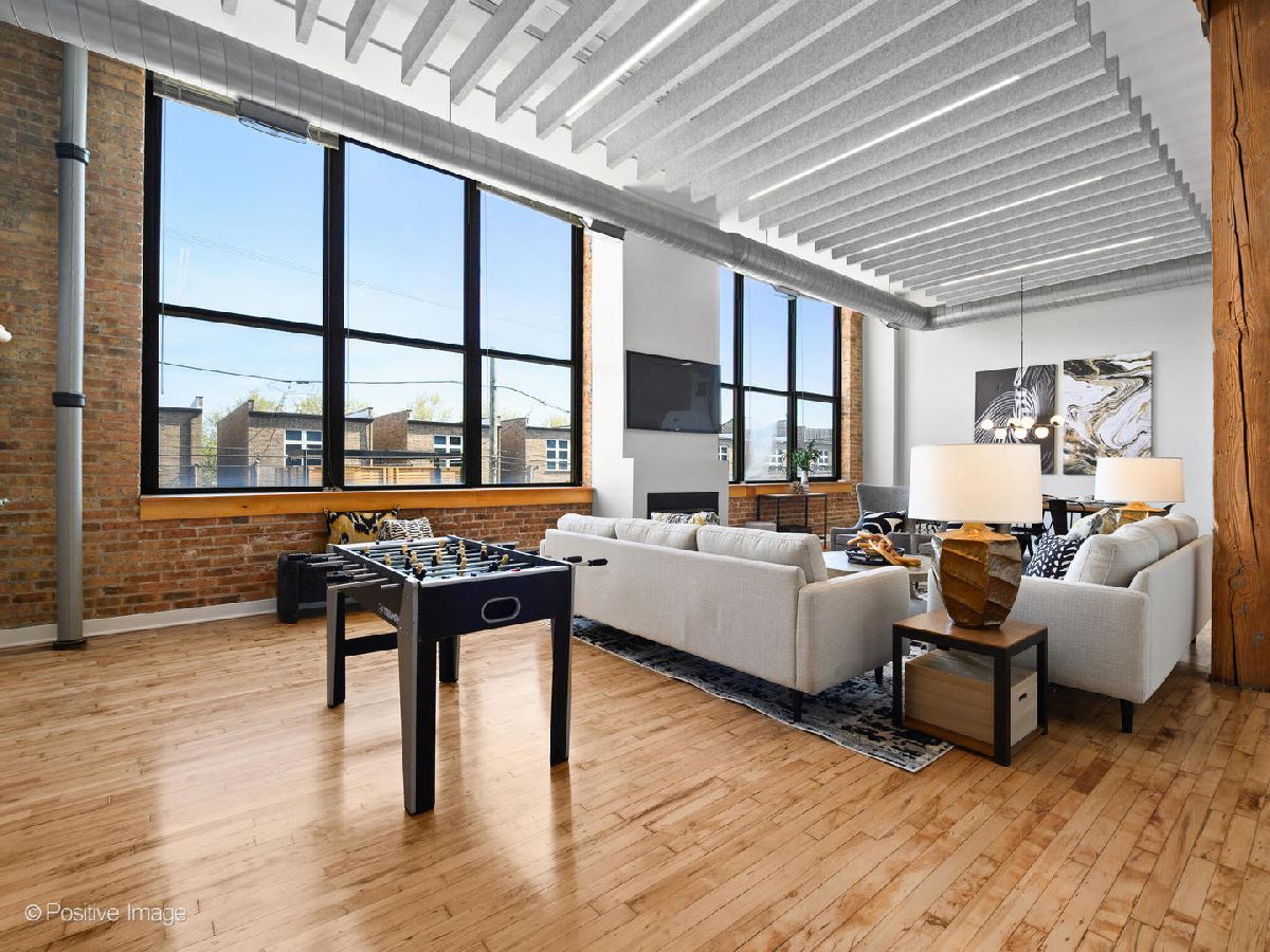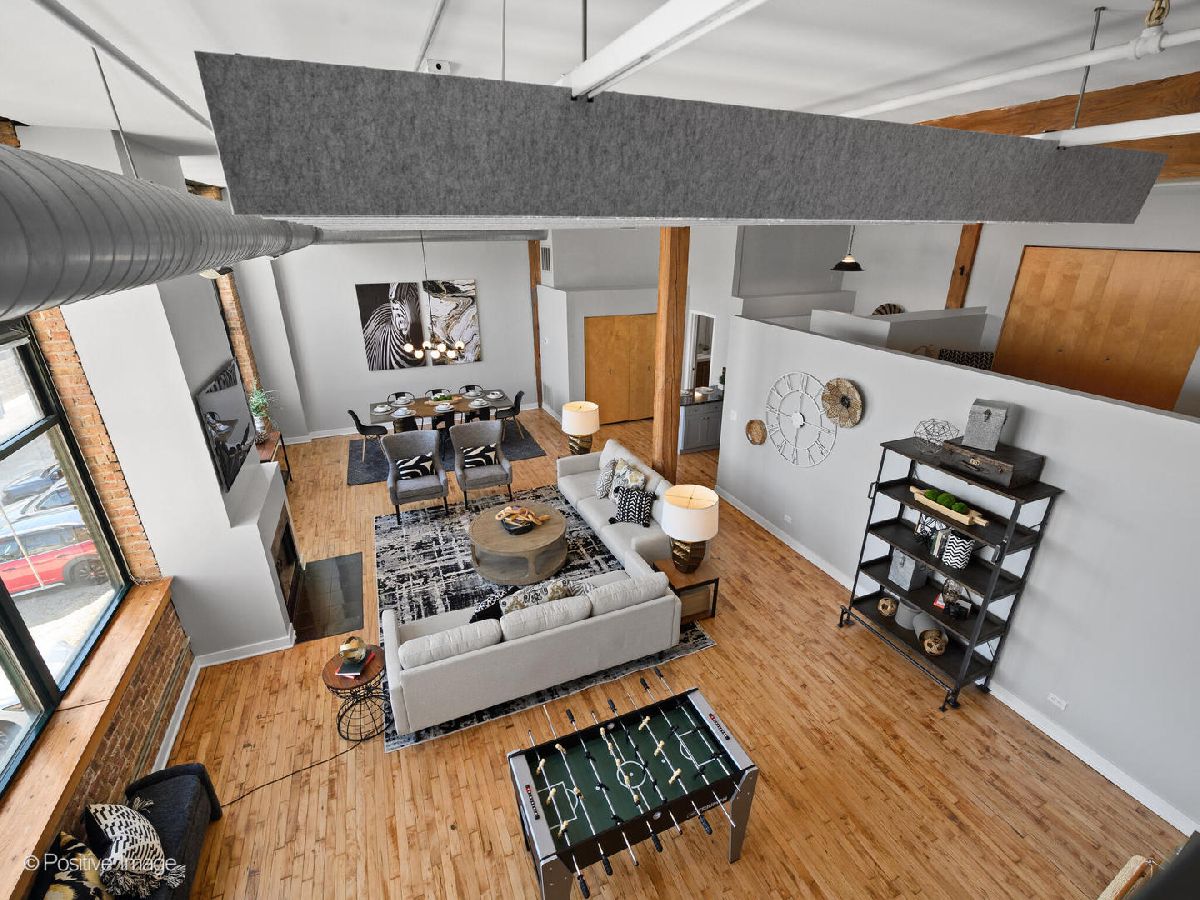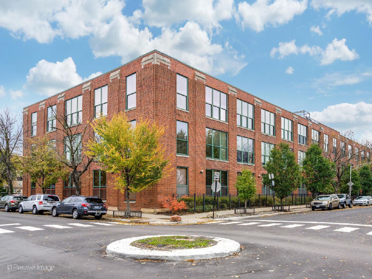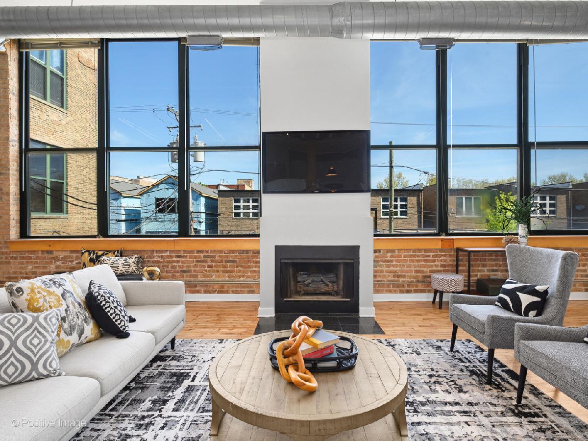 Unique live/work loft in Logan Square! This 2-bedroom + den features over 1700 SQ FT of living space, hardwood floors, 15-foot ceilings, and 2 rows of 10' windows. Step into a large entryway that unfolds into a 700 sq. ft. living and dining space, anchored by a beautifully positioned wood-burning fireplace. The high ceilings have updated light fixtures, fans, and stylish TURF soundproofing. The kitchen features high-end stainless steel appliances, granite countertops, and an eat-in island-perfect for entertaining. The bathroom has been thoughtfully updated with a sleek vanity, complemented by premium Grohe and Kohler fixtures. This unit offers two spacious bedrooms (one enclosed) and an airy loft that could be used as a third bedroom or home office. In-unit laundry, central heating and air, ample closet and storage space, and one exterior parking space complete the home. Fantastic Logan Square location just a block off Milwaukee Avenue, 2 blocks to the blue line and easy highway access. Agora grocery, restaurants, coffee, parks & shopping are all within walking distance.
