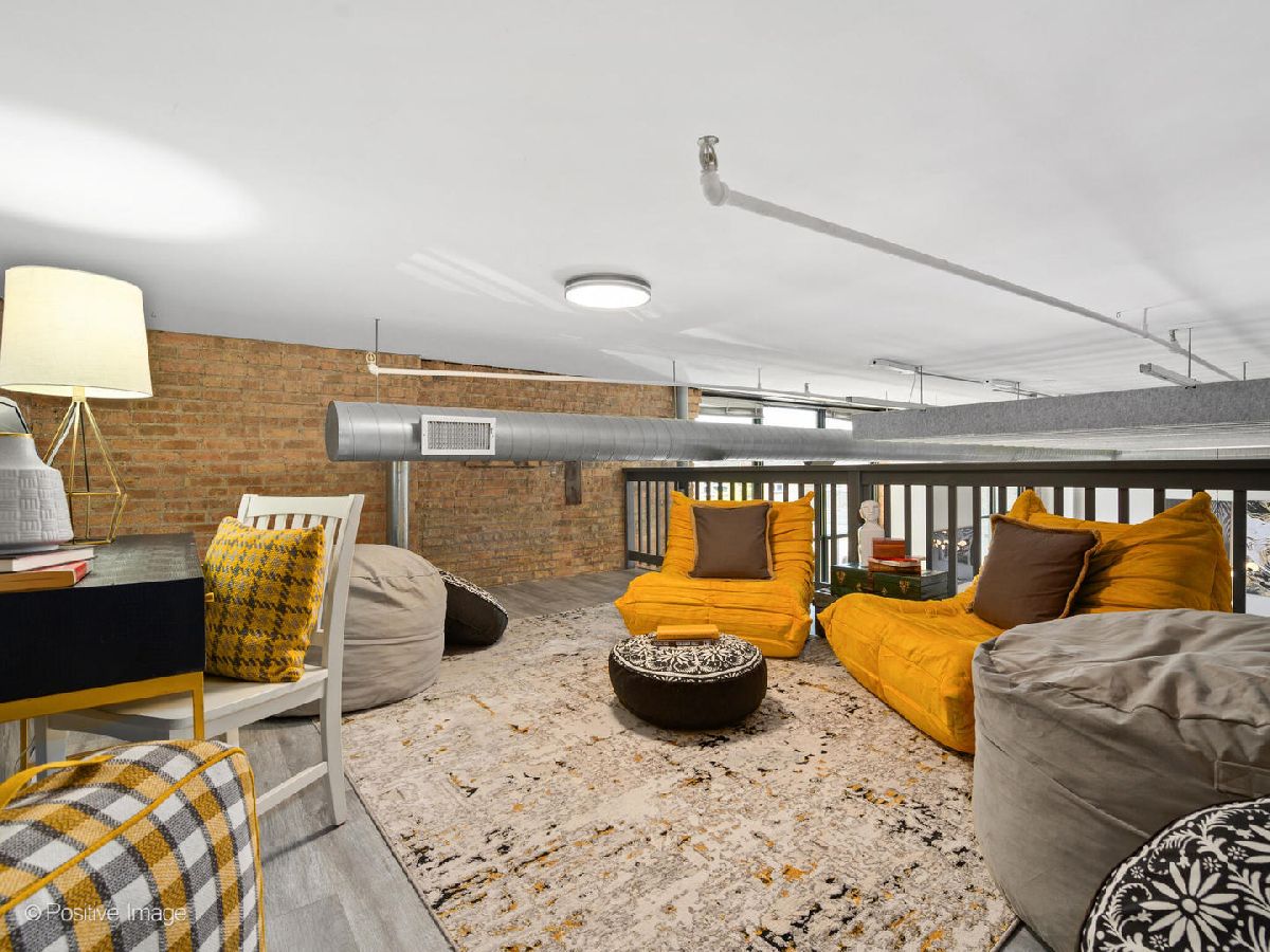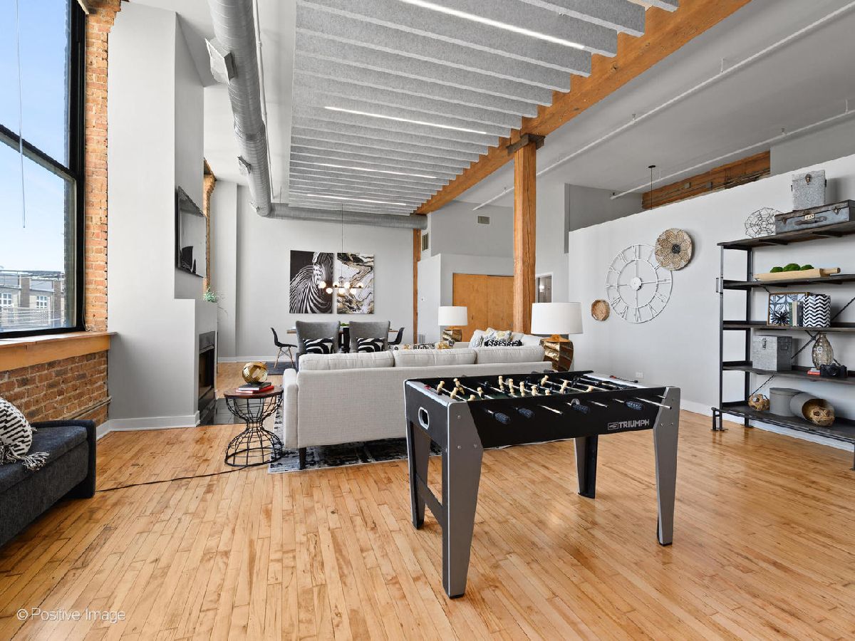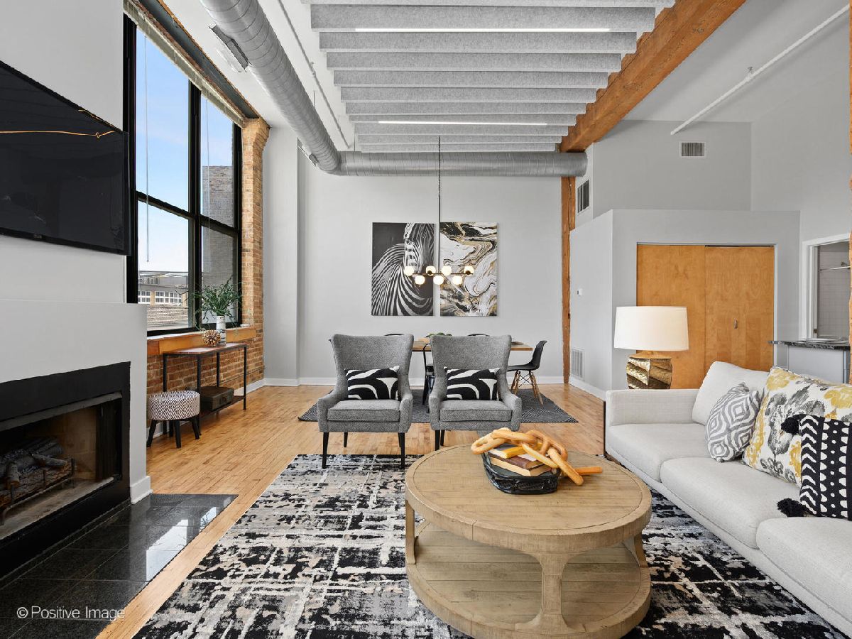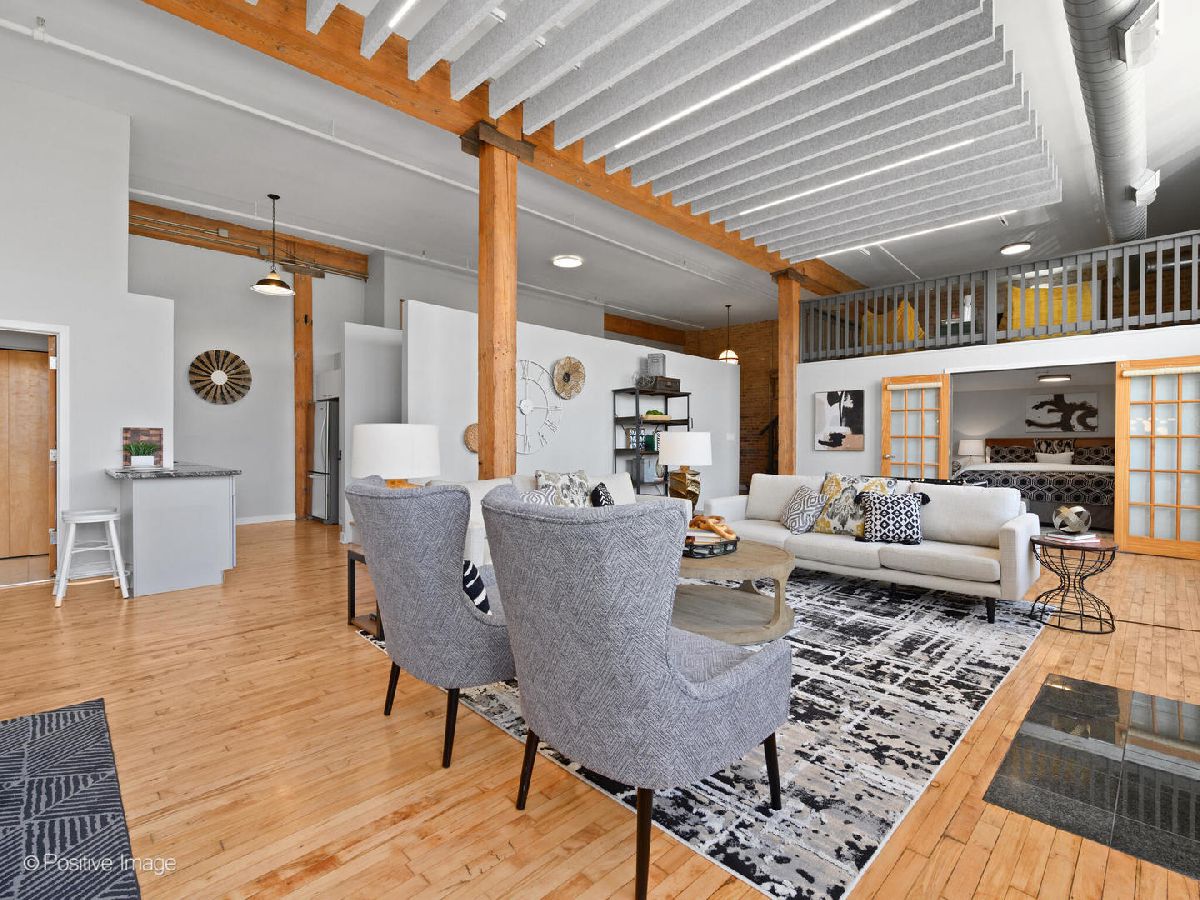 Unique live/work loft in Logan Square! This 2-bedroom + den features over 1700 SQ FT of living space, hardwood floors, 15-foot ceilings, and 2 rows of 10' windows. Step into a large entryway that unfolds into a 700 sq. ft. living and dining space, anchored by a beautifully positioned wood-burning fireplace. The high ceilings have updated light fixtures, fans, and stylish TURF soundproofing. The kitchen features high-end stainless steel appliances, granite countertops, and an eat-in island-perfect for entertaining. The bathroom has been thoughtfully updated with a sleek vanity, complemented by premium Grohe and Kohler fixtures. This unit offers two spacious bedrooms (one enclosed) and an airy loft that could be used as a third bedroom or home office. In-unit laundry, central heating and air, ample closet and storage space, and one exterior parking space complete the home. Fantastic Logan Square location just a block off Milwaukee Avenue, 2 blocks to the blue line and easy highway access. Agora grocery, restaurants, coffee, parks & shopping are all within walking distance.
