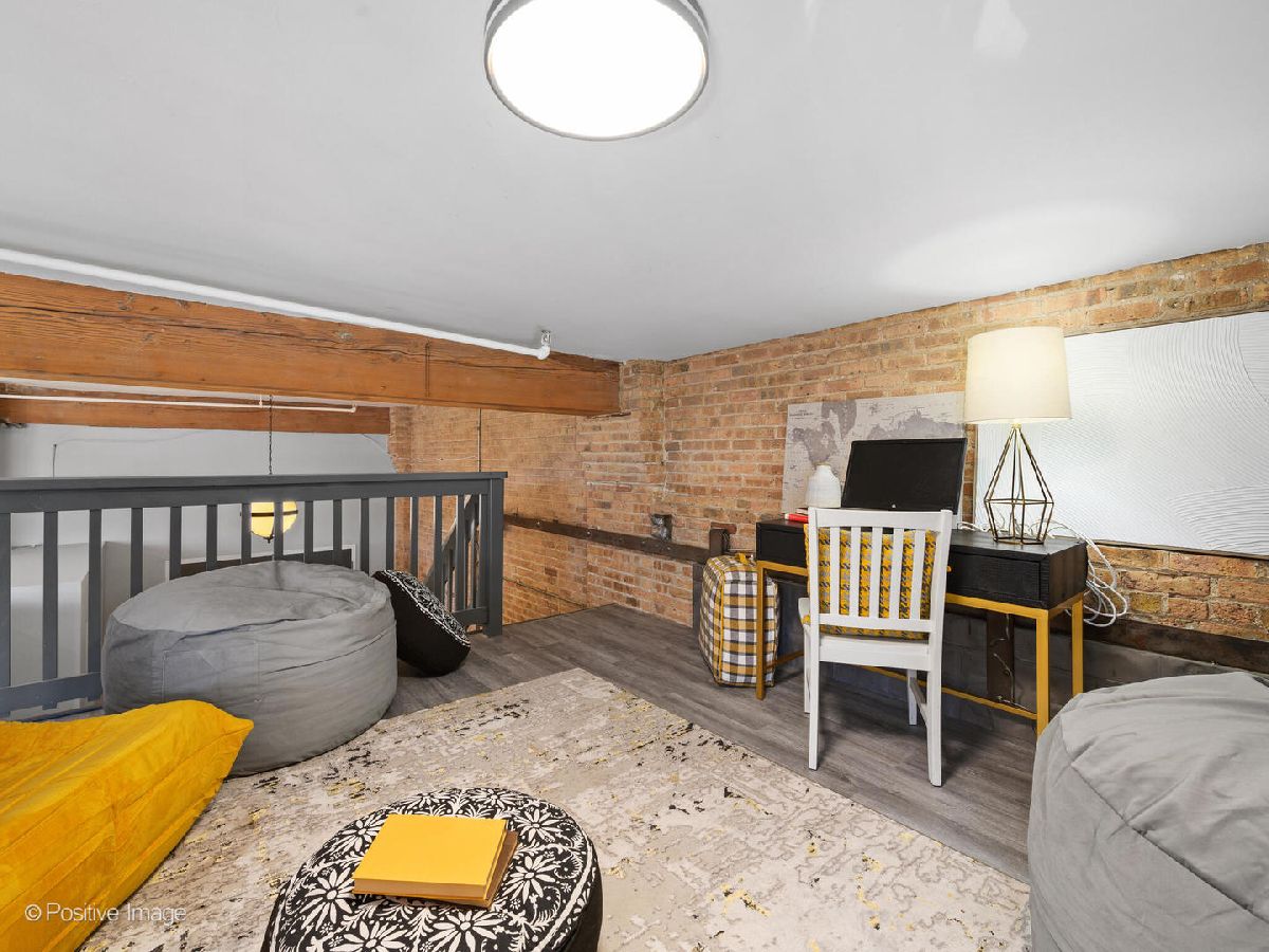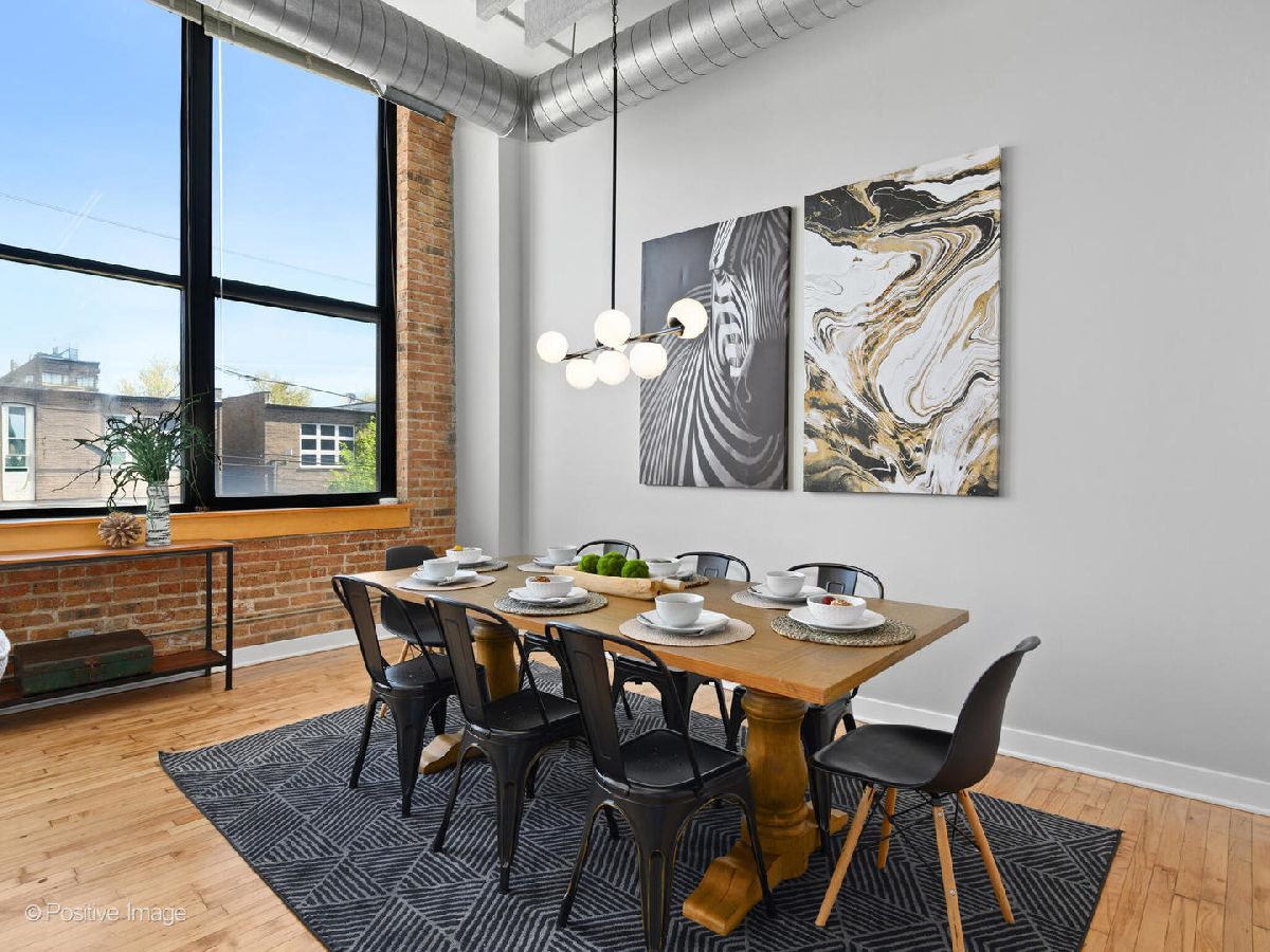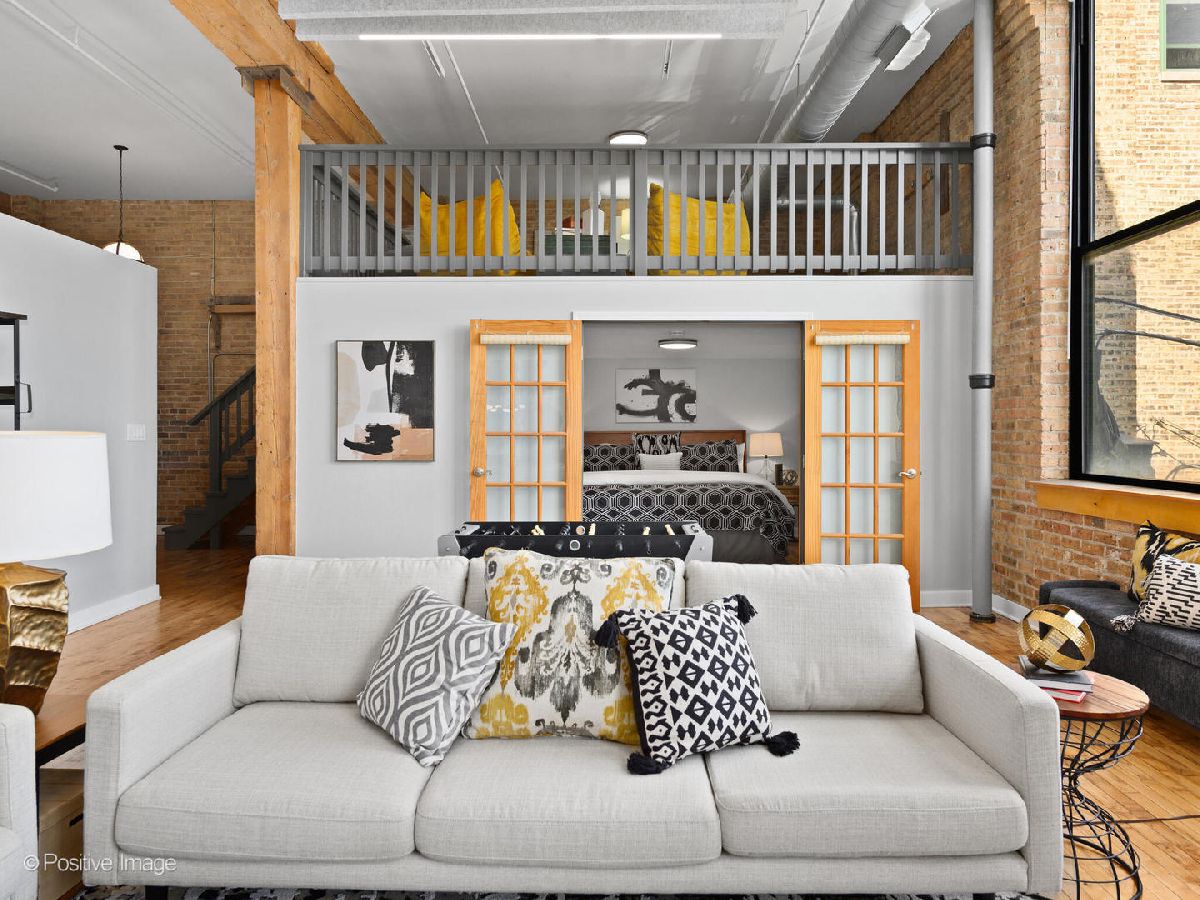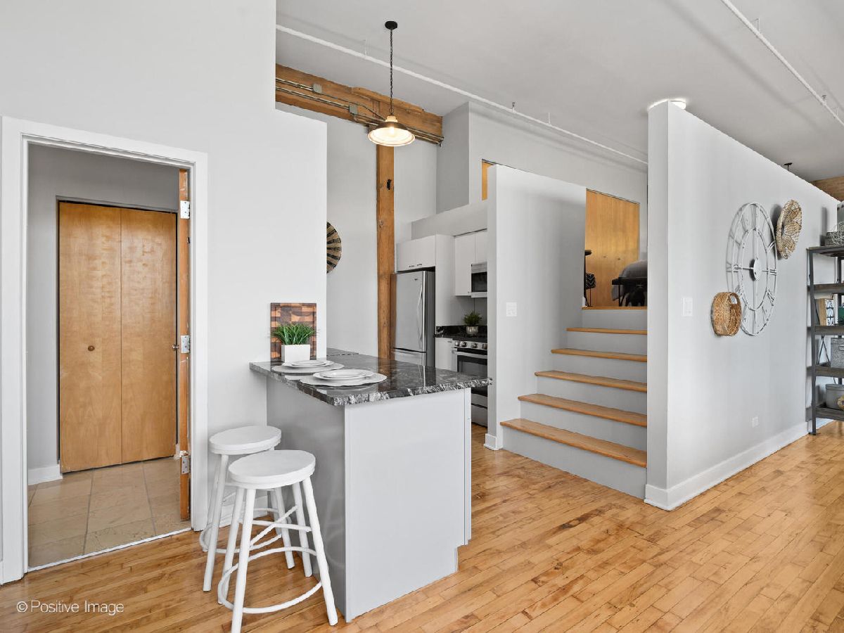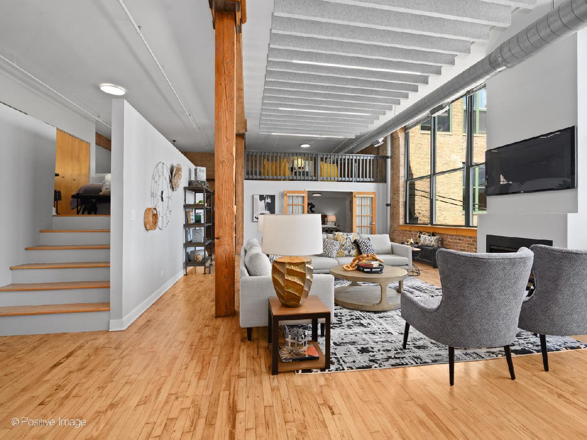 Unique live/work loft in Logan Square! This 2-bedroom + den features over 1700 SQ FT of living space, hardwood floors, 15-foot ceilings, and 2 rows of 10' windows. Step into a large entryway that unfolds into a 700 sq. ft. living and dining space, anchored by a beautifully positioned wood-burning fireplace. The high ceilings have updated light fixtures, fans, and stylish TURF soundproofing. The kitchen features high-end stainless steel appliances, granite countertops, and an eat-in island-perfect for entertaining. The bathroom has been thoughtfully updated with a sleek vanity, complemented by premium Grohe and Kohler fixtures. This unit offers two spacious bedrooms (one enclosed) and an airy loft that could be used as a third bedroom or home office. In-unit laundry, central heating and air, ample closet and storage space, and one exterior parking space complete the home. Fantastic Logan Square location just a block off Milwaukee Avenue, 2 blocks to the blue line and easy highway access. Agora grocery, restaurants, coffee, parks & shopping are all within walking distance.