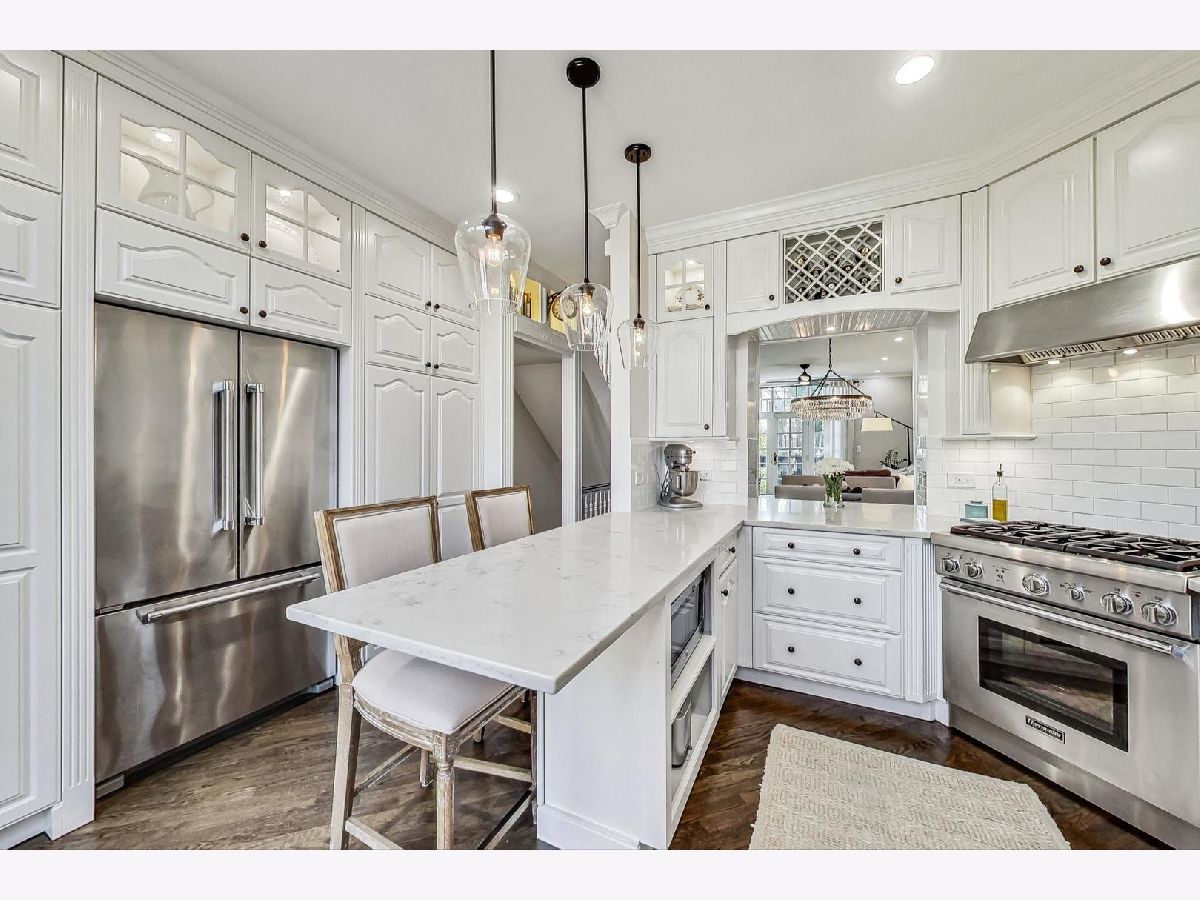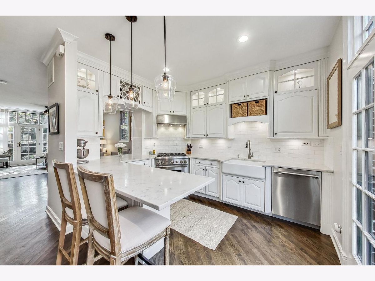 Located in Lincoln Park's highly sought after Embassy Club, this pristine and extensively upgraded 3 bedroom, 2.1 bath all brick townhome, lives like a single-family home. Tucked away and positioned as an end-unit, you'll be transported to the English countryside with the thoughtfully designed garden landscaping by Kemora Landscapes including lush hydrangea bushes and even a pear tree. The rare and private side yard is outfitted with an irrigation sprinkler system, custom landscape lighting and front and back patio spaces for your enjoyment. The ground level has a front foyer with a large coat closet, extensive storage under the stairs, powder room, third bedroom, attached heated garage and exterior additional parking pad. The main level opens into an expansive combination living dining room with beautiful custom lighted built-ins, redesigned new gas fireplace, and tailored draperies. Adjacent is a large chef's kitchen that showcases professional grade stainless steel appliances - Thermador Range and Dishwasher, Bosch Refrigerator, Quartz countertops, eat-in island, laundry closet and leads out to a balcony space perfect for grilling and al fresco dining. Up the staircase, you'll find the primary bedroom with his and her closets and a designer en suite bathroom filled with natural light from a beautiful skylight. Equipped with Grohe Shower System, double vanity sinks with Kingston Brass and Pottery Barn fixtures, Kohler pressure-assisted toilet and heated marble floors. Down the hall is the second bathroom featuring marble floors, quartz countertops, Delta combined shower and tub system, Kohler fixtures and toilet. A professionally designed second bedroom/nursery has been appointed with Schumacher luxury wallpaper, custom batten board, Hunter Douglas blinds, and double panel draperies. Ample storage is found throughout the home with each of the professionally organized closets located on every floor. Updates include a brand new premium furnace (2023), premium A/C (2022), garage door system (2023), garage heater and flooring (2022), hardwood floors (2022), professionally designed renovated bathrooms and plumbing lines (2022), can lighting and lighting fixtures (2022) and more! Unbeatable Lincoln Park location with easy access to Wrightwood Park, DePaul, shopping and neighborhood restaurants and amenities.
