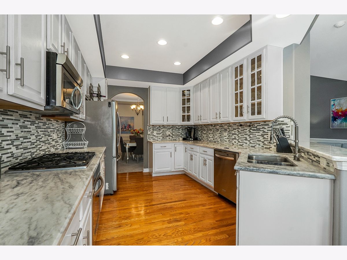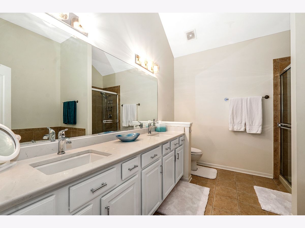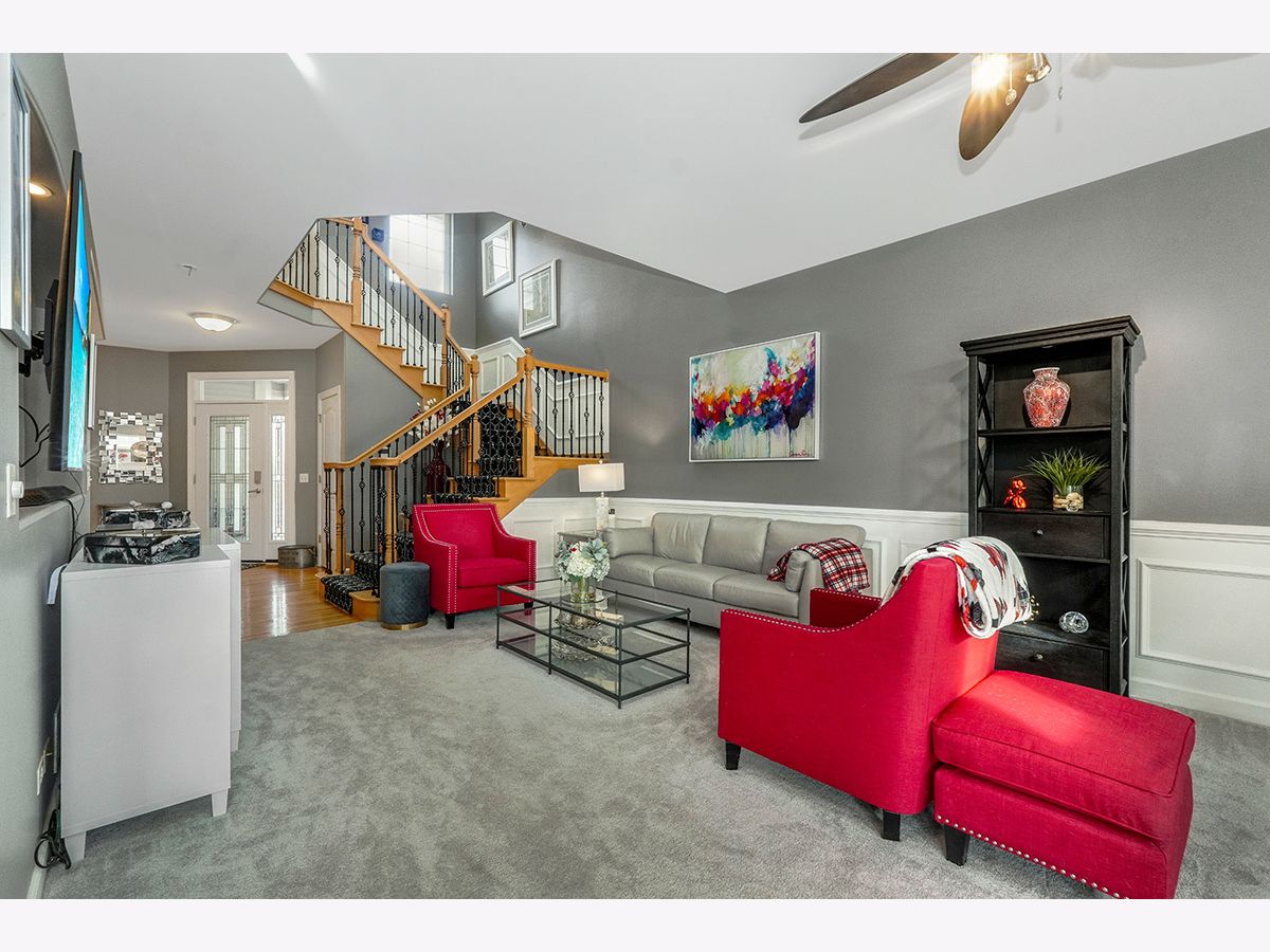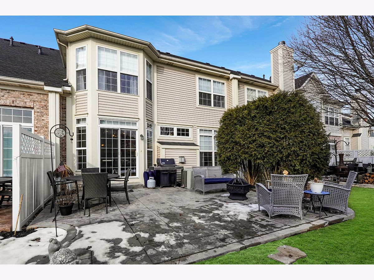Beautiful, elegantly decorated North facing 2-story townhome with full basement and attached 2 car garage located on a quiet cul-de-sac~The private entrance features a front porch with room for a small table and chairs along with a gorgeous leaded glass door and sidelight~Upon entering you'll be greeted with hardwood flooring and a breathtaking open floor plan with an abundance of natural light~The chef's kitchen offers plenty of white cabinets, recessed lighting, tasteful glass tile backsplash, stainless steel appliances, and granite countertops including a breakfast bar with room for stools~Not only will you find a formal dining room with a high tray ceiling but the separate eating area off the kitchen has sliding glass doors overlooking the extended, updated stone patio~Make your way up the gorgeous turned staircase with wrought iron spindles where the ceiling opens up to skylights~The master bedroom suite has plenty of room with a high vaulted ceiling, bay windows, good-sized walk-in closet PLUS a double door closet, and a private luxury bathroom with gentleman's height dual vanity, separate shower and a jetted tub~You'll also find a large 2nd bedroom, 2nd floor laundry and a generous sized loft that could easily be a 3rd bedroom, office space or 2nd floor family room~First floor powder room and 2nd floor bathroom recently remodeled~Additional features include a gas fireplace with white/gray stone surround in the living room, white doors and trim, nickel hardware, updated light fixtures and high 9' ceilings and wainscoting throughout the first floor~Located just minutes to shopping, restaurants and all that Rt. 59 and downtown Plainfield have to offer~You won't be disappointed!