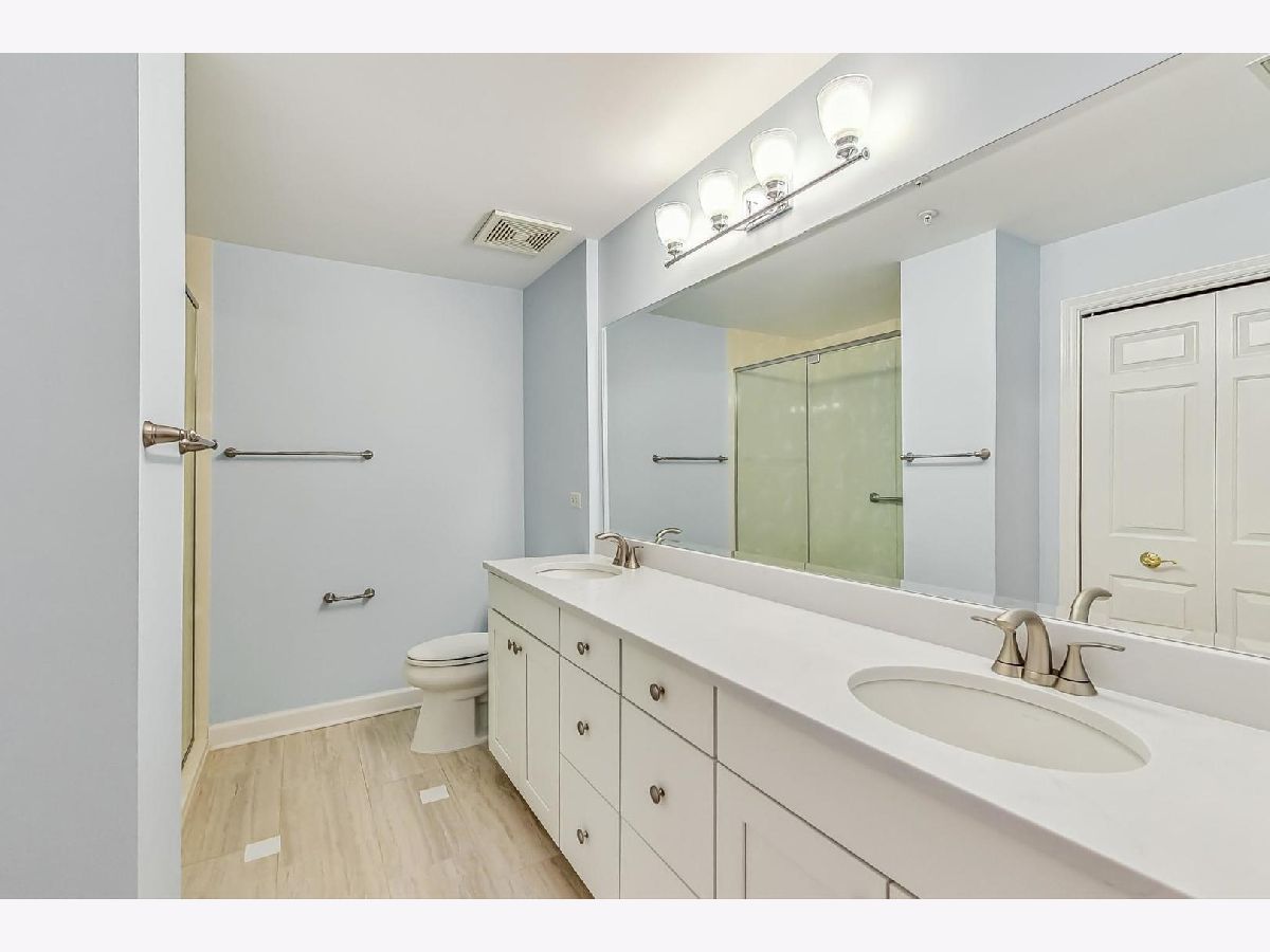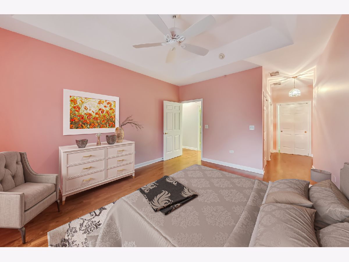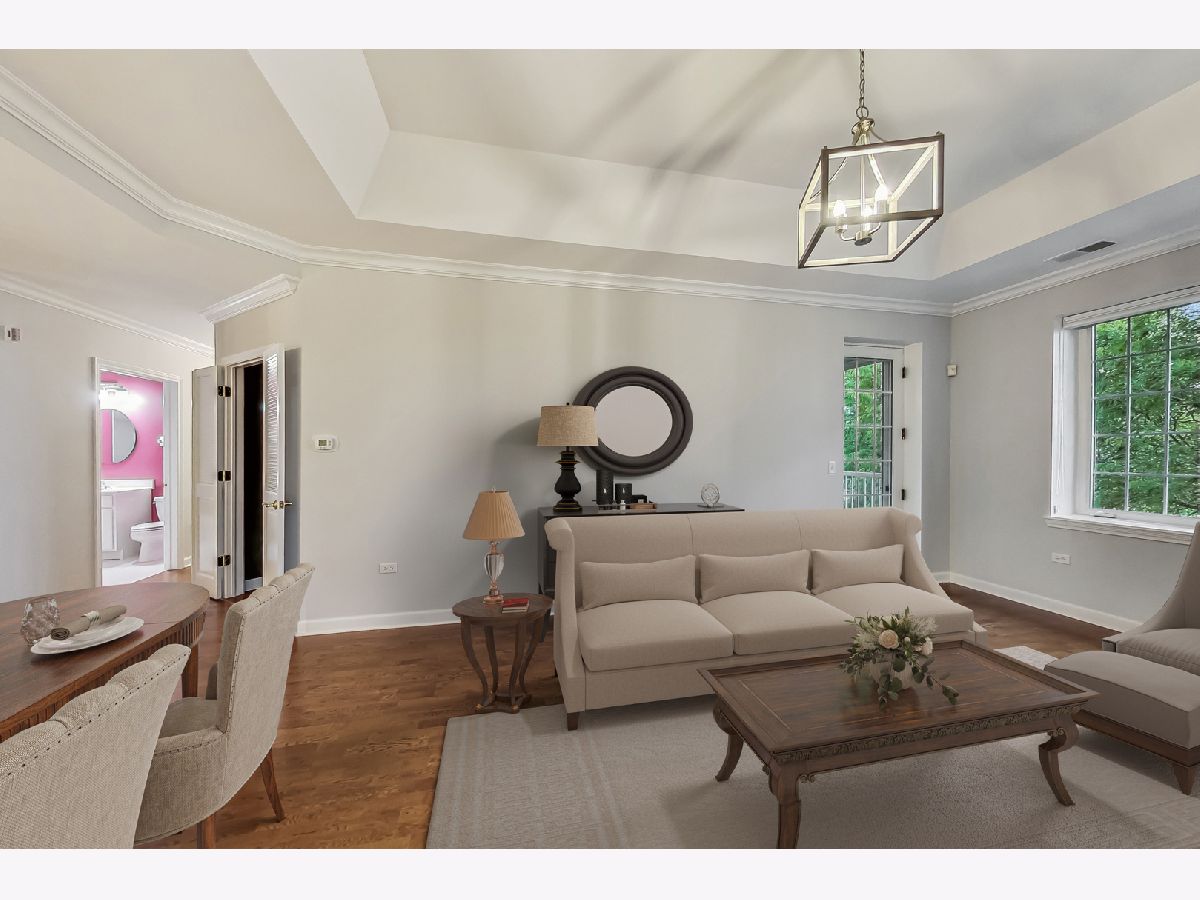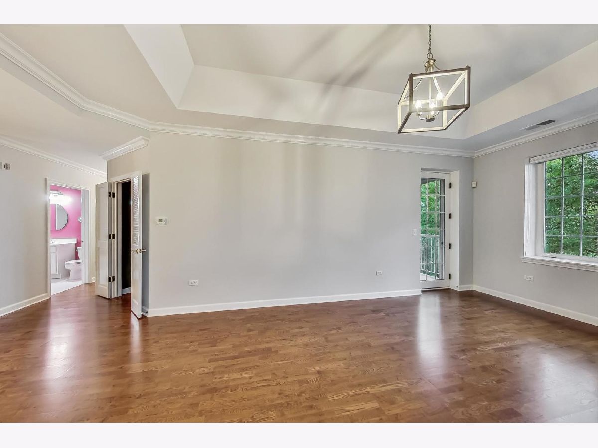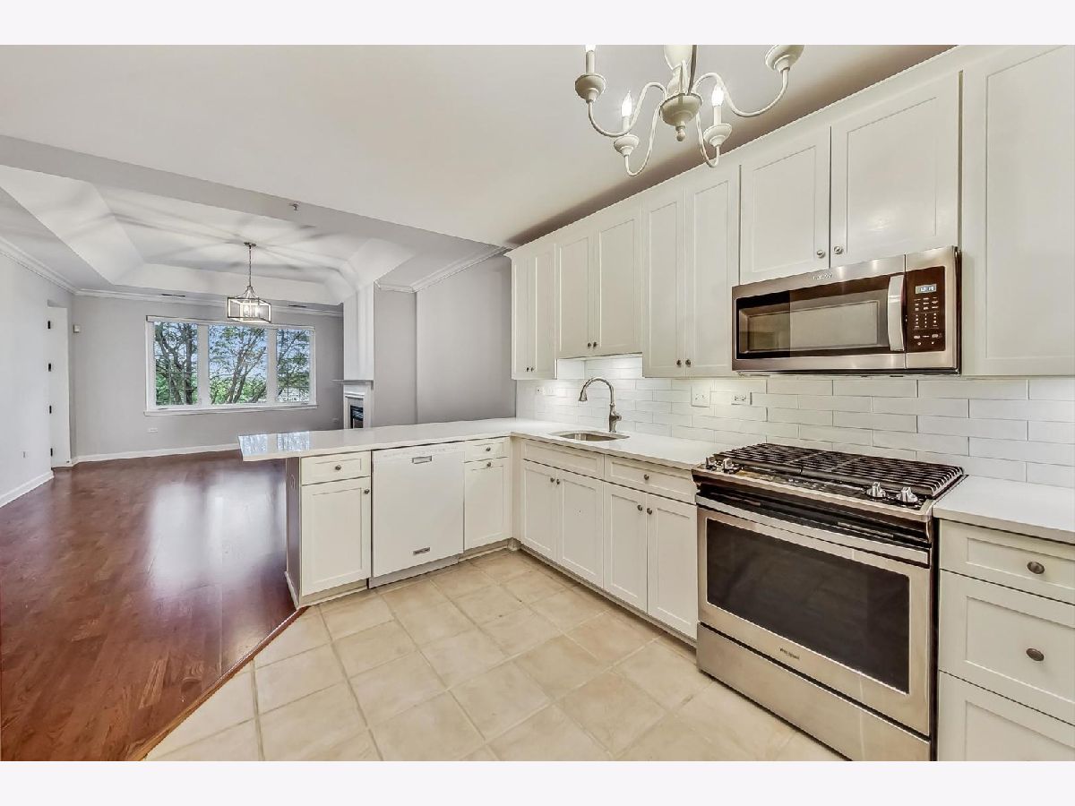 MULTIPLE OFFERS RECEIVED-Sought-after Heatherfield two-bedroom, two-bathroom condo with lovely west-facing views. Surrounded by the beauty of mature trees and walking paths, this third-floor condo offers a serene living experience. The foyer invites you into the living room and extends your eye to the balcony beyond. The entire property is trimmed with crown molding. The fresh, updated, and open kitchen features white cabinets, quartz counters, a stainless steel gas range/stove, microwave, table area, and eat-in island. The kitchen connects seamlessly to the dining room and living room, which are tailored with hardwood floors, a tray ceiling, a fireplace, bold windows, and direct access to a private balcony. The primary suite includes tray ceilings, three separate closets, and an en-suite master bath with a new double vanity and tailored tile. The second bedroom provides great space and flexibility for dynamic use; bedroom, den or both and is served by a robust bathroom with vanity and tub/shower combo. In-unit laundry with a washer and dryer is showcased in a dedicated room for added convenience. The property comes with secure garage parking and a storage locker. This gorgeous luxury building is a treasure, located near The Glen, Jewel, retail shopping, transportation, entertainment, and more. Welcome Home!