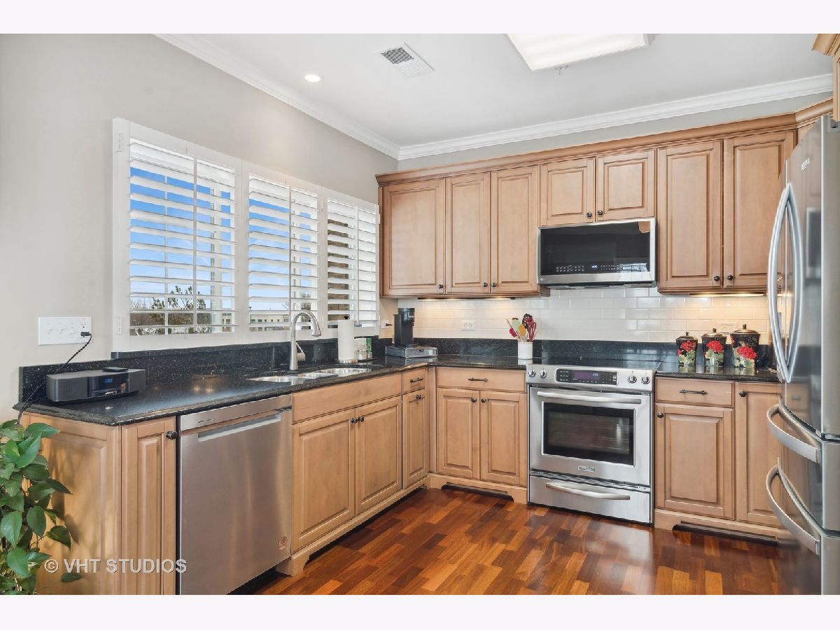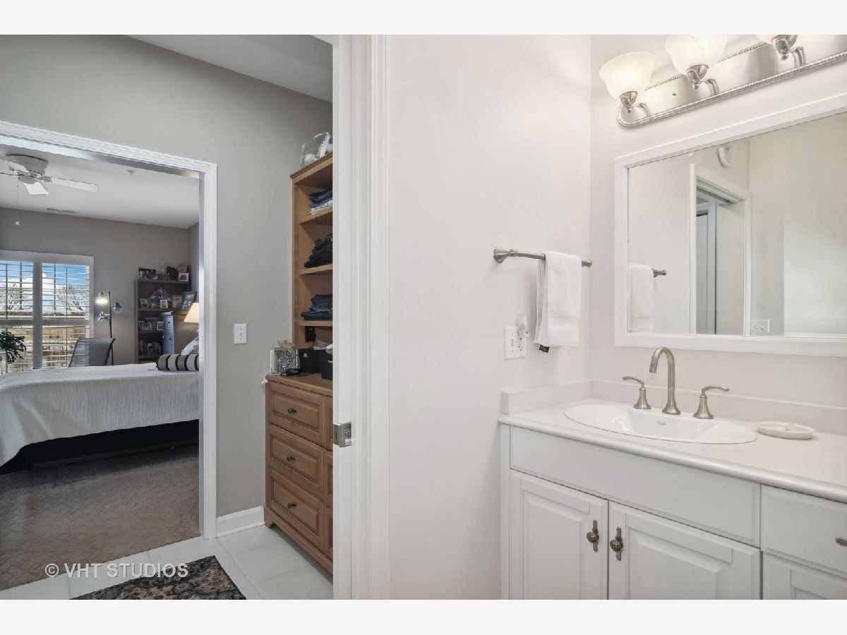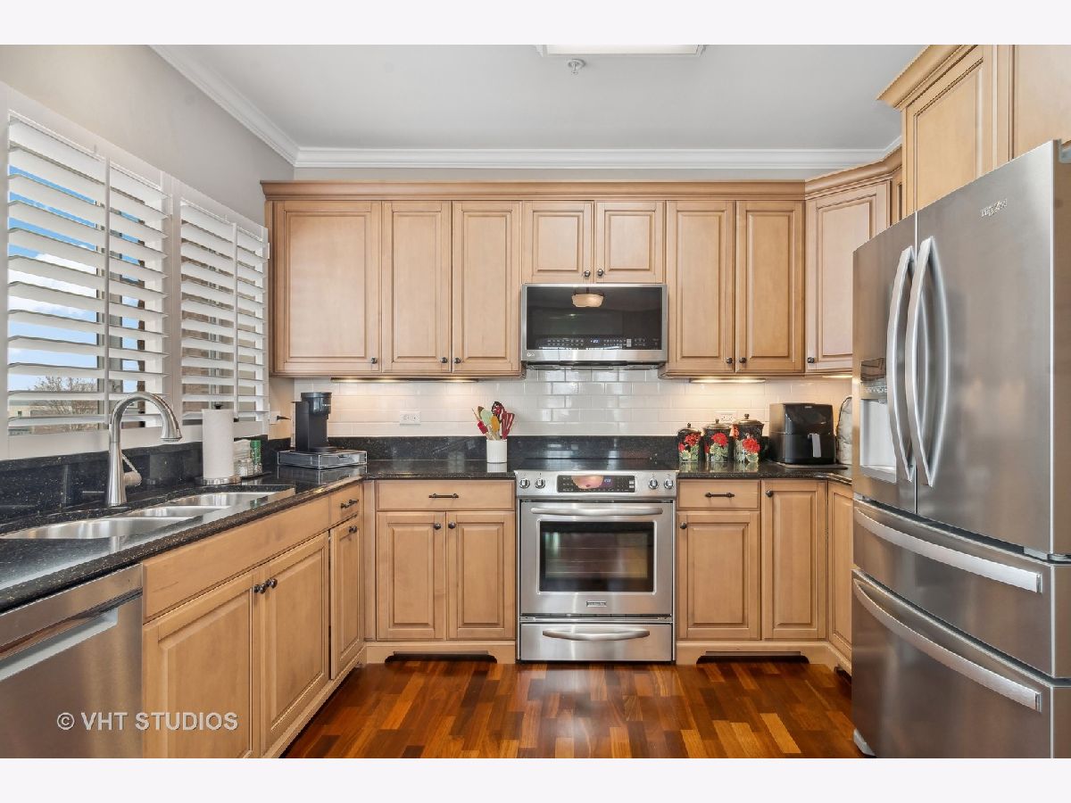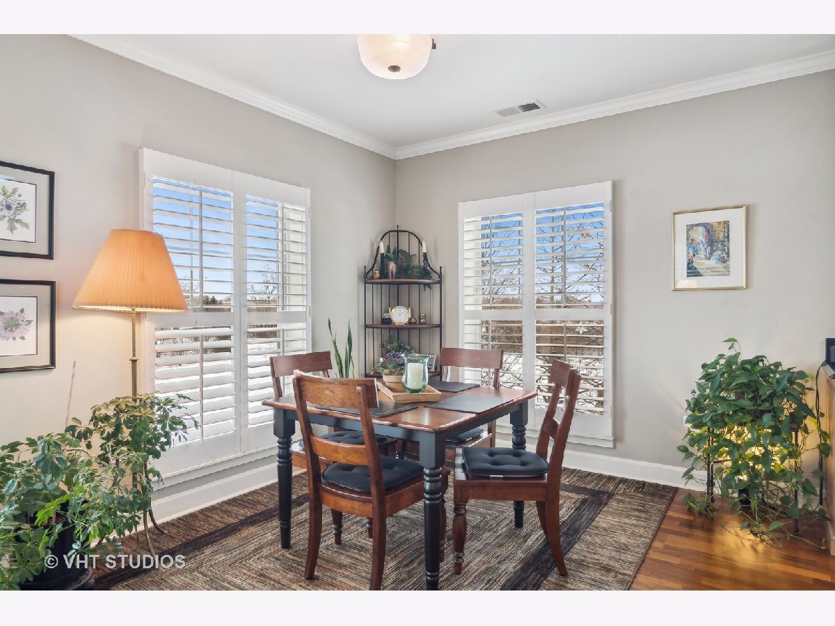 Exquisite end unit condo in highly sought-after THE CROSSINGS OF GENEVA. This 55 and older community boasts immeasurable quality featuring opulent finishes, epitomizing luxury living. This prestigious residence features high-end finishes, impeccable craftsmanship and unparalleled attention to detail. As you enter this beautiful home, you will quickly notice the gleaming Brazilian cherry hardwood floors throughout the living room, dining room and kitchen areas. This living room is truly an inviting space to entertain or relax. Enjoy the balcony patio just outside the eating area. This oversized space is a private and tranquil space to enjoy your morning coffee or relax with a great book. The large, open kitchen has custom maple soft close cabinets, under cabinet lighting, a brand new refrigerator, microwave and dishwasher and all stainless steel appliances. Spacious primary suite with ceiling fan, walk-in closet, built-in shelving unit and gorgeous updated full bath. Convenient laundry room with utility sink, located just off the front door. Second bedroom and en-suite bath offer a great space for an office, exercise room, etc. Plantation shutters in each room. There is a storage locker down the hall from the unit. Enjoy secure parking in the heated garage with an additional storage locker in front of the parking space. Elevate your lifestyle in this refined haven of sophistication. Minutes from shopping, dining, hospital and the METRA. Don't miss this amazing property!