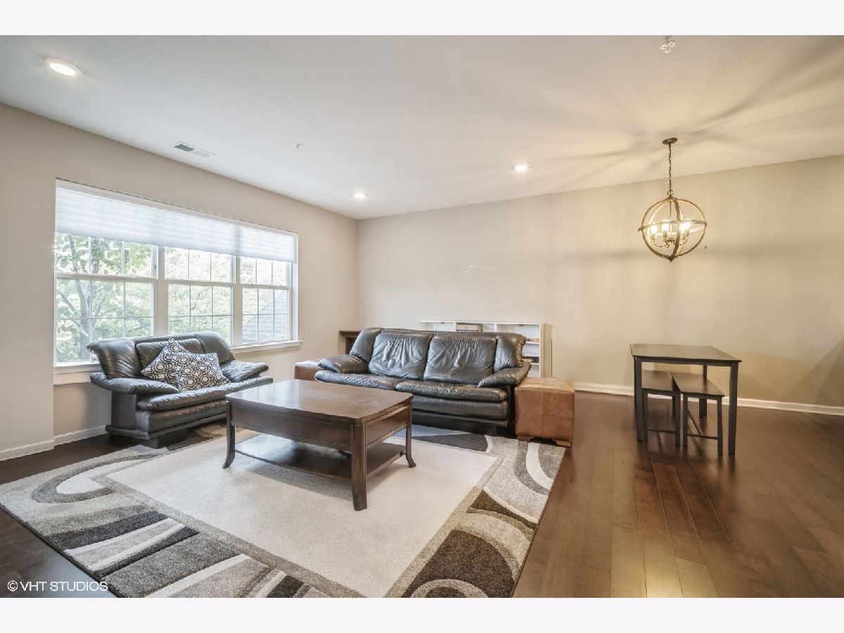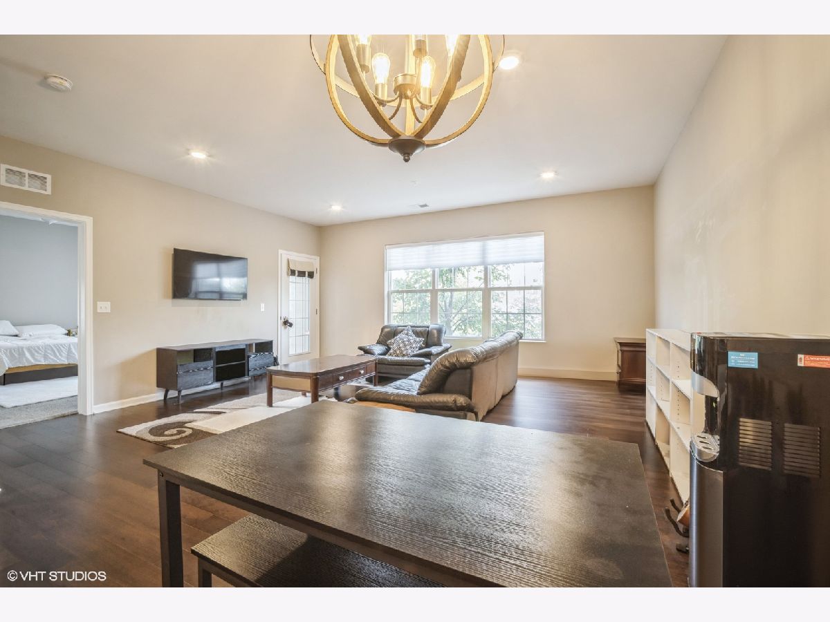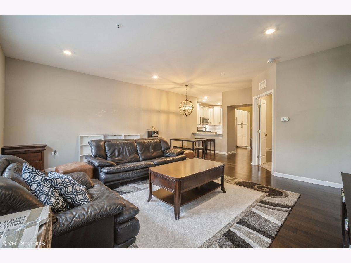 Discover this fabulous and sought-after one-bedroom plus den condo in the prestigious Glen community, just steps from The Glen Town Center. Built in 2017 and impeccably maintained, this condo features hardwood floors, a beautifully updated kitchen with 48" cabinetry, stainless steel appliances, granite countertops, a breakfast bar, and ample cabinet and counter space. The kitchen flows seamlessly into the sunlit living and dining areas, perfect for hosting. Enjoy your private balcony accessible from both the living room and the primary bedroom. The spacious primary suite offers a large walk-in closet plus a double-door closet and an ensuite bath with dual vanity, Kohler plumbing, granite countertops, and a walk-in shower. The additional den is ideal for working from home. The in-unit side-by-side Whirlpool washer and dryer are located in a separate laundry room with storage shelving. Included in the price is one deeded garage parking space in the attached heated garage. The well-maintained HOA includes amenities such as an extra-large storage cage, bike storage, a fitness center, and a party room. Gas, Xfinity cable, and internet are included in the assessments. This unbeatable location offers quick access to walking and biking trails, The Glen Club, Gallery Park, several grocery stores, the Metra Station, Little Bear Park, Park Center Health & Fitness, and all The Glen Town Center has to offer, including cafes, shopping, dining, and a movie theater.