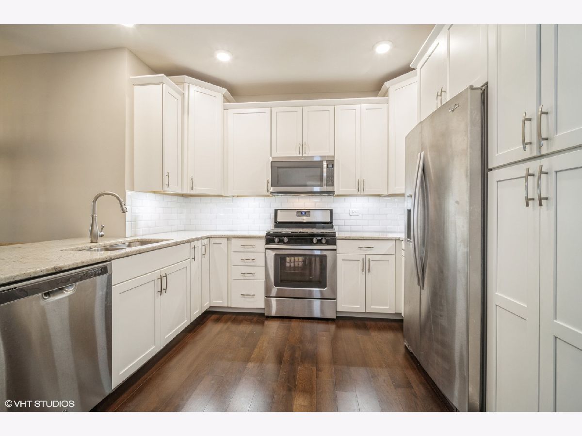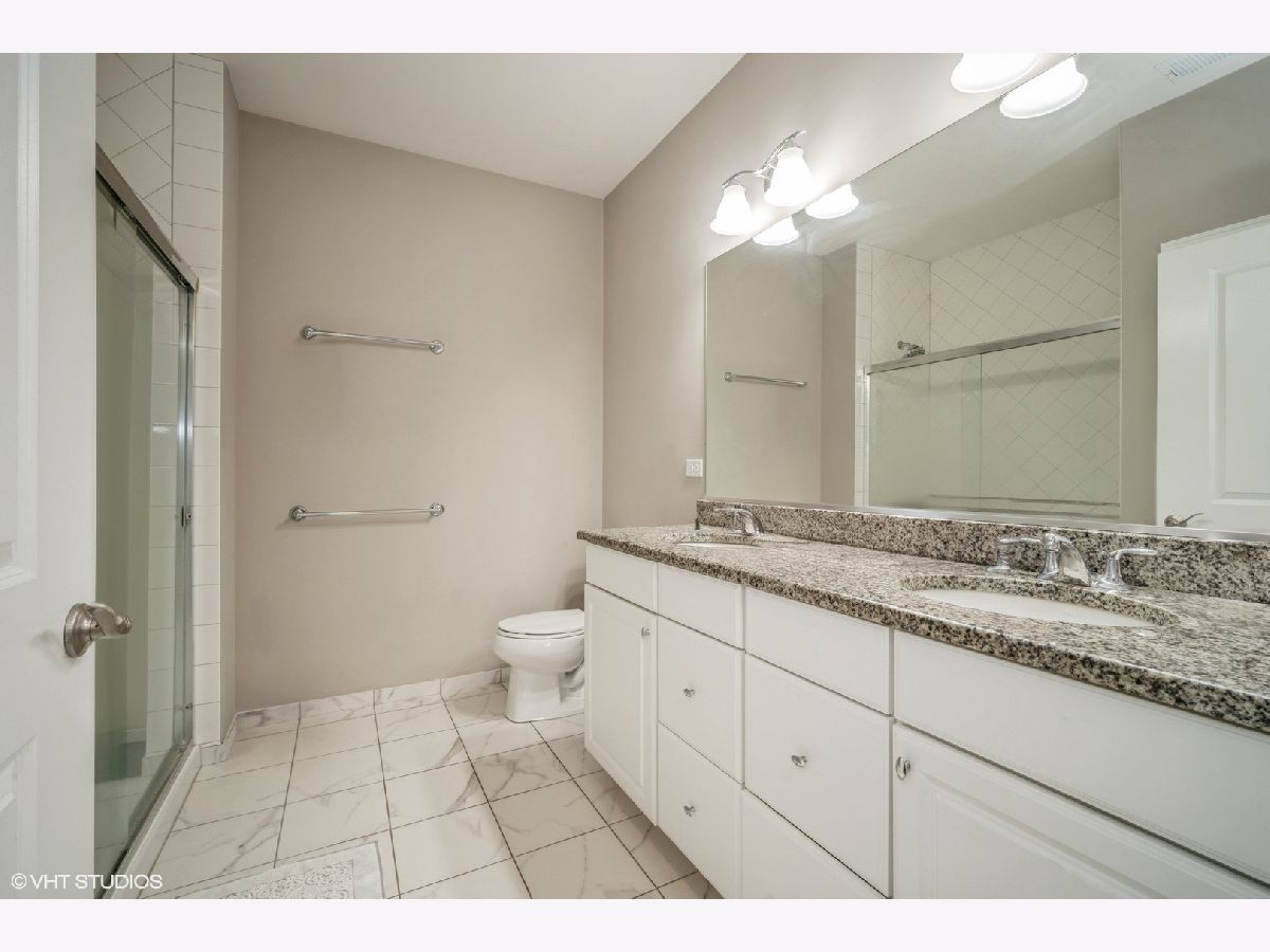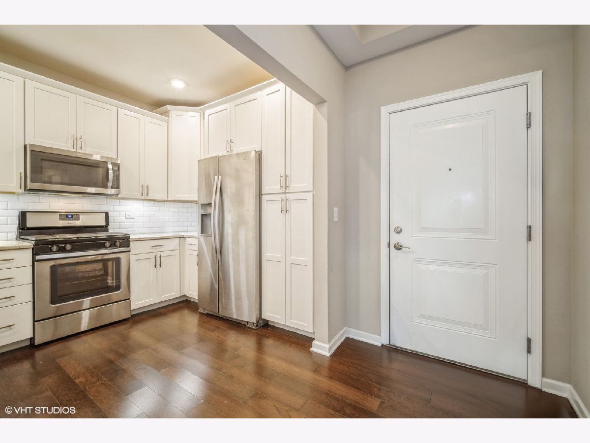 Discover this fabulous and sought-after one-bedroom plus den condo in the prestigious Glen community, just steps from The Glen Town Center. Built in 2017 and impeccably maintained, this condo features hardwood floors, a beautifully updated kitchen with 48" cabinetry, stainless steel appliances, granite countertops, a breakfast bar, and ample cabinet and counter space. The kitchen flows seamlessly into the sunlit living and dining areas, perfect for hosting. Enjoy your private balcony accessible from both the living room and the primary bedroom. The spacious primary suite offers a large walk-in closet plus a double-door closet and an ensuite bath with dual vanity, Kohler plumbing, granite countertops, and a walk-in shower. The additional den is ideal for working from home. The in-unit side-by-side Whirlpool washer and dryer are located in a separate laundry room with storage shelving. Included in the price is one deeded garage parking space in the attached heated garage. The well-maintained HOA includes amenities such as an extra-large storage cage, bike storage, a fitness center, and a party room. Gas, Xfinity cable, and internet are included in the assessments. This unbeatable location offers quick access to walking and biking trails, The Glen Club, Gallery Park, several grocery stores, the Metra Station, Little Bear Park, Park Center Health & Fitness, and all The Glen Town Center has to offer, including cafes, shopping, dining, and a movie theater.