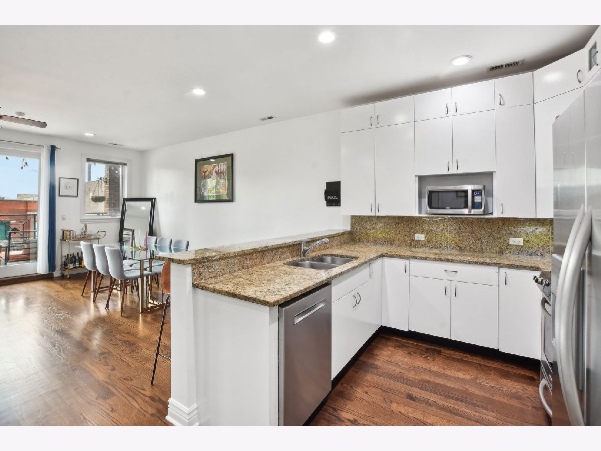 Great opportunity to own in the coveted West Town neighborhood. This beautiful 3 bed 2 bath unit comes with hardwood floor(refinished 2019), spacious living room, SS appliances, Newer water heater, 2 outdoor parking spaces, granite countertops with breakfast bar, front and rear balcony, rooftop deck with beautiful skyline views. The huge Master Suite includes marble tile, double vanity, separate whirlpool tub and glass shower. The unit is a short walk from Smith Park, Western Metro train station 15 min walk; bus stop right across street on Chicago Ave, and close to restaurants on Randolph St and Fulton Market nightlife.