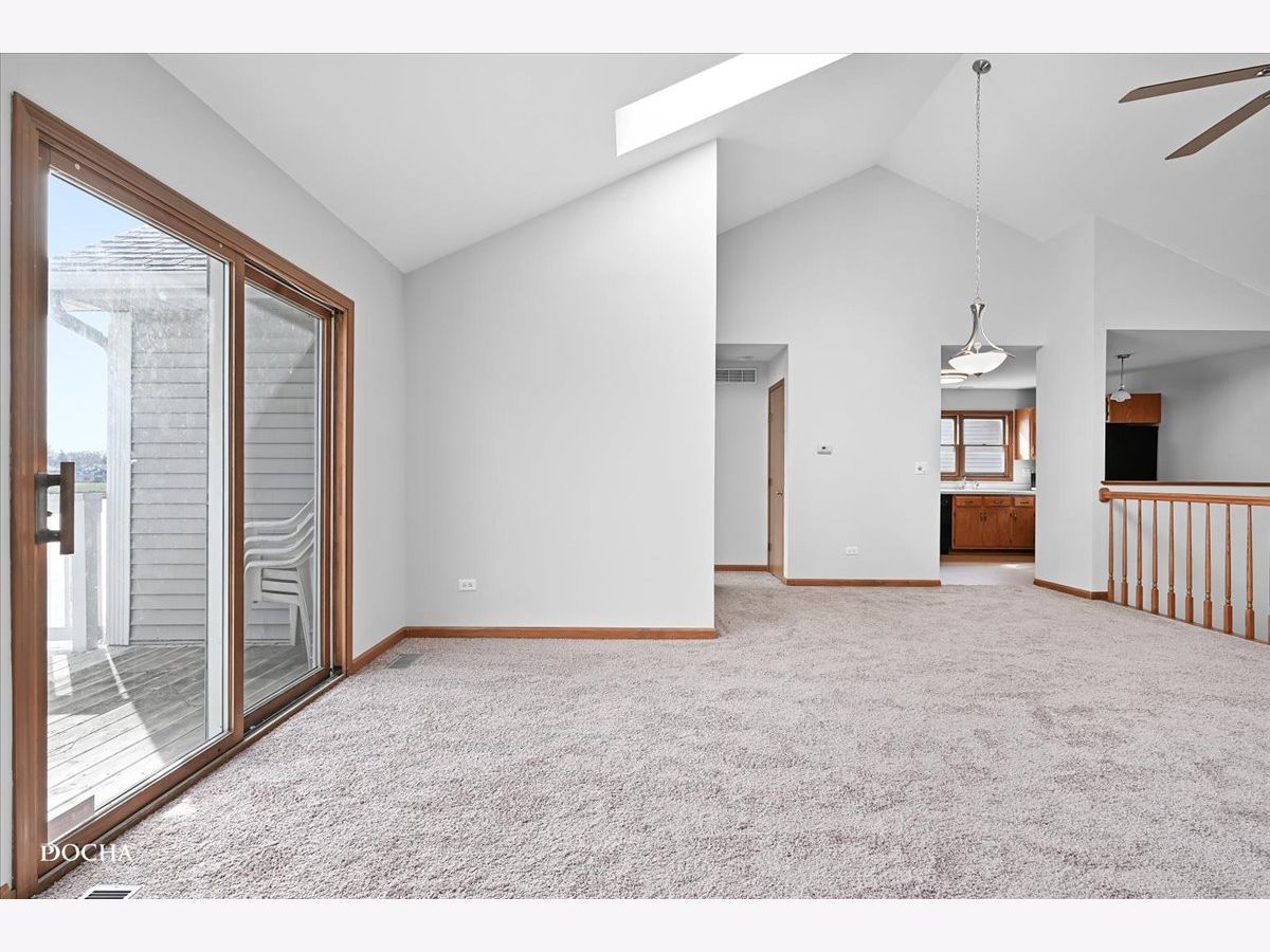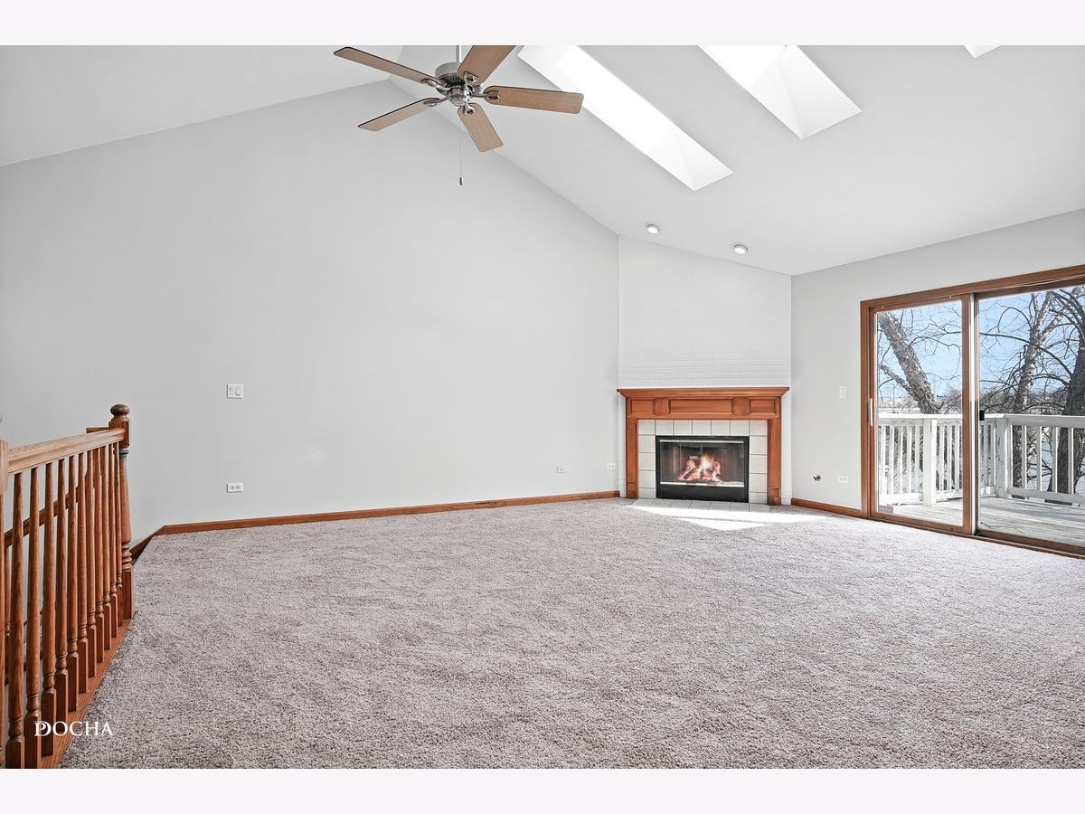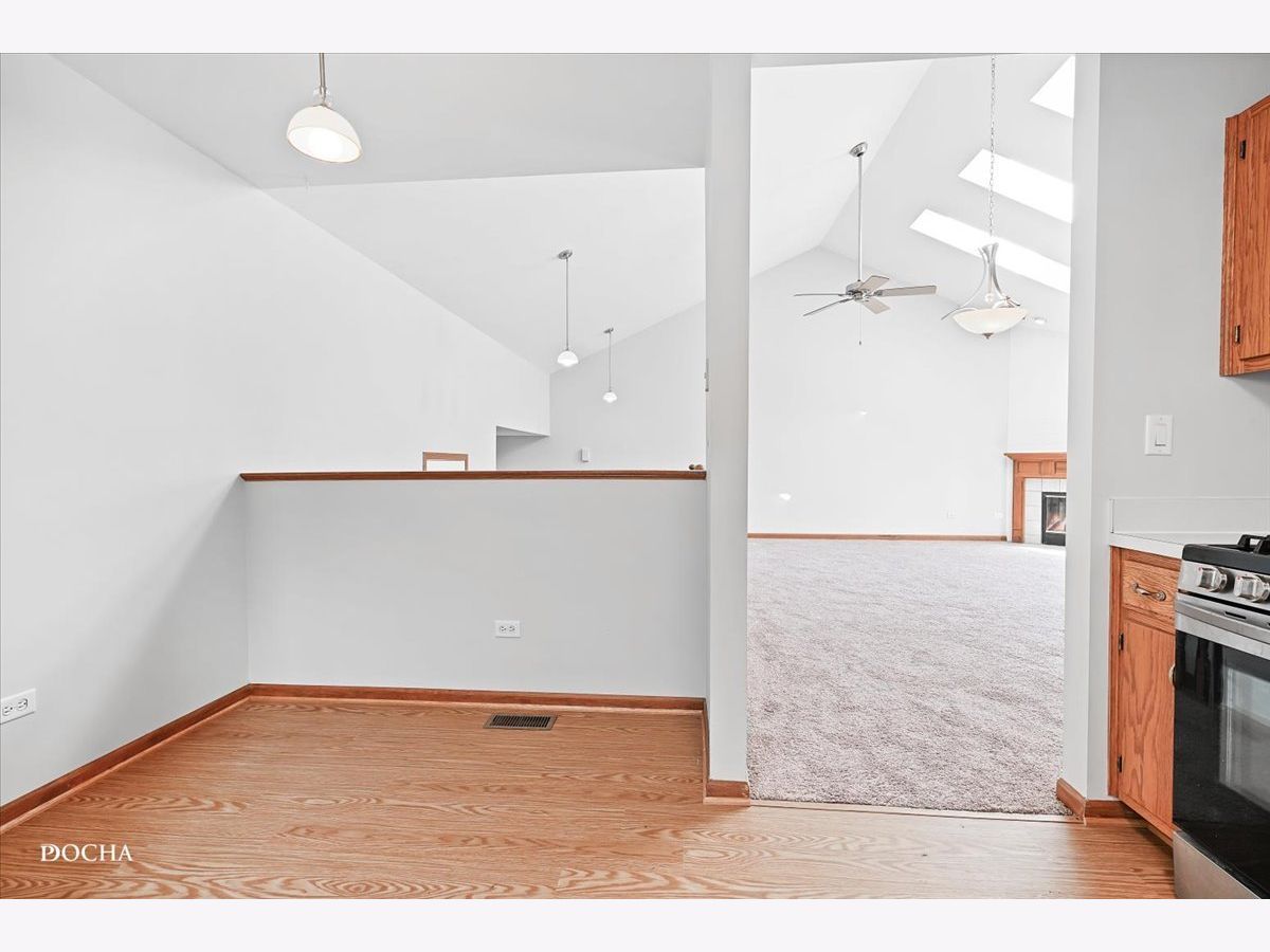 Lake view living! Freshly painted 3 bedroom, 2.5 bath open concept end unit townhome with gorgeous lake views in the "Townhomes on the Lake" subdivision. Living room with new carpet offers cozy fireplace, vaulted ceilings, and sky lights for tons of natural light. Freshly painted deck just off of family room offers serene lake views while enjoying your morning coffee as the sun rises. Open kitchen with countertop space aplenty has dining area, oven/range with new range hood! Primary bedroom offers incredible views of the lake and features ensuite with spacious full bath and walk in closet on the main level. Lower level features family room and covered deck with beautiful lake views, second and third bedrooms, full bath, and laundry. Additional lower level basement storage as well. Two car attached garage. Furnace 2023, upstairs carpet 2024, fresh paint 2024, kitchen flooring 2024, windows 2019. Desirable Plainfield School District 202. Steps from Joliet Mall, Rt 30 and I-55!