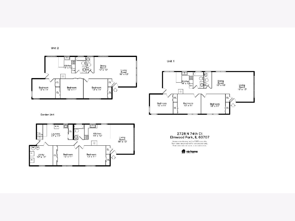 This sharp well Maintained 3 Flat offers open floor plans, generous room sizes and an awesome Elmwood Park location minutes to shopping, restaurants and parks. The Garden Unit features 2 bedrooms, 1 bath, open kitchen and living space; Units 1 & 2 features 3 bedrooms/1.5 baths, open eat in kitchen, living and dining rooms. Additional features: Large Storage in the lower level, clean common areas, large yard great for entertaining, plus a Detached 3.5 car garage with screened in porch. New Roof & gutters '19, Newer Hot Water heater & Sump pump flood Control system. All tenants on a month to month lease & would like to stay. Great Investment Opportunity. Currently there are no showings in tenant occupied units so we urge you to use our Interactive Virtual Floor Plan link so you can see how each unit feels.