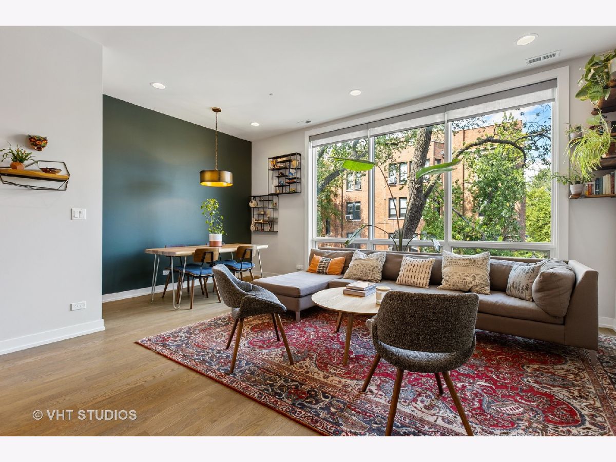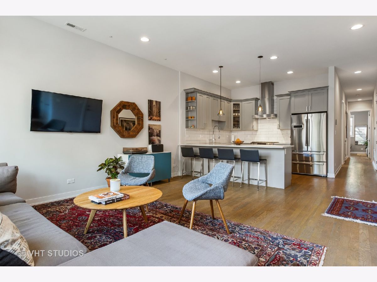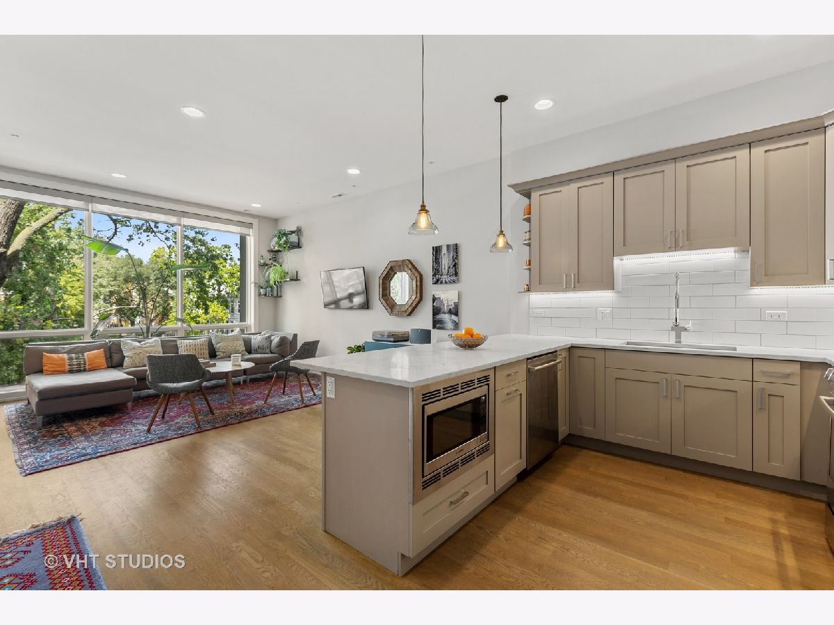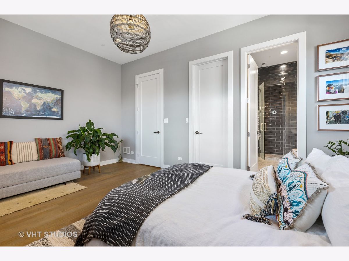 Gorgeous two bedroom, two bathroom condo newer construction, built by Sustainabuild in 2017, in a prime East Humboldt Park location. Dramatic floor to ceiling windows in the living room overlook the green treetops of a quite side street. Open concept living space, dining area and kitchen. Stained oak hardwood floors run throughout as well as organized closets, upgraded lighting and custom window treatments. Chef's kitchen has a peninsula seating four barstools, white subway tile backsplash, Bosch stainless steel appliances, modern light grey shaker cabinets, and white quartz countertops. Large corner primary suite has professionally organized walk in closet. En suite bathroom boasts a double vanity, marble tiled heated floors and oversized walk in shower with dark, modern subway tiling on walls and luxury steam and rain shower. Spacious, bright second bedroom with organized closet. Modern second full bathroom with vertical white subway tile in shower with glass door. Private, covered back deck is great for entertaining with space for seating, table, grill and planters and a large double wide grass common back yard. Garage parking included, separate storage, low assessments and an intimate 6 unit building. Great location close to Humboldt Park, North Ave bus line, CTA blue line train, restaurants and shopping of Wicker Park and Bucktown.