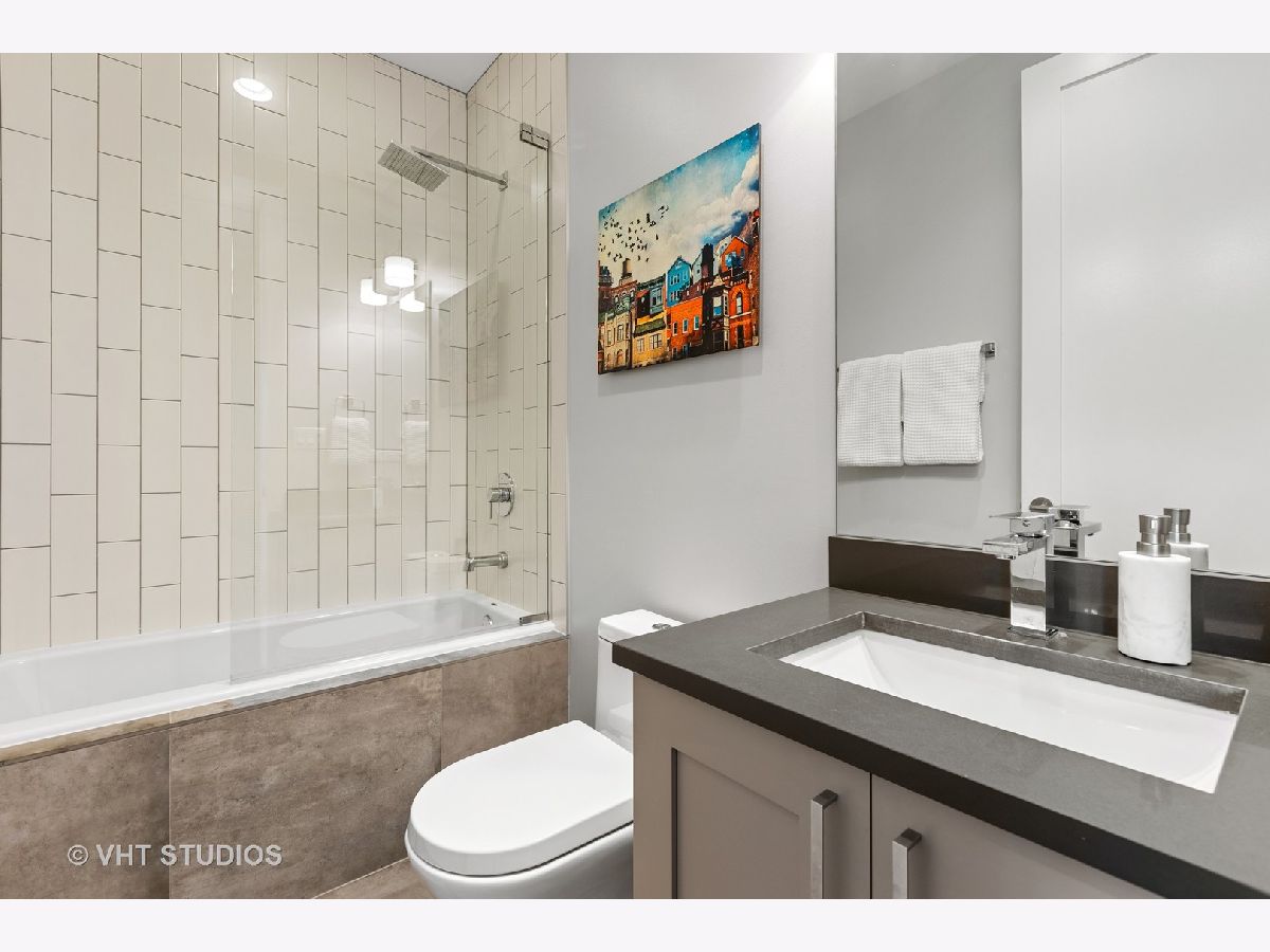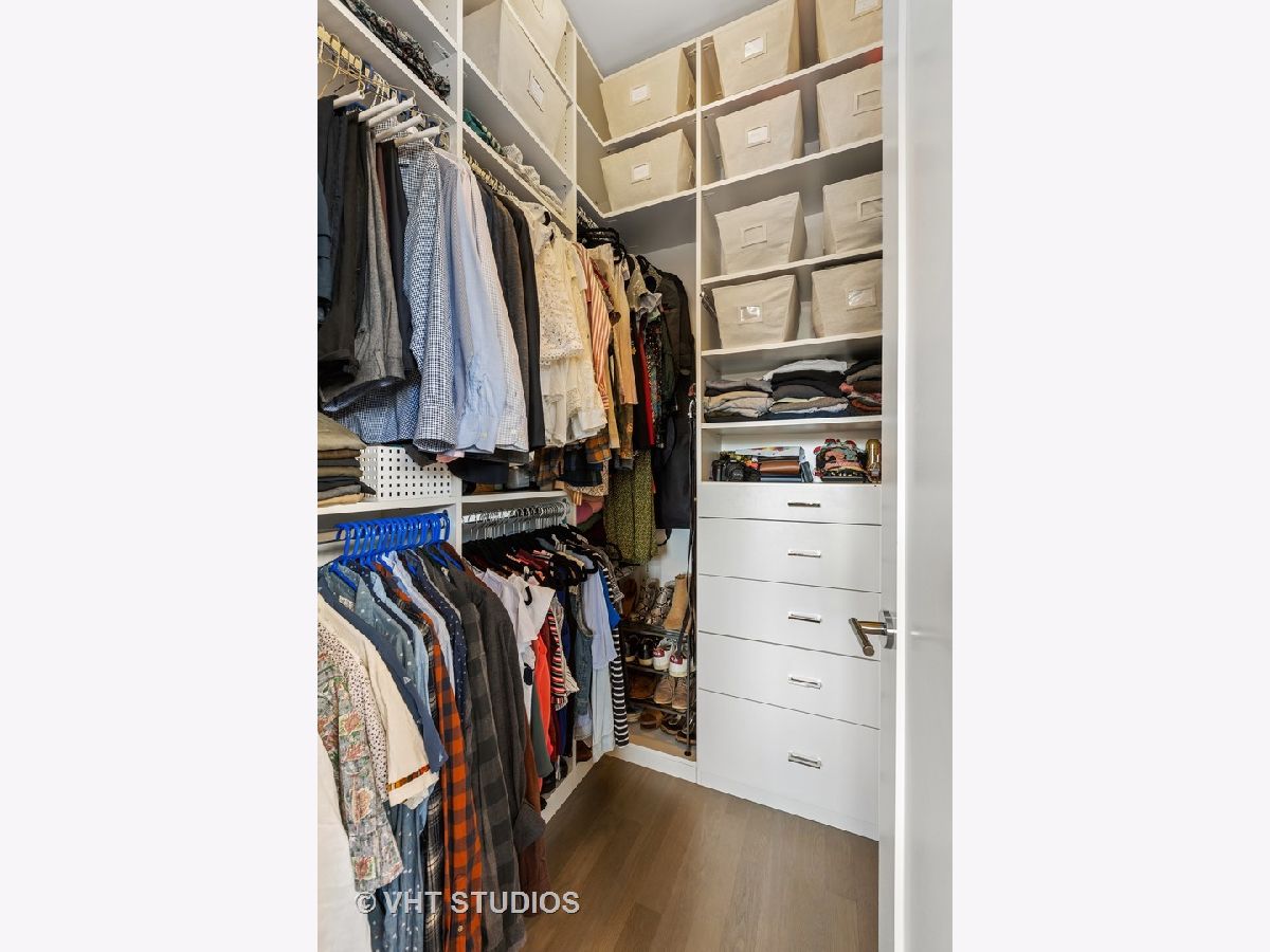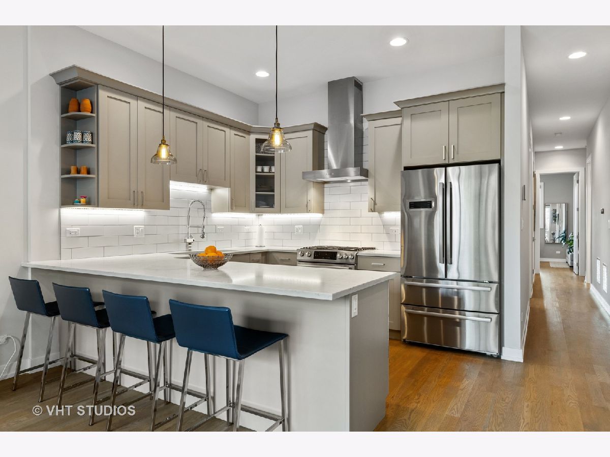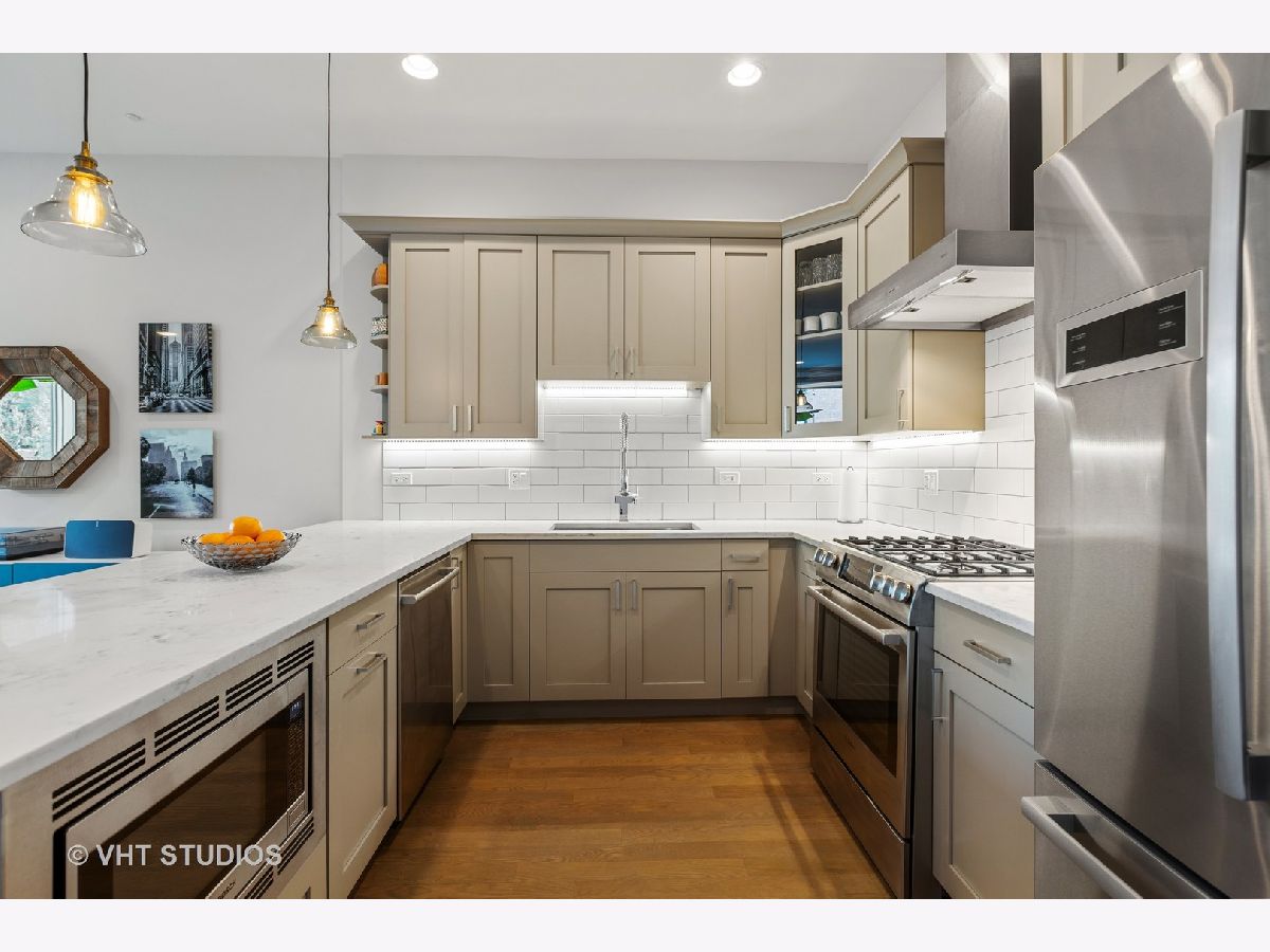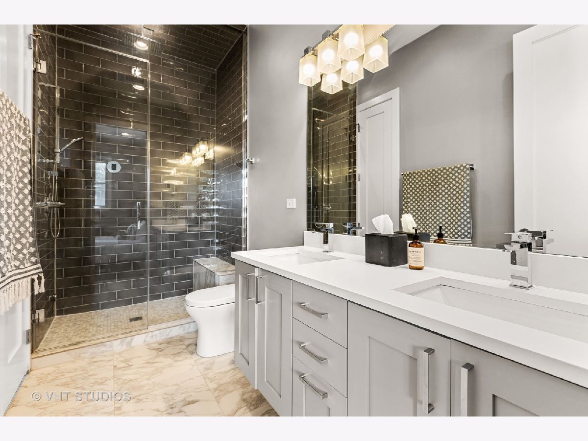 Gorgeous two bedroom, two bathroom condo newer construction, built by Sustainabuild in 2017, in a prime East Humboldt Park location. Dramatic floor to ceiling windows in the living room overlook the green treetops of a quite side street. Open concept living space, dining area and kitchen. Stained oak hardwood floors run throughout as well as organized closets, upgraded lighting and custom window treatments. Chef's kitchen has a peninsula seating four barstools, white subway tile backsplash, Bosch stainless steel appliances, modern light grey shaker cabinets, and white quartz countertops. Large corner primary suite has professionally organized walk in closet. En suite bathroom boasts a double vanity, marble tiled heated floors and oversized walk in shower with dark, modern subway tiling on walls and luxury steam and rain shower. Spacious, bright second bedroom with organized closet. Modern second full bathroom with vertical white subway tile in shower with glass door. Private, covered back deck is great for entertaining with space for seating, table, grill and planters and a large double wide grass common back yard. Garage parking included, separate storage, low assessments and an intimate 6 unit building. Great location close to Humboldt Park, North Ave bus line, CTA blue line train, restaurants and shopping of Wicker Park and Bucktown.