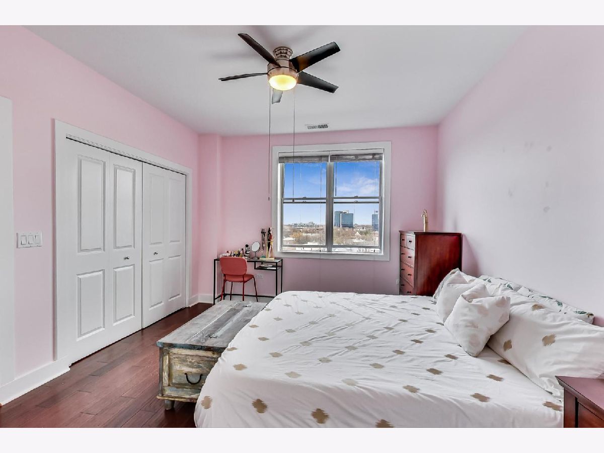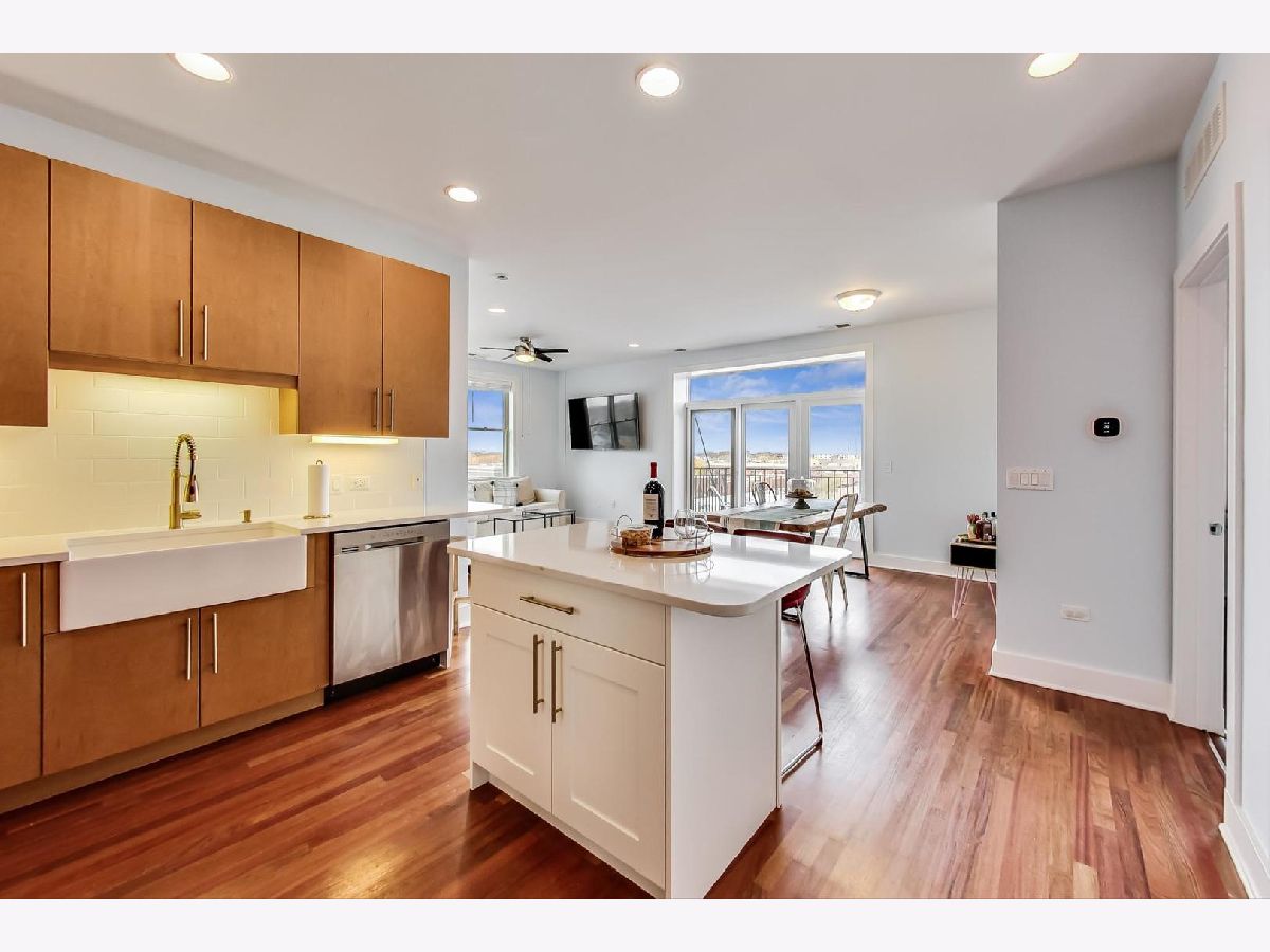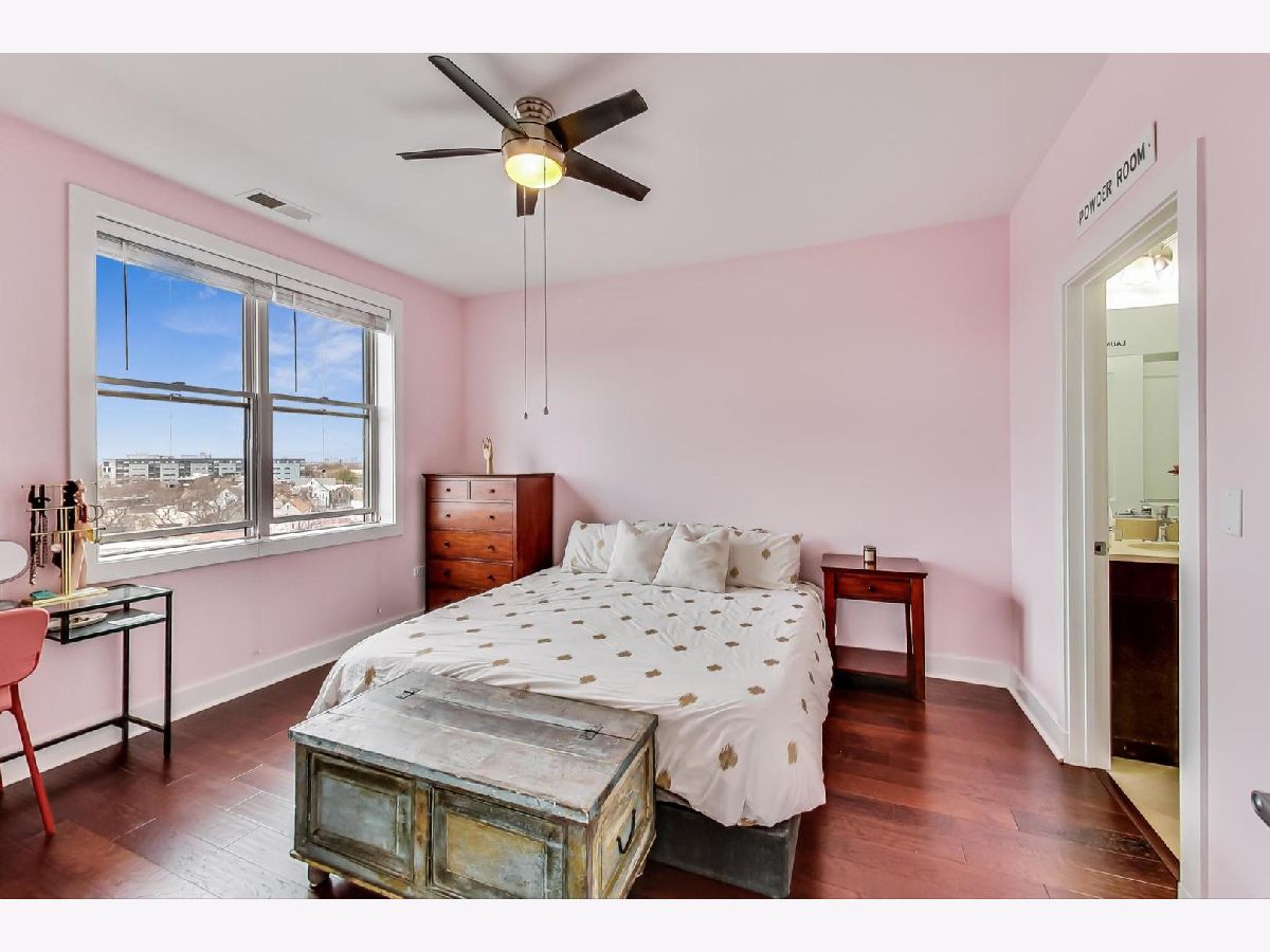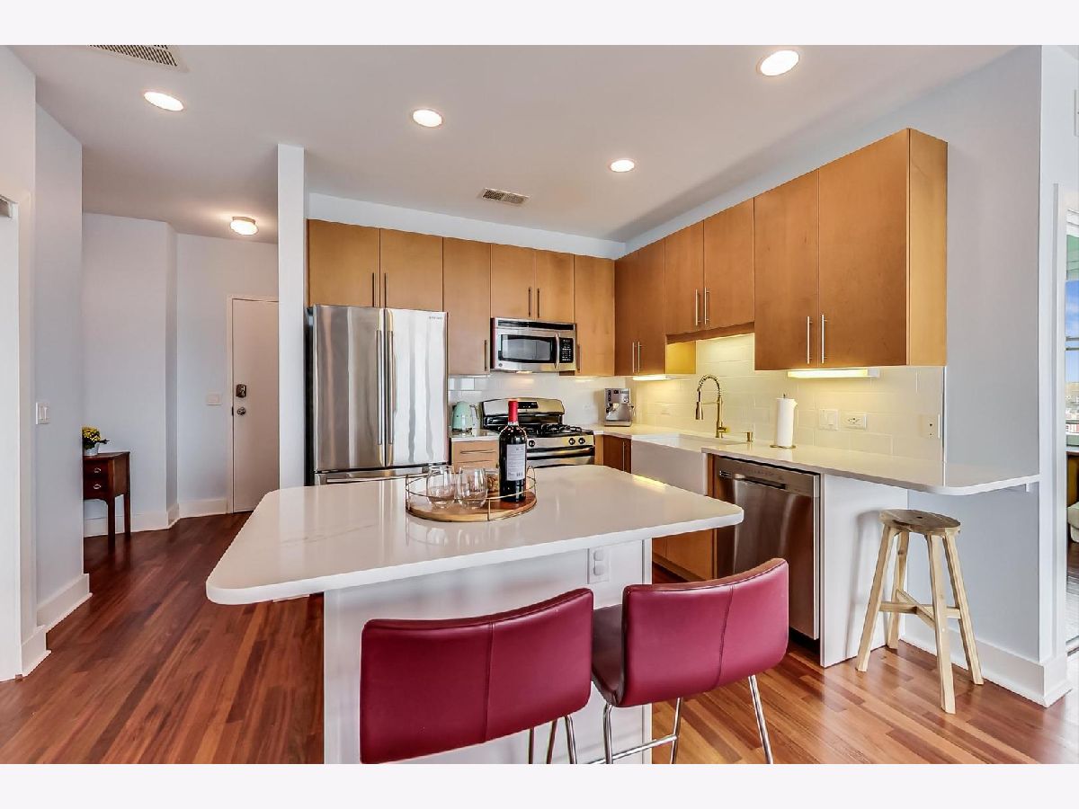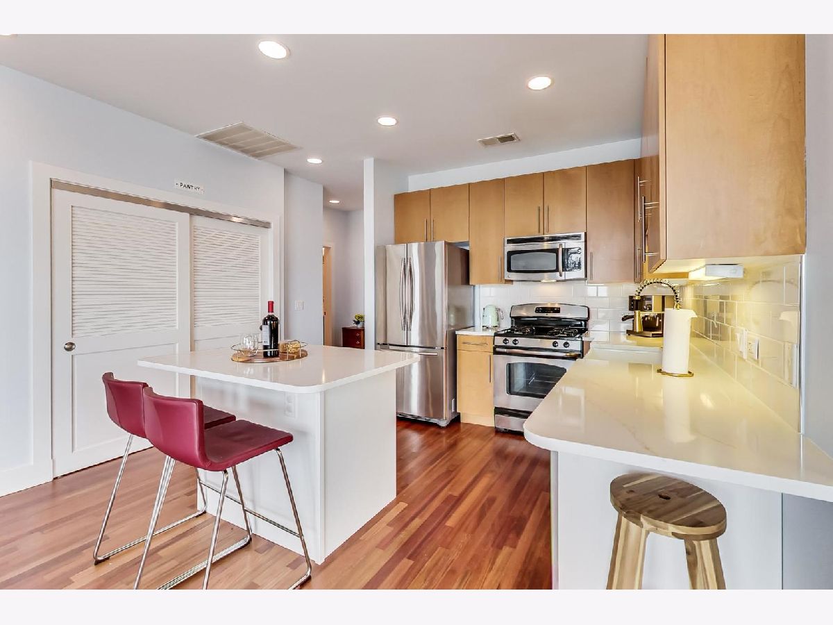 Penthouse corner unit in boutique Logan Square elevator building. This condo is truly unique in the building and gets amazing light above the rooftops with northern AND western exposure. 2020 kitchen remodeling includes brand-new: kitchen pantry, large kitchen island, quartz countertops, subway tile backsplash, fireclay farmhouse sink, brushed gold faucet, soap dispenser, and cabinet handles, and Samsung Dishwasher with third rack for utensils. Classic finishes include maple cabinets and a French-door stainless steel fridge with pullout freezer. Master bathroom suite has double vanity sink, linen closet and brand-new LG Smart W/D with steam technology. Brand-new dark chestnut hardwood flooring in bedrooms, and recently refinished cherry hardwood flooring in the living room, dining room and kitchen. Unit upgraded with ceiling fans, Ecobee Wireless Thermostat and Lutron Caseta Wireless light control. Included in price is extra-wide (largest in the building!) heated garage spot, which can fit both a car and a motorcycle. Brand-new garage shelving makes it perfect for extra storage. Access to massive common deck and party room. Walking distance to California Blue Line and the 606. Best location in Logan Square, close to loads of popular shops, bars and restaurants on Armitage and California.
