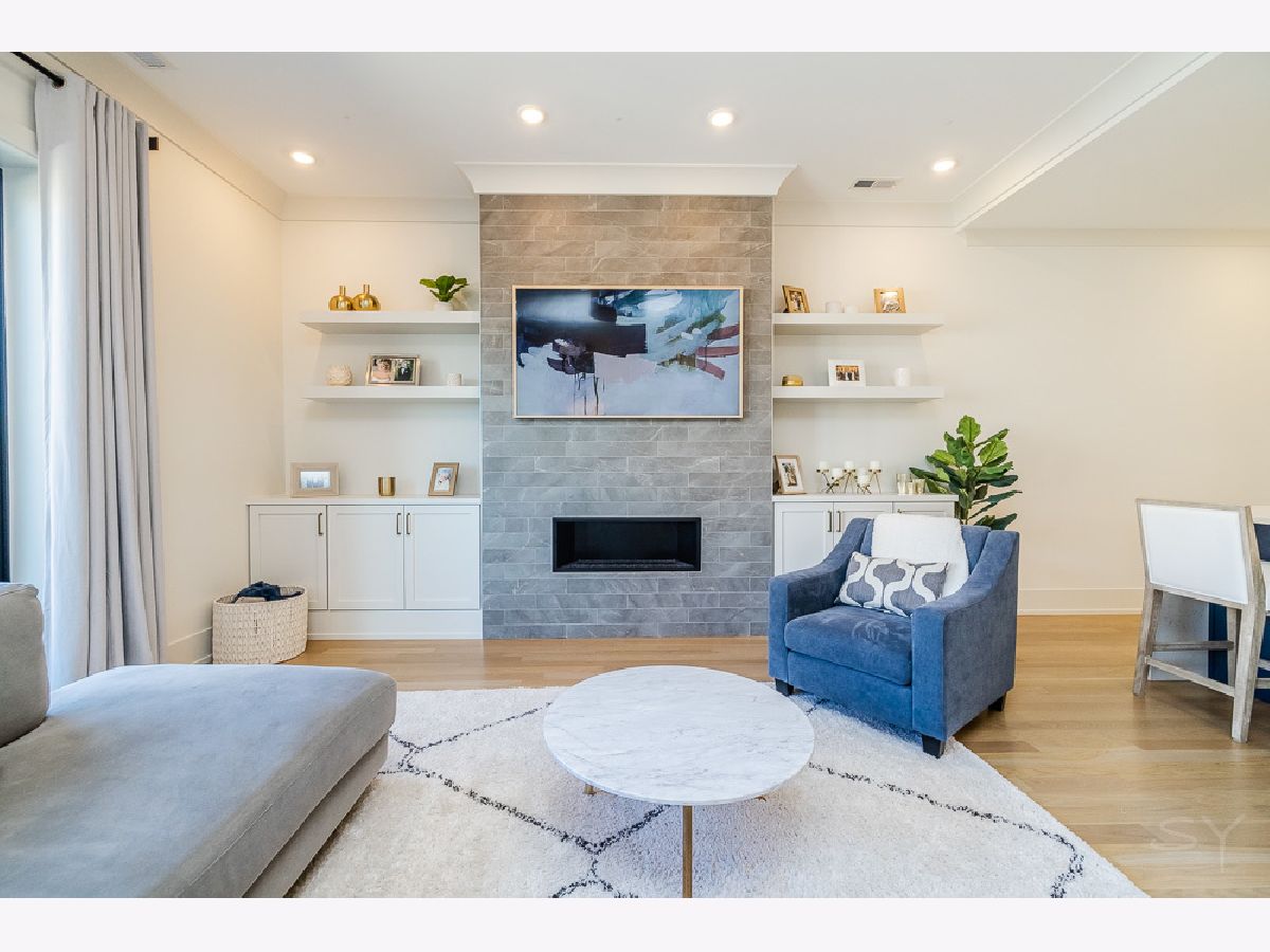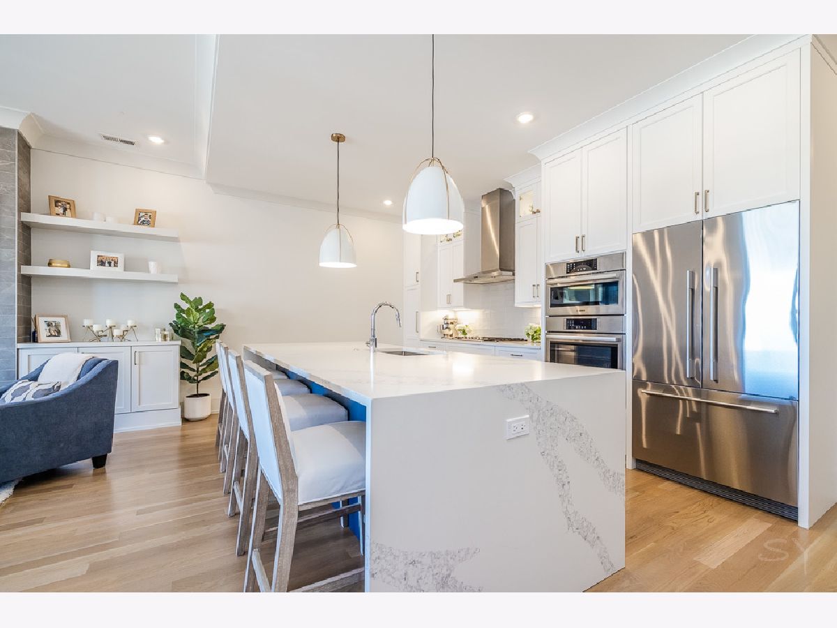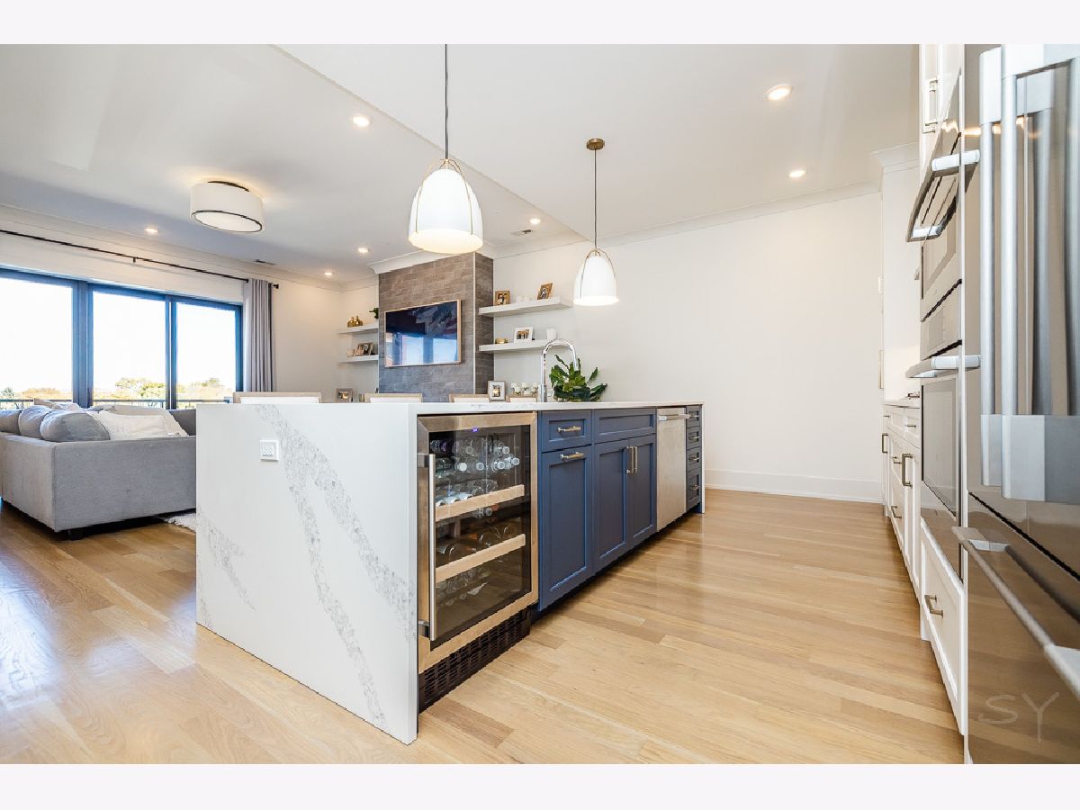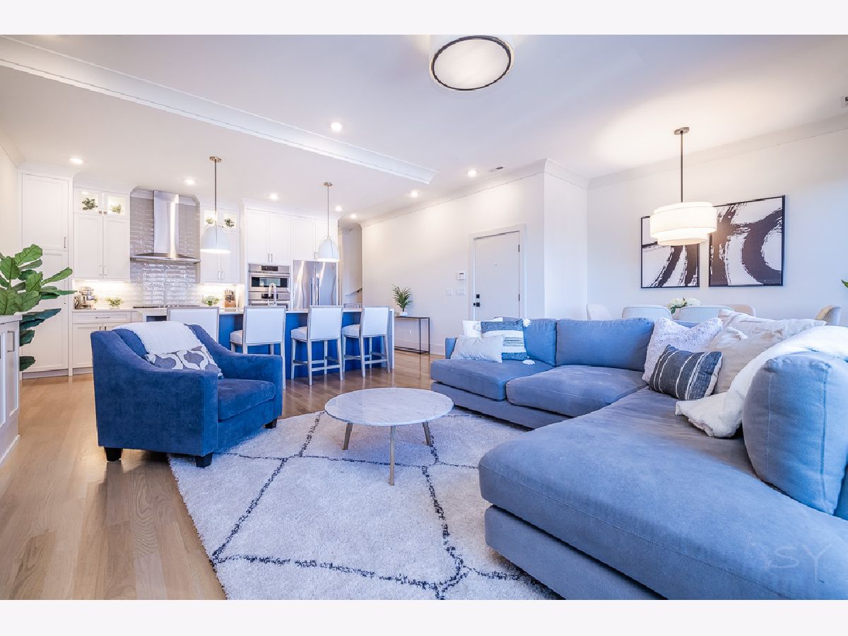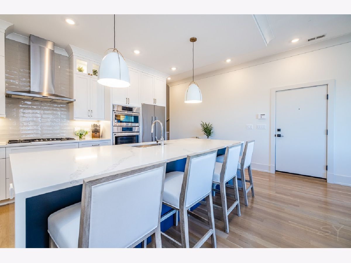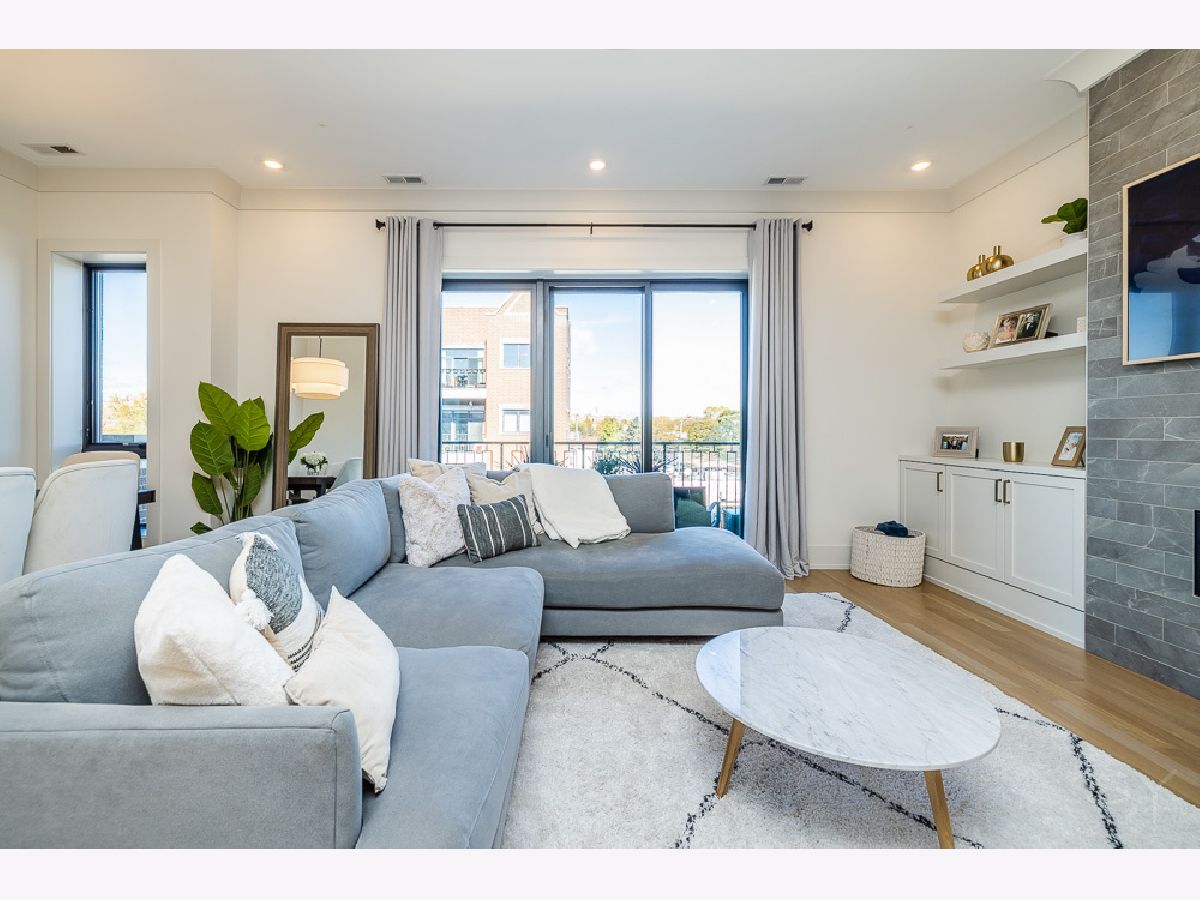 Almost new 3 bedroom 2 bathroom Penthouse featuring amazing outdoor space. Walk into an open Chef's Kitchen with large 10 foot waterfall quartz island. Custom kitchen cabinets and designer fixtures including Bosch and Fisher & Paykel appliances. Two Azure beverage fridges. Large living room with ventless gas fireplace. Separate dining room overlooks the front deck with trex decking. Interior access leads you to a dry bar and out to one of the nicest 1700 square foot private roof top decks you will ever see. The roof deck has porcelain tile pavers and custom turf inlay and custom steel pergola/veranda. Natural gas hookup on front and roof deck with water on the roof deck. The rest of the home is equally as impressive with 8 foot doors, white oak hardwood floors throughout and large bedrooms. Primary bedroom has dual walk in master closets and primary bath includes heated tile floors, double vanity, Mr Steam system, rain shower head, and HansGrohe shower fixtures. Entire home is wired for sound, and has Aprilaire whole home humidifier and de-humidifier systems. Pella windows and additional top level finishes show this builder's attention to detail. Private gate in the rear of building for safe and secure parking in your indoor garage. Nothing like it on the market. Steps to the Square, Trains, River Park, North Shore Channel Trail, the Galter Life Center, and everything the City has to offer.