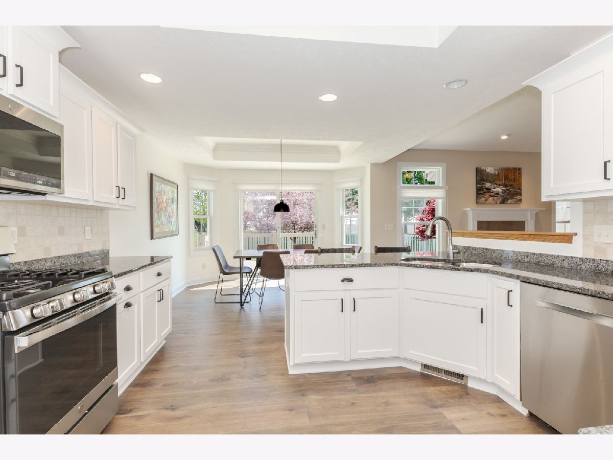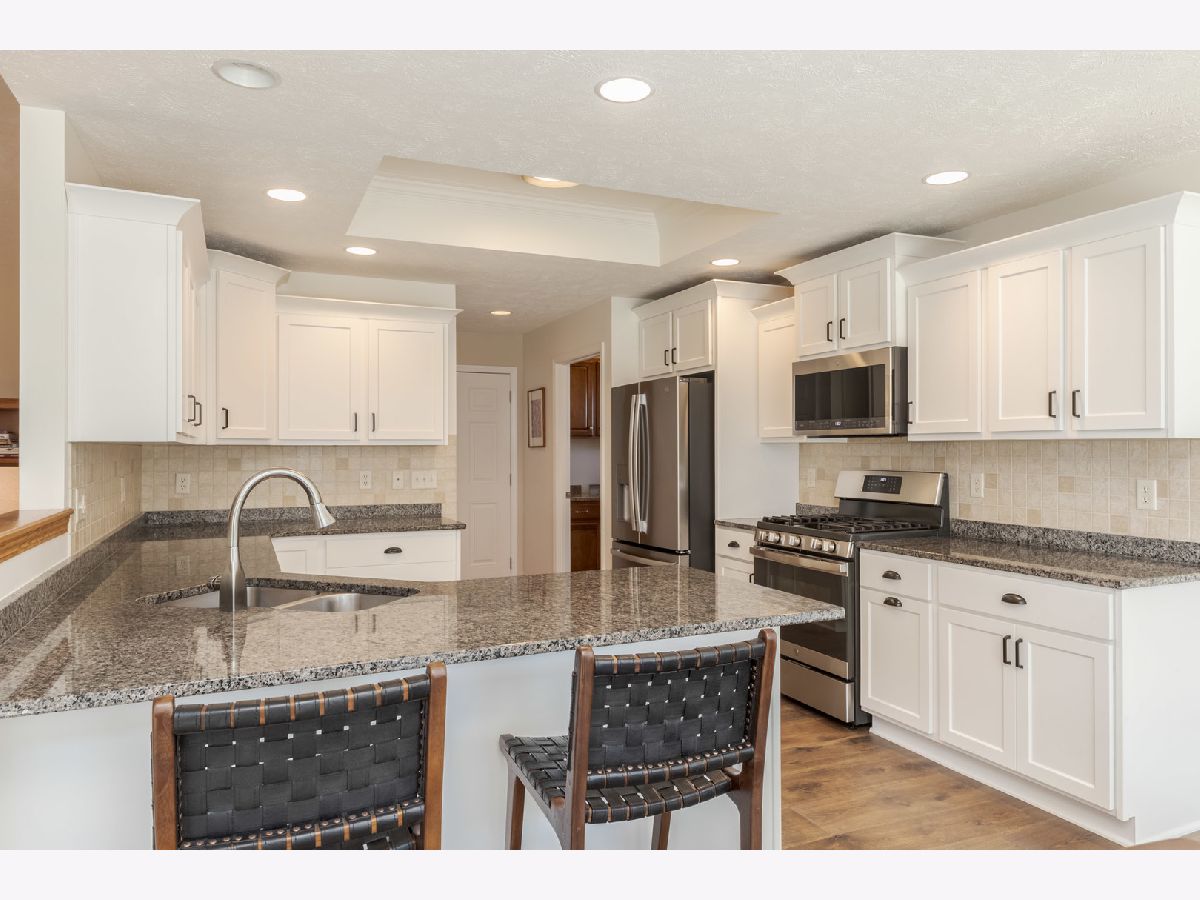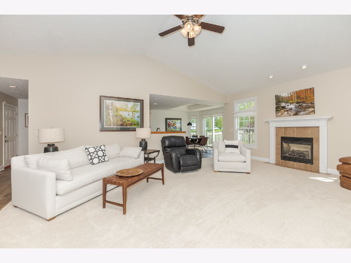 Immaculate Ranch home located in desirable North Bridge subdivision. This home features 3 bedrooms, 2 full bathrooms, and a 3 car garage with eight foot doors. The home flows nicely with an open concept and abundant natural light while the vaulted and multiple tray ceilings adds to the experience. Beautiful luxury wood laminate flooring throughout the majority of the main level was recently installed and new carpet in the family room(2023). The large family room has a gas log fireplace and a vaulted ceiling. The kitchen opens to the eating area and partially to the large family. The primary bedroom is spacious and has a tray ceiling, walk-in closet, and has an updated bathroom with double vanities, soaking bathtub, and a separate shower. The other two bedrooms are of very good size. Convenient first floor laundry. The basement is partially finished with an expansive Great Room with a 9 ft ceiling. There is a rough in for a bathroom and egress windows providing for potential future possibilities. Exceptional space for storage. Outside you will find a 2 tier deck (painted 2023) overlooking the beautifully landscaped yard and mature trees enclosed by a vinyl fence and no backyard neighbors. Radon mitigation system has been installed. So many updates 2023 which include- all windows except one were replaced on the main level as well as the sliding door to the deck, granite countertops installed in the kitchen and all the cabinets/drawers were refaced, new refrigerator 2024, new blinds, primary and second bathroom were completely updated, some fresh paint main level, and the garage doors were recently replaced. Ping Pong table remains.