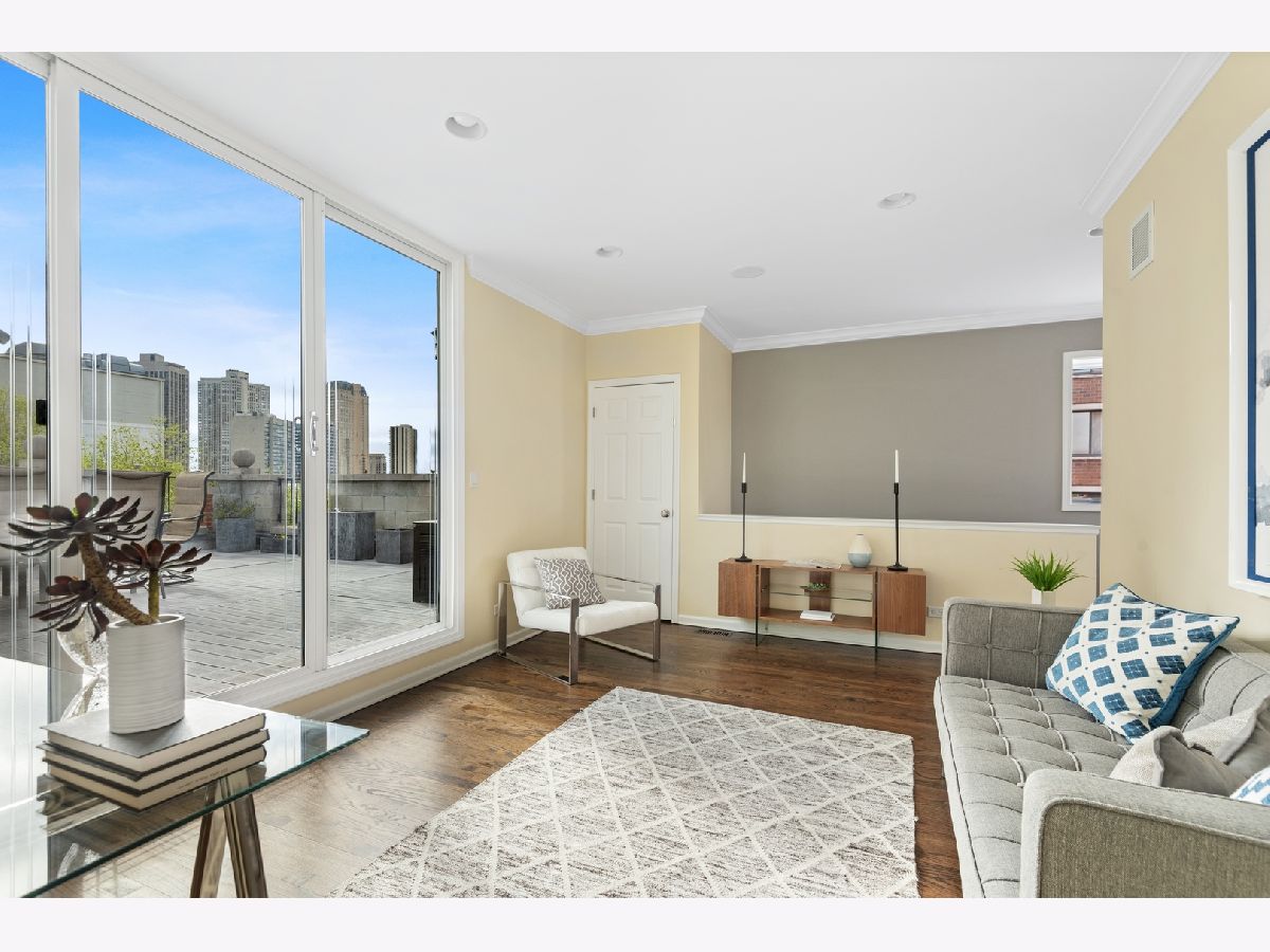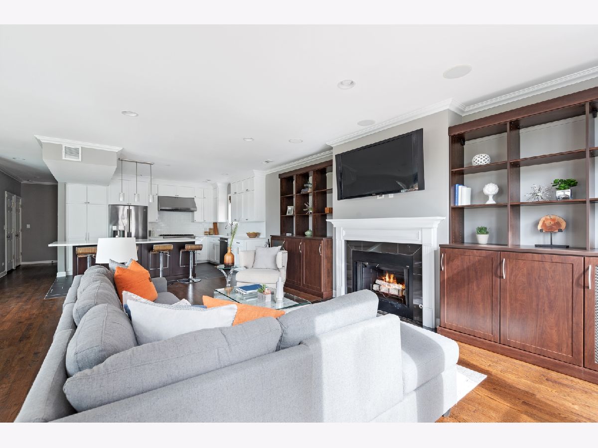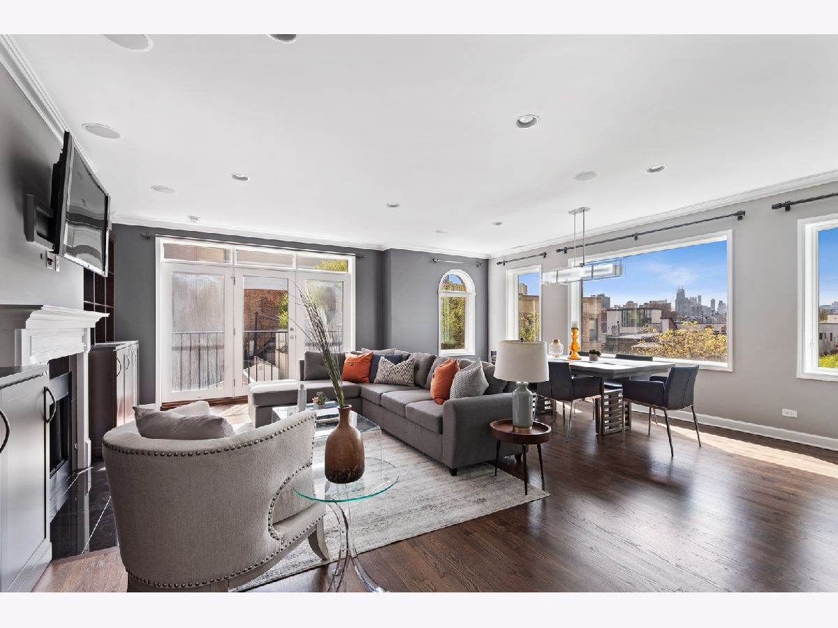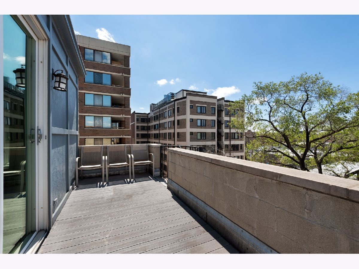 Stunning remodel of this top floor two level home! Gorgeous high quality kitchen and baths, beautifully refinished solid oak flooring, extra large 22' x 22' easily accessible private deck directly off the family room, with sweeping views of the downtown skyline. The living room offers a woodburning fireplace with gas starter, and spectacular unobstructed views to the south of the city. Recessed lighting in the living room and family room, control the Philips Hue bulbs with your smart phone, change the color, warmth, and brightness. Amazing kitchen with custom cabinetry, quartz countertops, and extra large island with seating for five. Three bedrooms plus a large family room which could also function as an office or media room. The living room, family room, master bedroom, and deck have built-in speakers for sound throughout the home. Lots of private outdoor space, check out the floor plan! Perfect location, tucked away on a quiet one block long street, yet steps to Trader Joe's, Mariano's, CTA, and many shops and restaurants nearby. Truly a lovely home, nothing to do but move-in! Click on 'Additional Information' to view/download floor plan.