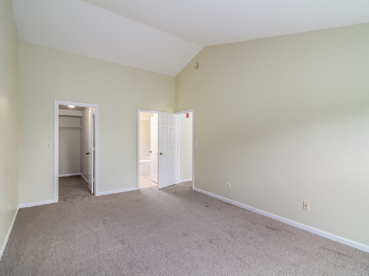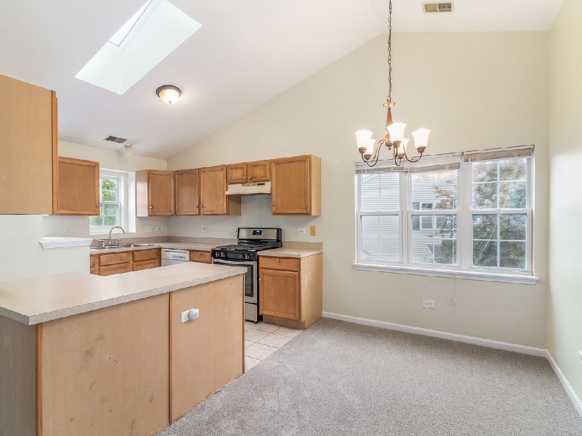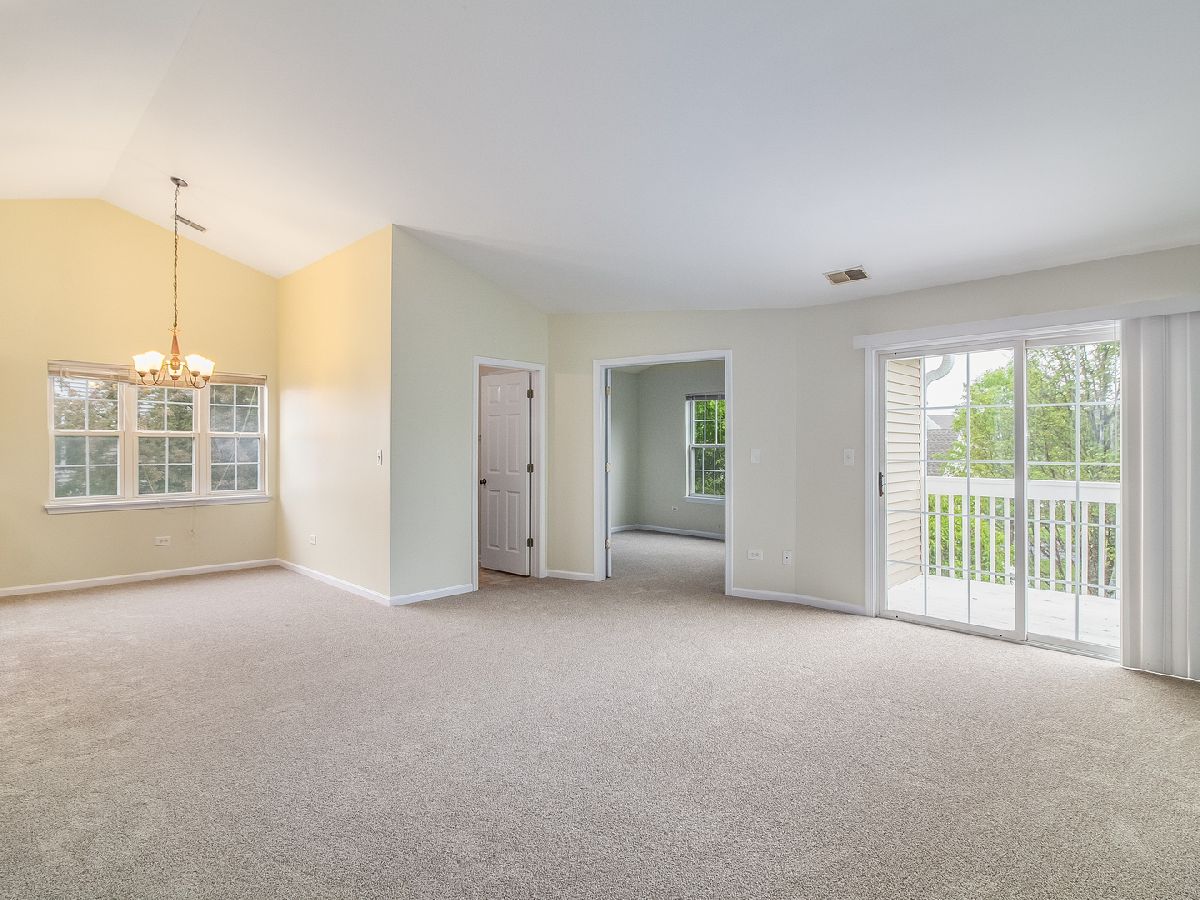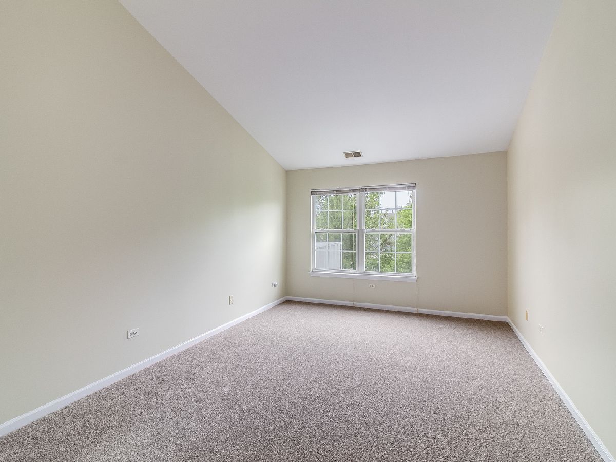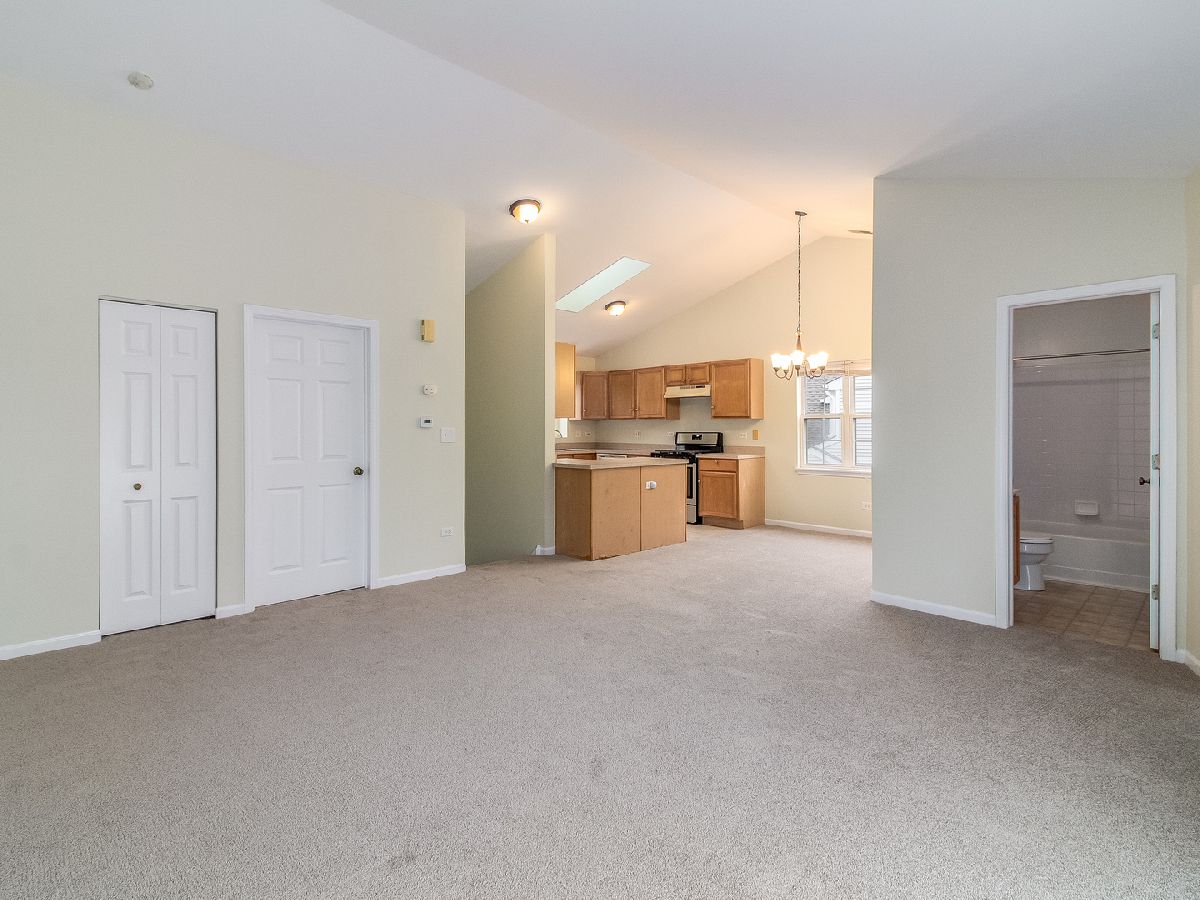 Light and bright 2nd floor ranch end unit with new carpeting and fresh paint! Great floor plan with vaulted ceilings and large living room area with sliding door to private balcony. Efficient kitchen overlooking dining area with oak cabinets & new oven/range. Two bedrooms plus 2 full baths including master suite with huge walk-in closet & full bath with soaking tub & large vanity. Separate laundry room with washer & dryer. Attached 1 car garage. Great location, close to shopping & dining! Highly acclaimed IPSD 204 schools-Neuqua Valley HS! HURRY!