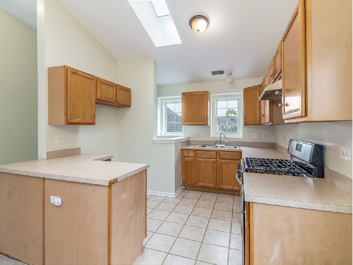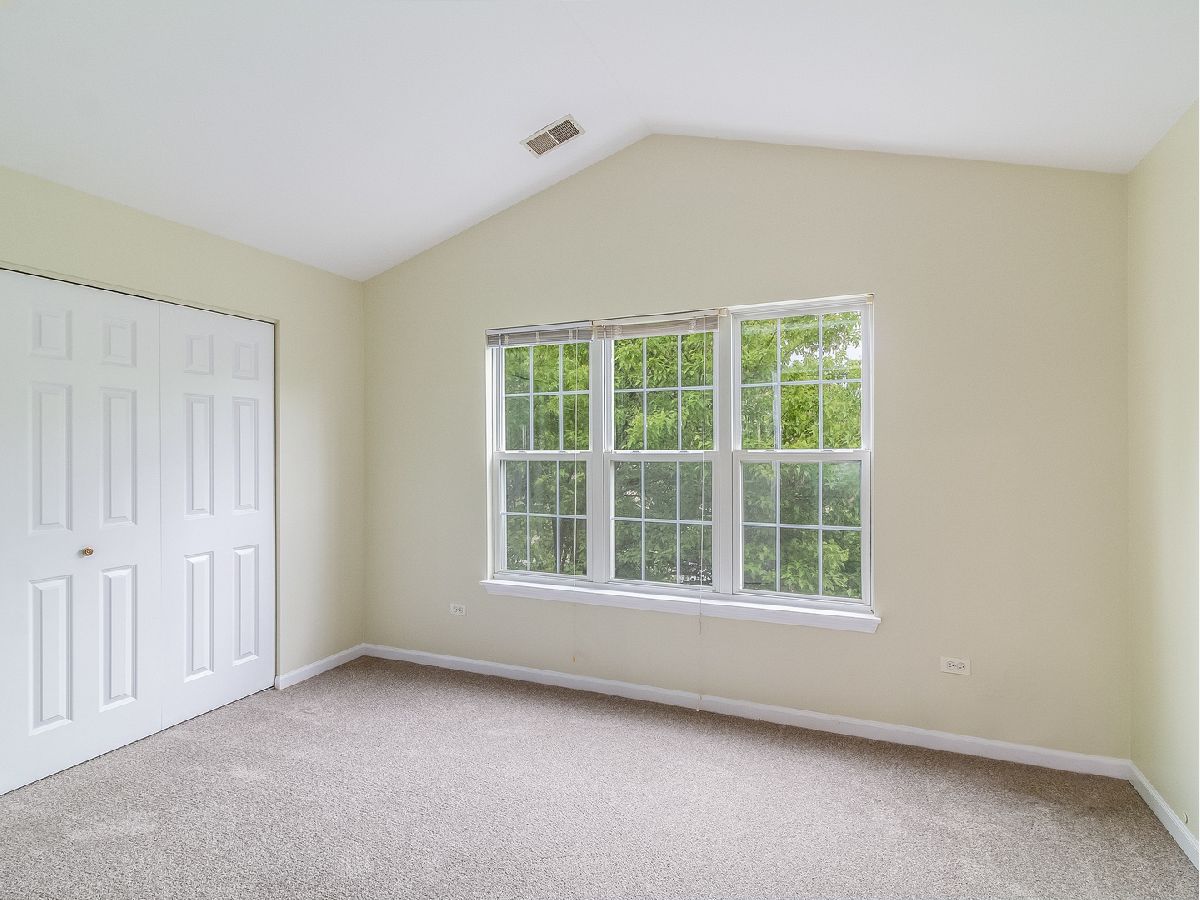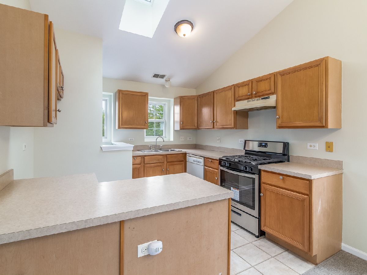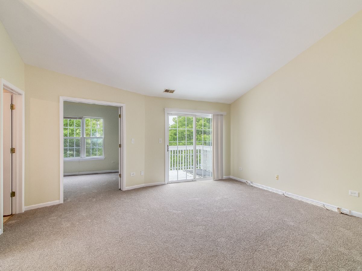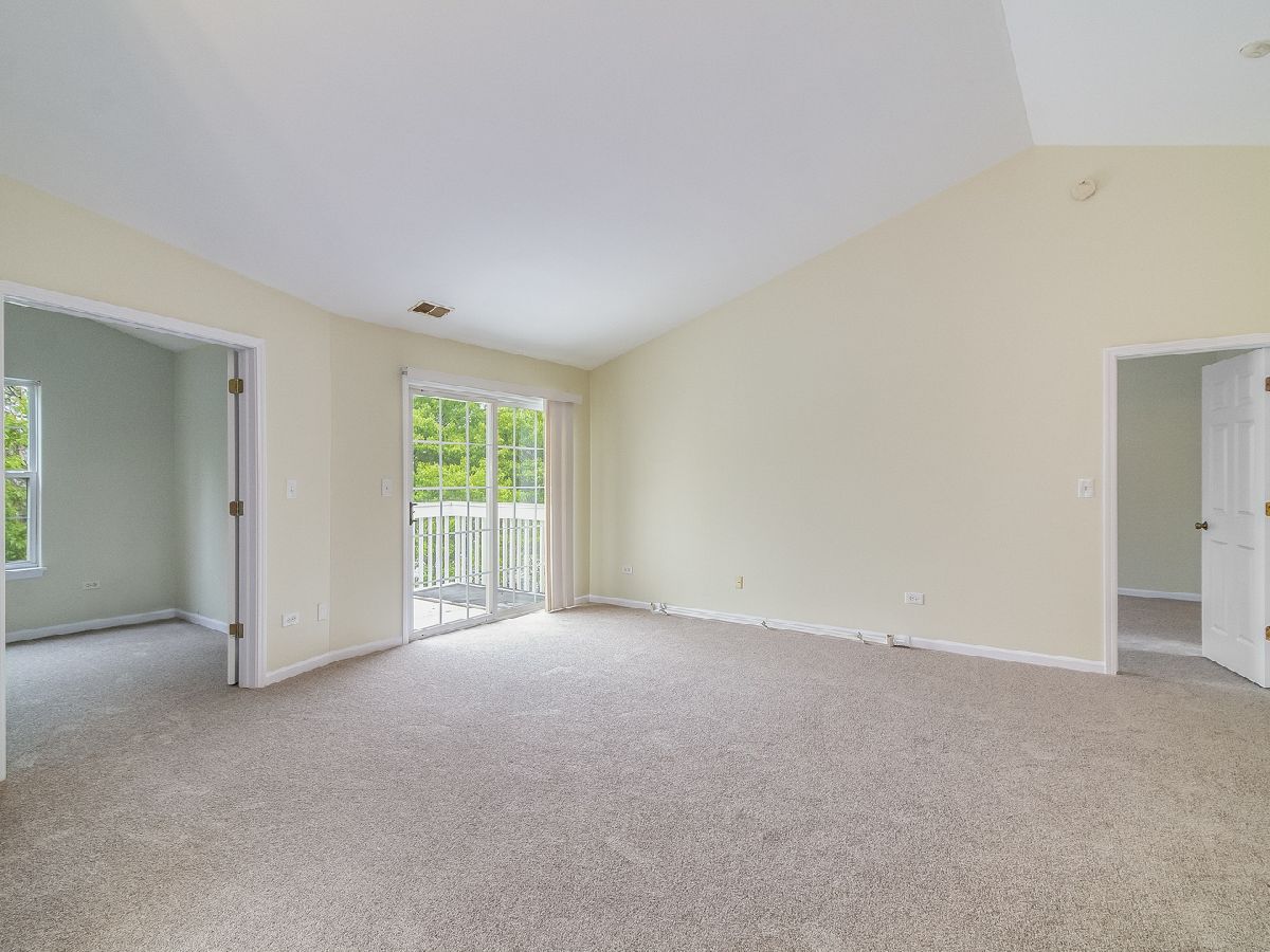Light and bright 2nd floor ranch end unit with new carpeting and fresh paint! Great floor plan with vaulted ceilings and large living room area with sliding door to private balcony. Efficient kitchen overlooking dining area with oak cabinets & new oven/range. Two bedrooms plus 2 full baths including master suite with huge walk-in closet & full bath with soaking tub & large vanity. Separate laundry room with washer & dryer. Attached 1 car garage. Great location, close to shopping & dining! Highly acclaimed IPSD 204 schools-Neuqua Valley HS! HURRY!