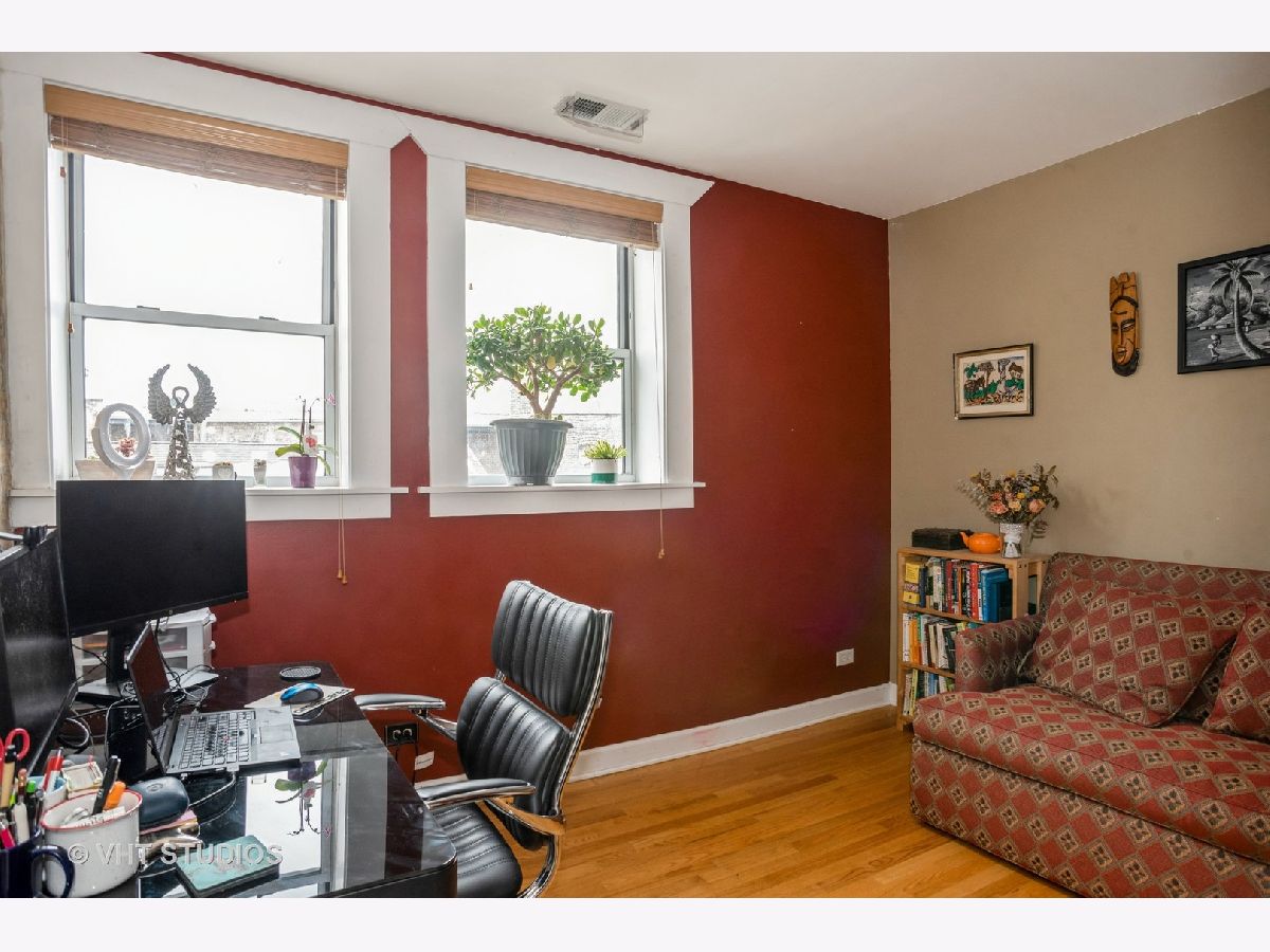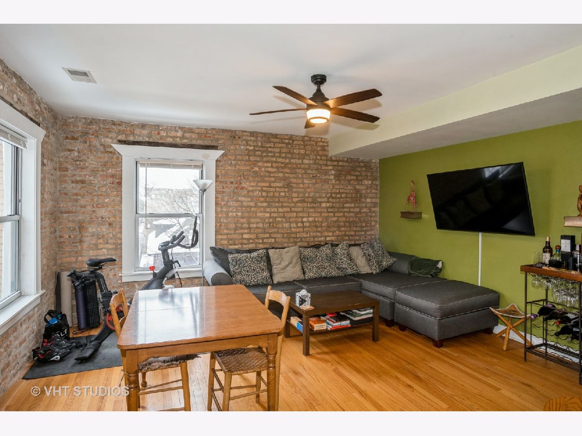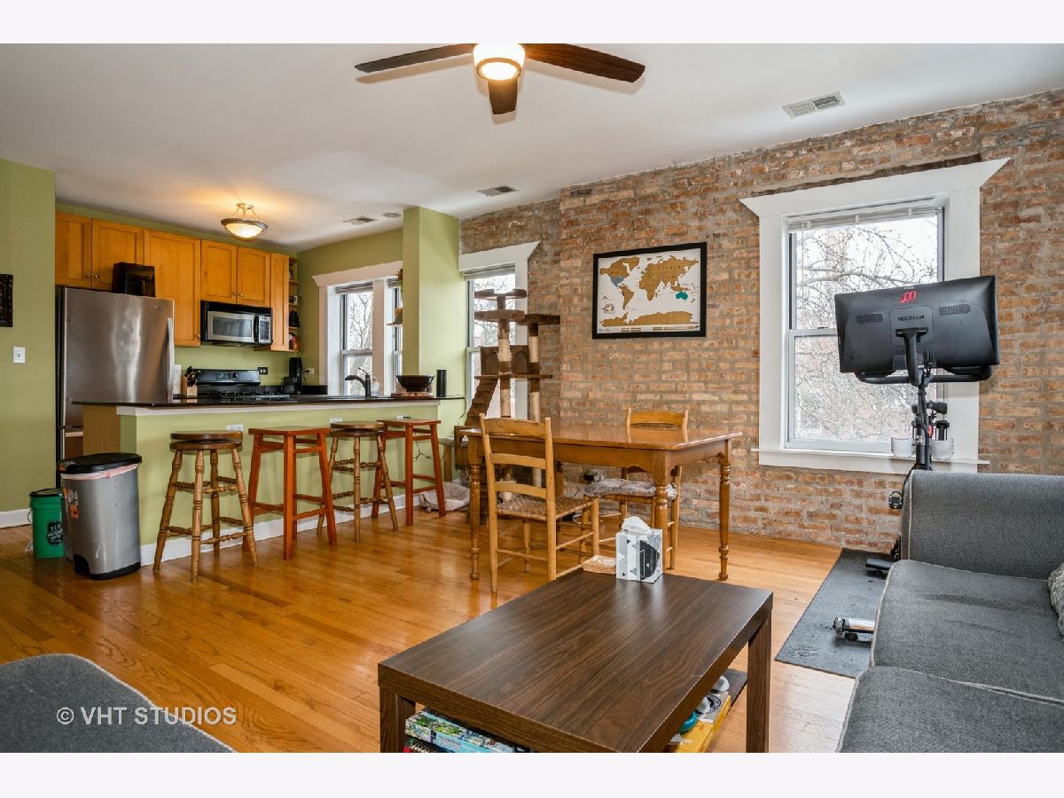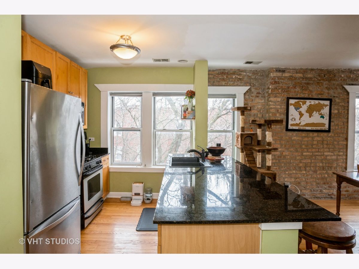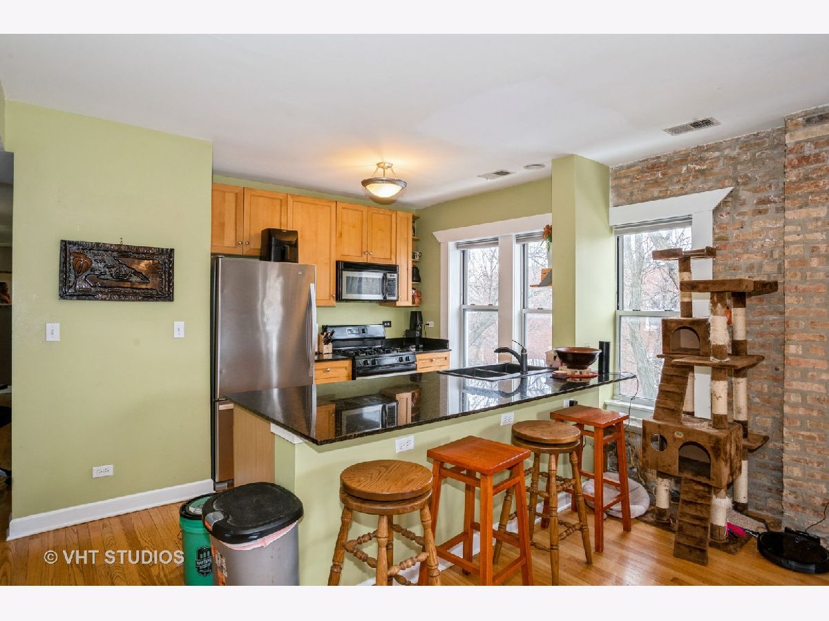 Welcome home to this charming and beautifully maintained 2 bed/ 1 bath home just one block south of Ravenswood Manor! This top floor corner unit offers exposed brick and hardwood floors in every room! Tons of windows throughout. Kitchen with granite countertops, stainless steel appliances, and island/ breakfast bar flows into an open and sunlit living and dining room. Great size bedrooms. Enjoy your South & West facing uncovered deck! Newer HVAC and AC Compressor from 2017. W/D in unit. Exterior parking space included in price plus large storage room in building. Healthy HOA! Level 1+ Elementary School. Less than a 10 minute walk to CTA Brown Line stop. Walk to school, cafes and restaurants on Montrose & Kedzie, Horner Park w/ playground, tennis courts, baseball fields, and more!