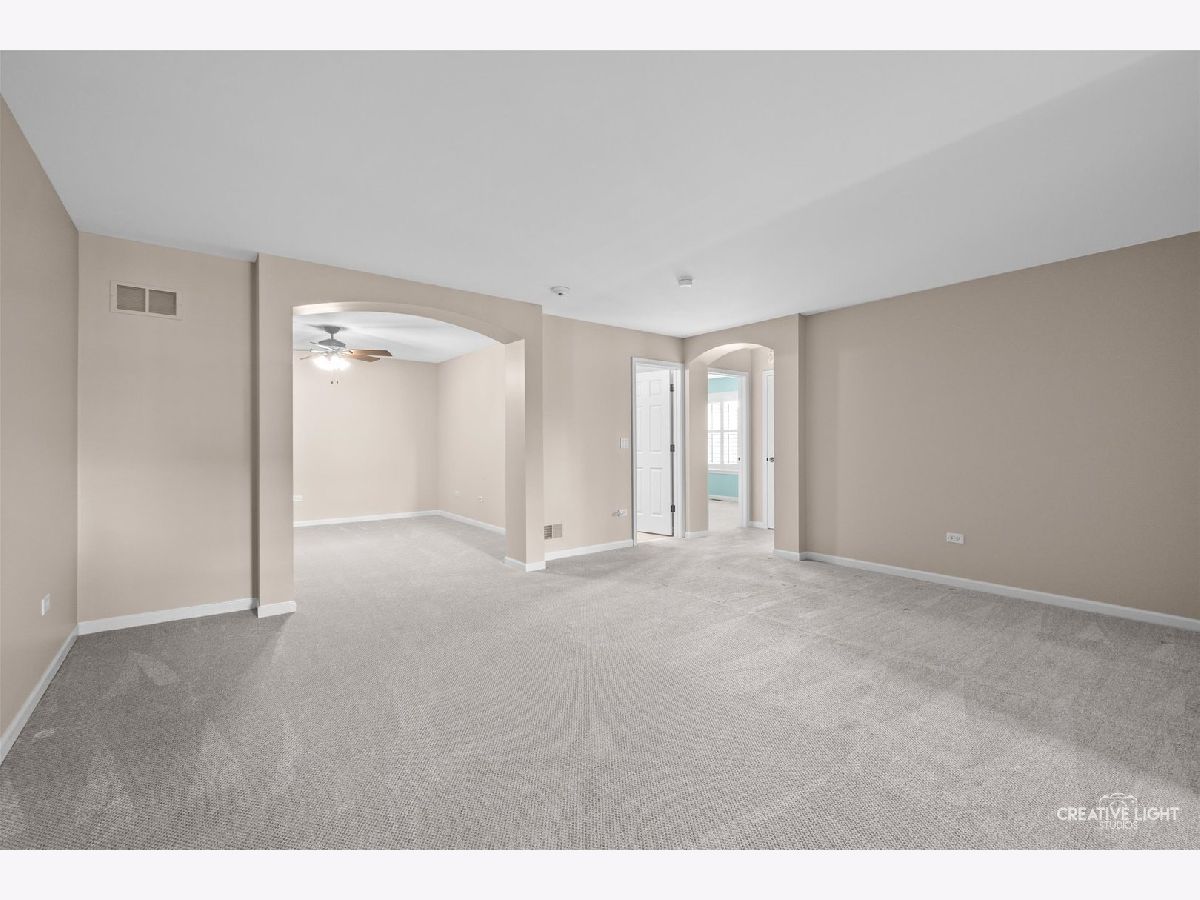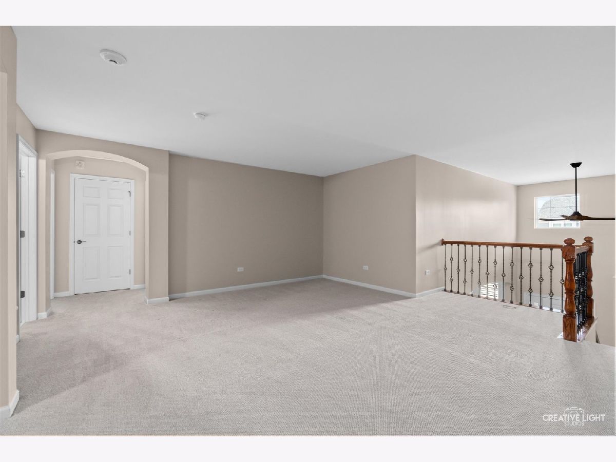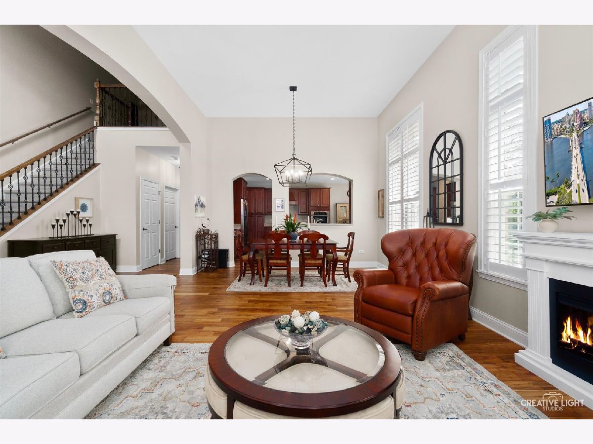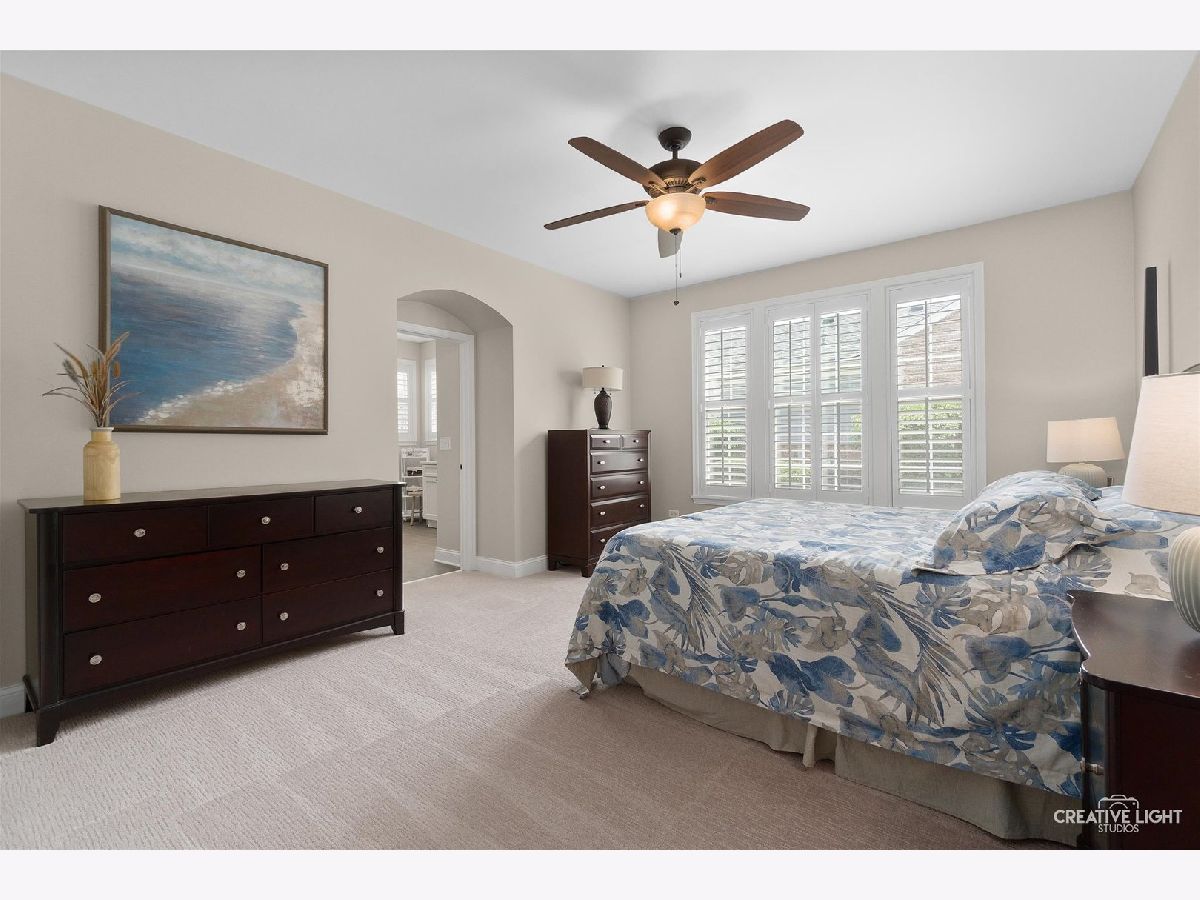 Located in Naperville's prestigious 55+ gated community, this stunning Cannes model END UNIT offers a sun-drenched living space with a coveted private office, FULL BASEMENT, and impressive design elements. Natural light floods the open-concept living and dining areas through a breathtaking wall of windows, highlighting 12-foot ceilings and refined PLANTATION SHUTTERS, adding convenience and timeless charm. The living room is anchored by a remote-controlled fireplace, creating a warm and inviting atmosphere. The upscale design extends throughout, from the custom iron railings, to the upgraded baseboards and 2021 hardwood floors. The designer kitchen includes a massive island, granite countertops, stainless steel appliances, and custom cabinetry, making meal preparation a joy. Step outside to the private patio, perfect for entertaining, with a NEW Sunsetter Shade awning that provides comfort for your outdoor gatherings. Just steps away, the primary suite is a serene retreat, with a walk-in closet featuring built-in organizers and a lavishly REMODELED ENSUITE bath with a spacious glass-enclosed shower, dual sink comfort-height vanity, and ceramic tile floors. One of the standout features is the flexible OFFICE space, adjacent to the loft, providing a quiet, dedicated area for remote work, hobbies, gym, or a fourth bedroom. Two additional bedrooms and a full bath upstairs offer plenty of room for guests. This unit boasts an expansive, DEEP POUR unfinished basement with plumbing rough-in for a future full bath -- offering limitless possibilities to create a workshop, entertainment space with wet-bar, gym, or all three! This MOVE IN READY HOME is enhanced with fresh paint and carpet, along with numerous recent updates, including a 2023 water heater, a 2022 humidifier, a 2024 garage door with new springs, and a sump pump with backup system (both 2023). Additional upgrades include 2024 tuckpointing on the exterior brick and a Radon Mitigation system for peace of mind. Located in the highly sought-after Carillon Club, residents enjoy resort-style amenities, including a newly renovated 18,000 SF clubhouse, indoor and outdoor pools, a fitness center, tennis courts, garden plots, golf, and much more. Enjoy the convenience of nearby shopping, restaurants, entertainment, and easy access to downtown Naperville and the Metra. This home seamlessly combines luxury and convenience, with standout features like a private office, custom Plantation shutters, and a full basement ready for your vision!