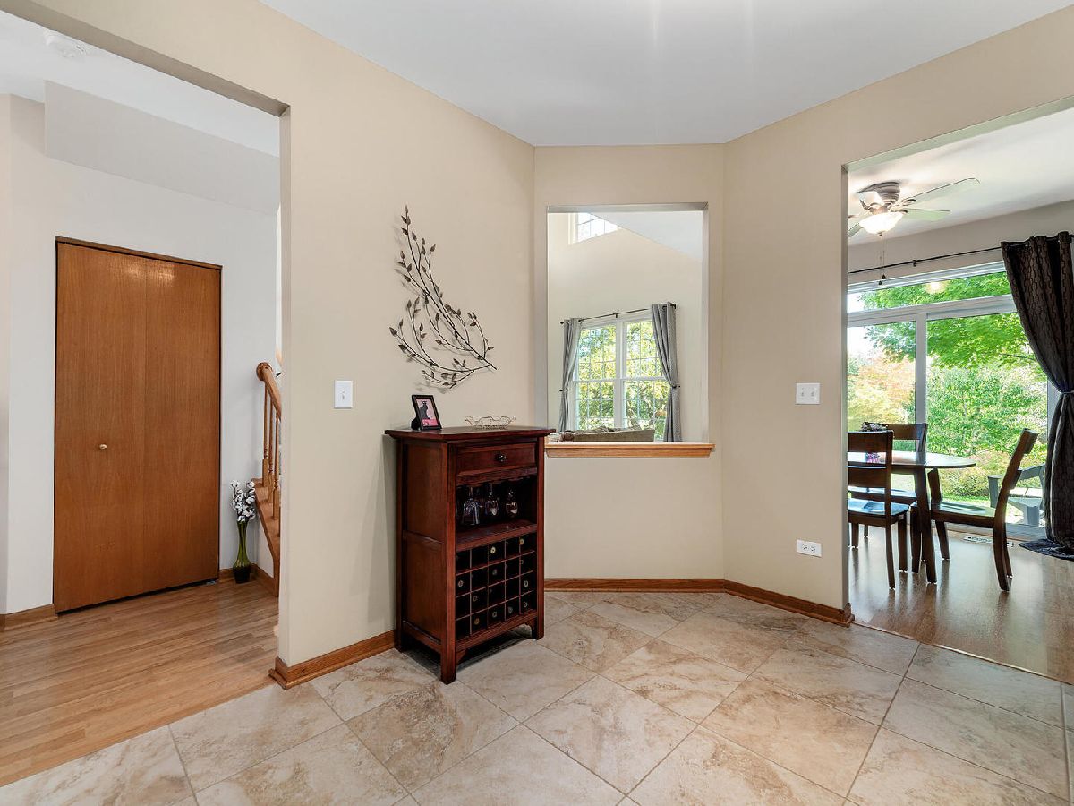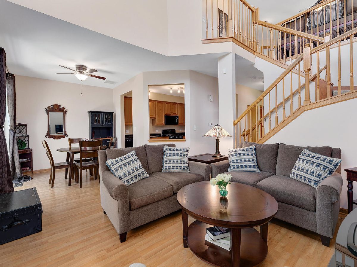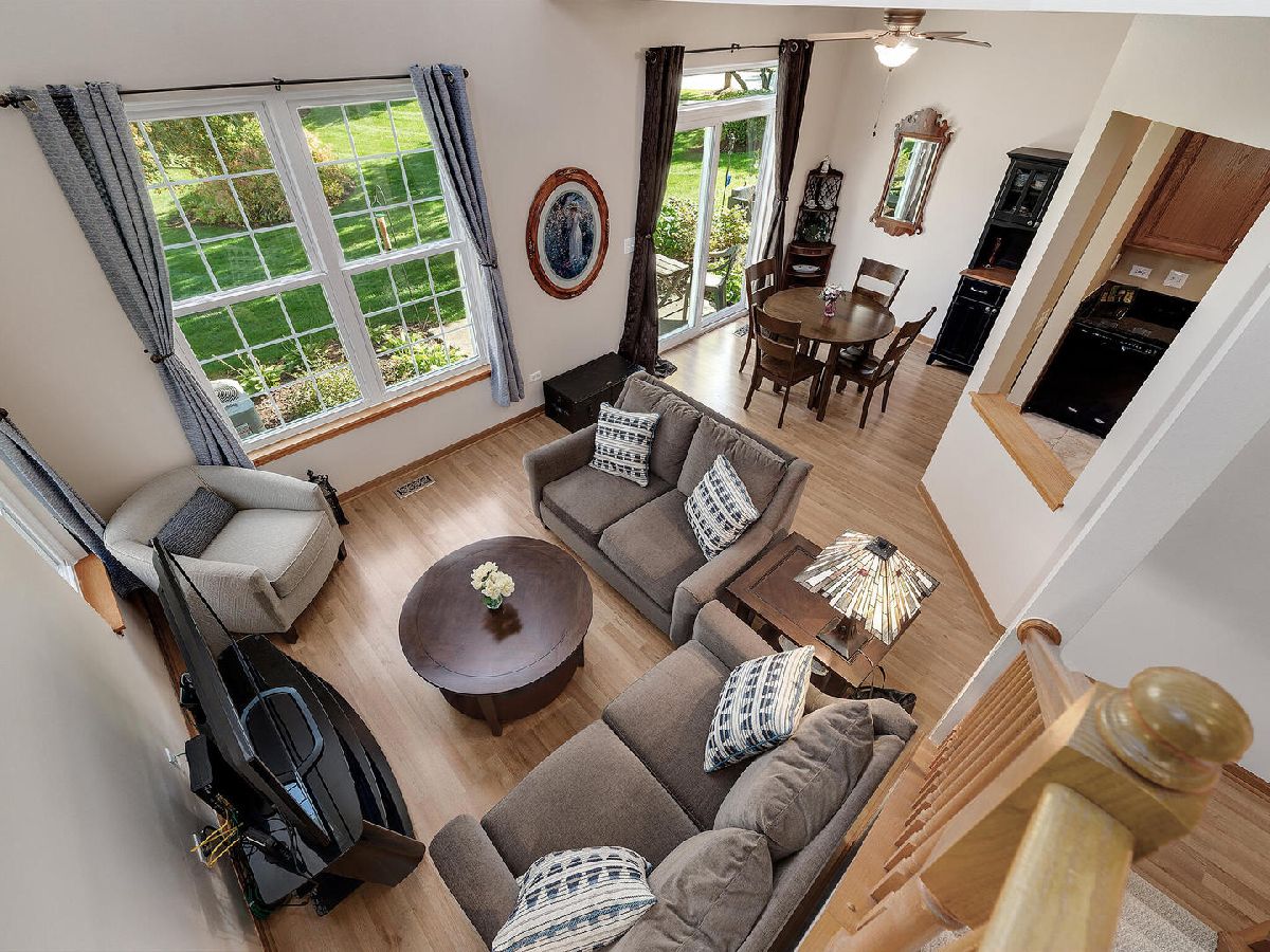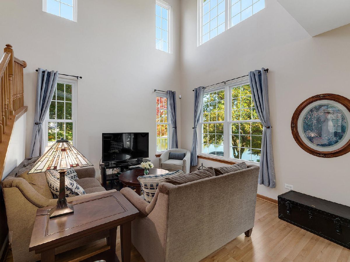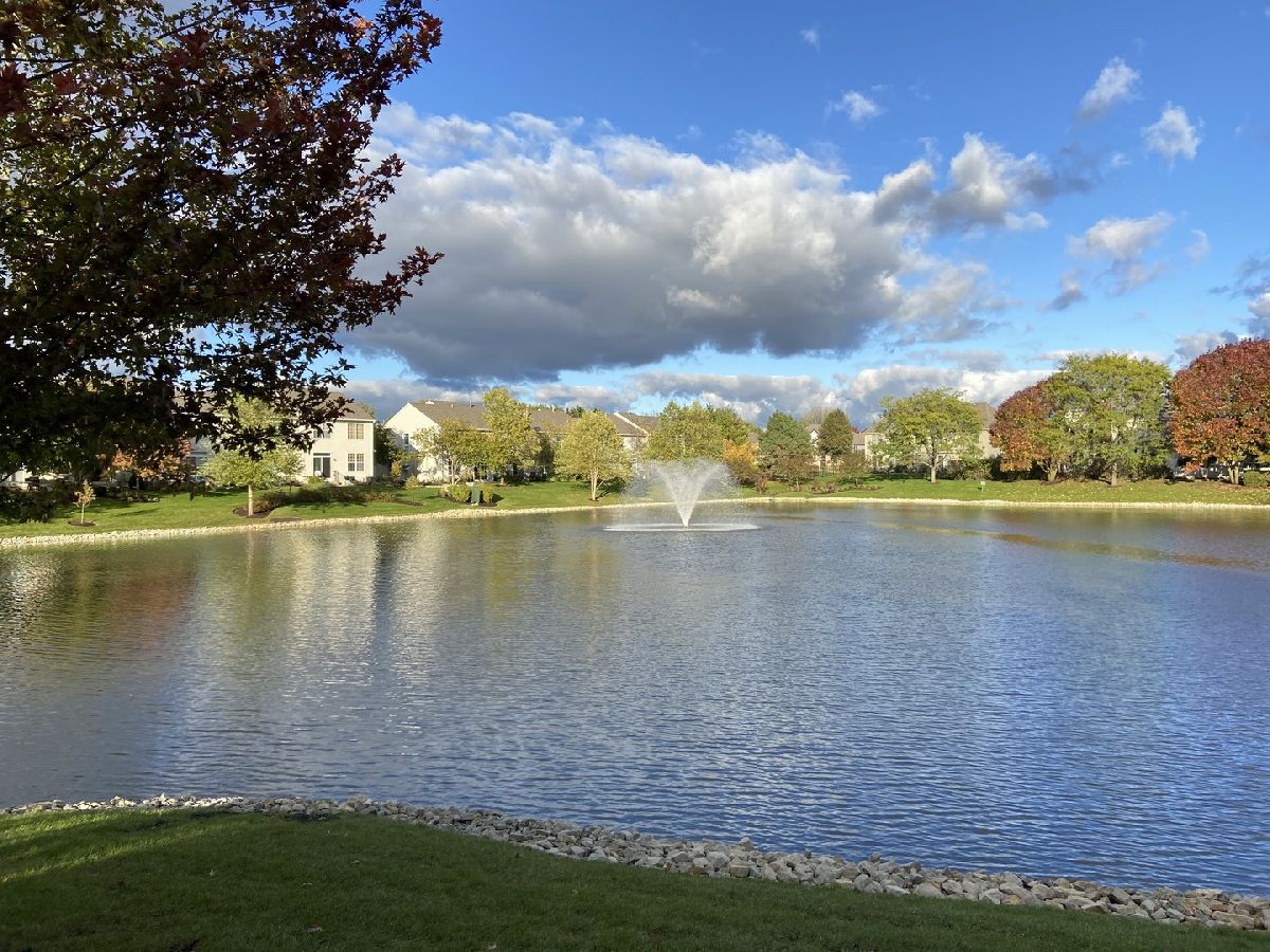 Highly desired 2 bedroom plus loft, 2.1 bath end unit town house with breathtaking water views will exceed your expectations. Neutrally painted in 2019 with newer sunlit filled windows and sliding glass door leads to the patio. Beautiful new wood laminate flooring in foyer, 2 story living room, dining room, both bedrooms and loft which is currently used as a family room (2018). Eat-in kitchen has 42 inch cabinets and newer appliances, granite counters and 18 inch ceramic tile flooring (2019), kitchen sink and faucet (2018) and pantry. Master bedroom has cathedral ceilings, walk-in-closet and updated master bath with walk-in shower (2020). First floor laundry room with newer full size washer and dryer, furnace, humidifier (2014). Additional updates include newer roof and siding (2018), sealed driveway and garage door opener (2021), microwave and custom storm door (2020), berber carpeting on stairs and window treatments (2018), central air (2014) and powder room. Large two car garage. This 2nd largest town house in Windridge subdivision offers you peace, serenity and tranquility along with outstanding nature and water views. Award winning school district 204 includes highly sought-after Neuqua Valley High School. Ideal location near Metra, restaurants and shopping.