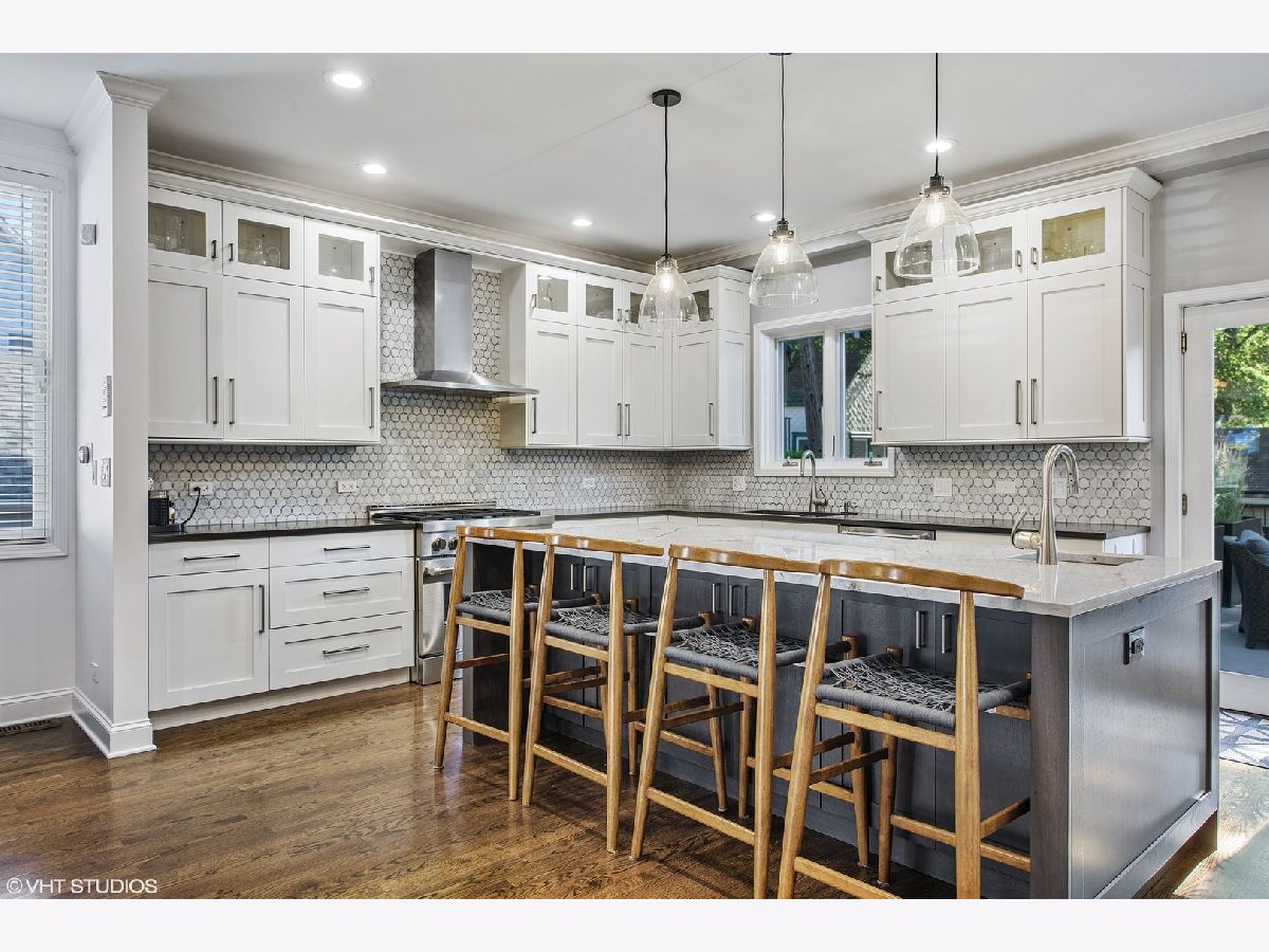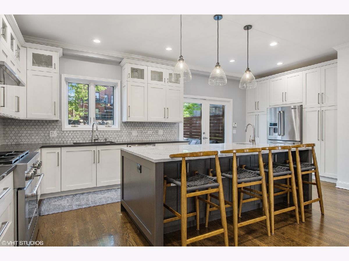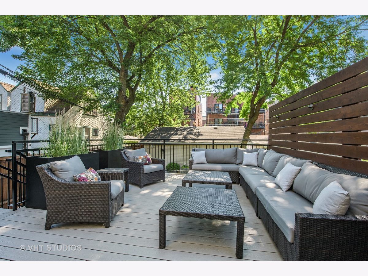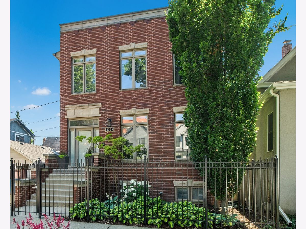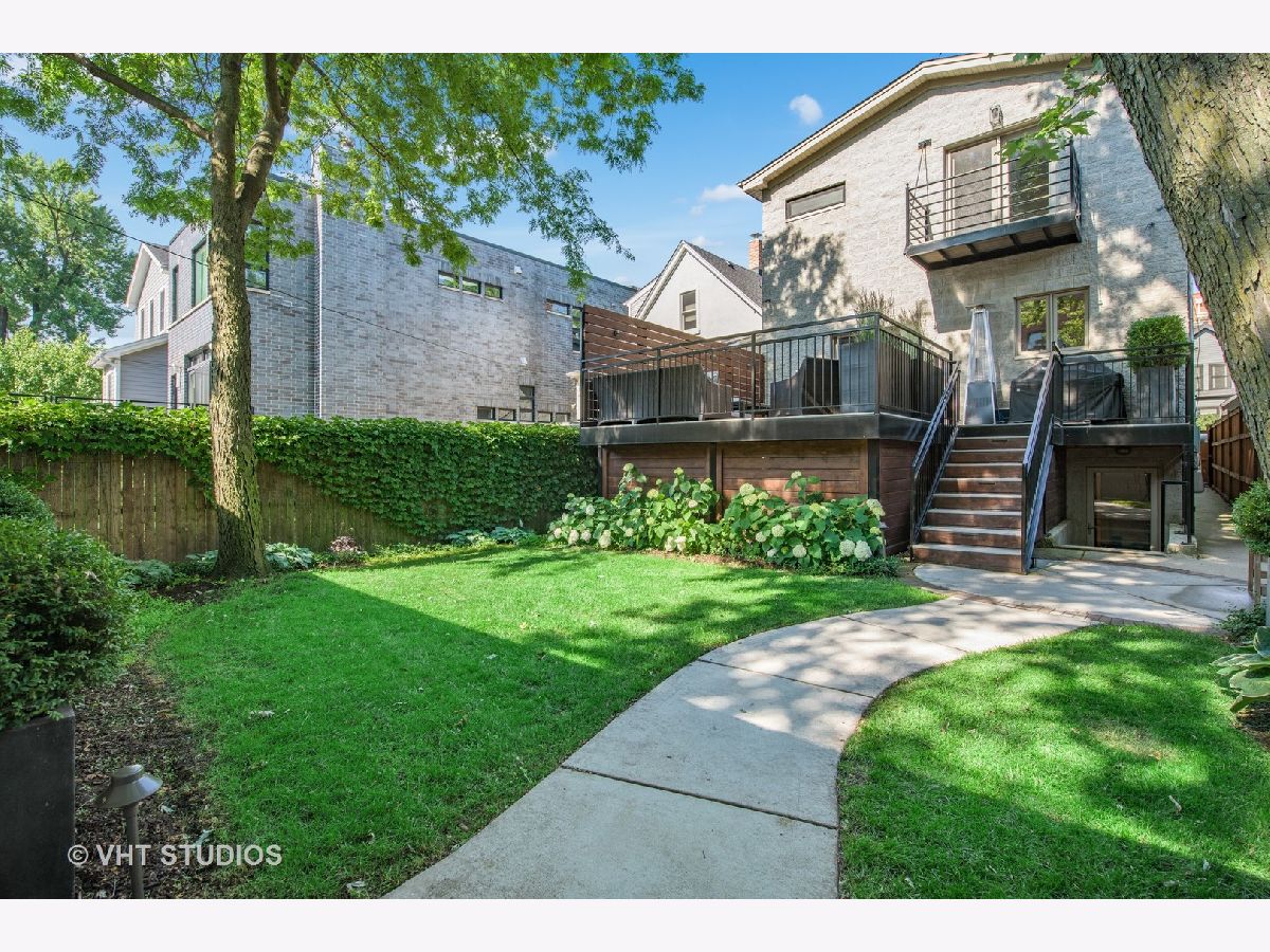 Wide lot with great yard! Style abounds in this recently renovated 4 bedroom/3.1 bathroom home with 2.5 car garage and spectacular outdoor space on a wide lot in the heart of Roscoe Village, moments from Hamlin Park. Upon entering this home, you are met with a spacious and stunning open-concept living/dining room that features tall ceilings, custom millwork, recently refinished hardwood floors, and recessed lighting. The living room has a custom built-in desk with storage and is anchored by a fireplace with gas starter, custom mantle, and mosaic surround. The dining space has enough seating for a table of 8+ and flows seamlessly into the fully upgraded and renovated chef's kitchen with custom white cabinetry, quartz counters, mosaic tile backsplash, top-of-the-line Jenn-Air Pro Series appliances, island with quartzite counters, breakfast bar, built-in wine refrigerator, microwave, and prep sink. Outside, a large Trex deck is perfect for outdoor living/dining and the professionally landscaped backyard is sublime with built-in sprinklers, Luxor landscape lighting system, and mature trees. Upstairs, the owner's suite is a true retreat with vaulted ceilings, French doors that flood the room with light and lead to a private Juliette balcony overlooking the backyard, newer carpet, and a walk-in closet with custom shelving. The spa-like bathroom has a skylight, walk-in rain shower with marble tile, and dual vanities. Rounding out this level are two additional bedrooms and a full bathroom with a soaking tub. Downstairs, the lower level has a recently renovated and generously sized family room with fireplace with herringbone surround and gas starter. A fourth bedroom, full bathroom with soaking tub, and recently renovated laundry room complete this level. Additional features include: Brand new roof (2020), sealed and tuckpointed (2017), all bathrooms upgraded and renovated throughout, built-in surround sound, built-in cabinetry in mudroom, Closet Works custom closet systems, and Trex decking on deck and Juliette balcony. This home is perfectly situated in Roscoe Village with close proximity to schools, Hamlin, Fellger, and Chi Che Wang parks, Kennedy Expressway, multiple public transportation options, Target, Costco, Whole Foods, and all of the wonderful restaurants and bars Roscoe Village has to offer!