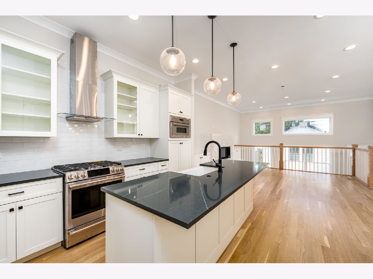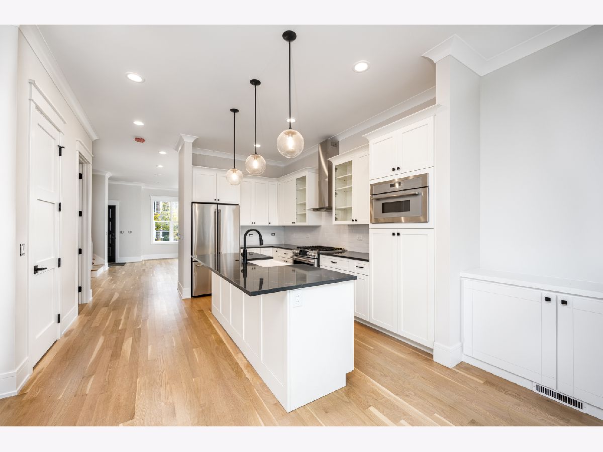 Gorgeous newer construction 5 BEDROOM home in Avondale just steps to Logan! Wide open floor plan with windows at every turn, tall ceilings, and beautiful finishes throughout. Main floor features 10ft ceilings, wide plank white oak floors, & 8ft 3-panel interior doors. Kitchen is a culinary destination! Big island anchored by farm sink and custom lighting - perfect for multiple barstools. GE & Thermador appliances, walk-in + reach-in pantries, lightly veined exquisite black quartz tops, neutral white shaker cabinets with glass panel accent doors and bronzed pulls. White tiled backsplash, vented professional hood, room for an eat-in table, and perfect circular flow to complete the heart of the home. Main floor also features a spacious dining area with custom bookshelves, living area with quartz wrapped fireplace, and powder room adjacent to it all. Top floor offers 3 beds up, laundry room, sizable hall bath, & vaulted ceilings. Large primary suite has custom walk-in closet, bath with 2x vanity, huge oversized shower, and private WC. Lower level has massive rec room with wet bar and beverage center, 4th & 5th beds, hall bath, and big mech/storage room. Dual zoned, 2 car garage, rear yard, all Hardie exterior w/ greystone accent, and patio. Very lightly lived in and steps from one of the hottest stretches of Milwaukee Ave that's a short walk to heart of Logan, CTA Blue line, and offers quick access to 90/94. Welcome Home!