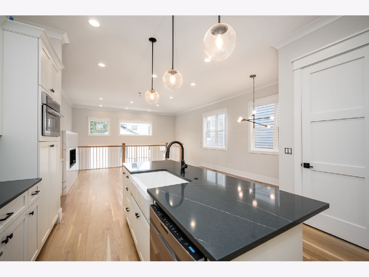 Gorgeous new construction home in Avondale just steps to Logan! Wide open floor plan with windows at every turn, tall ceilings, and beautiful finishes thru-out. Main floor features 10ft ceilings, wide plank (real) white oak, & 8ft 3-panel interior doors. Kitchen is a culinary destination! Big island anchored by farm sink and custom lighting - perfect for multiple barstools. GE Cafe & Thermador appliances, walk-in + reach in pantries, lightly veined exquisite black quartz tops, neutral white shaker cabinets with glass panel accent doors and bronzed pulls. White tiled backsplash, vented professional hood, room for an eat-in table, and perfect circular flow to complete the heart of the home. Main floor also features spacious dining area with custom bookshelves, living area with quartz wrapped fireplace, and powder room adjacent to it all. Top floor offers 3beds up, laundry room, sizable hall bath, & vaulted ceilings. Large primary suite has custom walk-in closet, bath with 2x vanity, huge oversized shower, and private WC. Lower level has massive rec room with wet bar and beverage center, 4th & 5th beds, hall bath, and big mech/storage room. Dual zoned, 2 car garage, rear yard, all Hardie exterior w/ greystone accent, and patio. So close to sooooo much! 10 min walk to heart of Logan and CTA Blue line, 4min walk to Hopewell Brewing/Dill Pickle Coop/WalkIn. Quick access to 90/94 - right between downtown & O'Hare. Beautiful home at a great price!