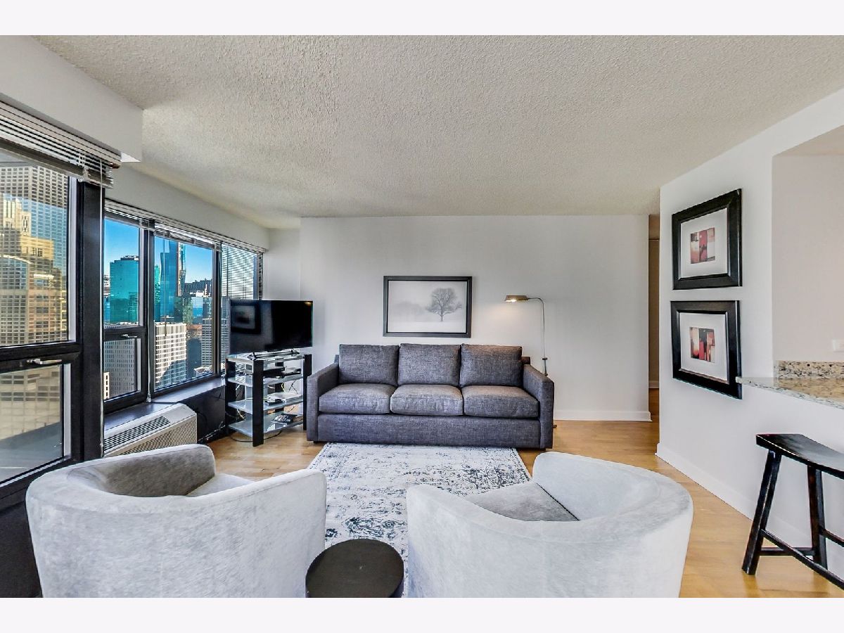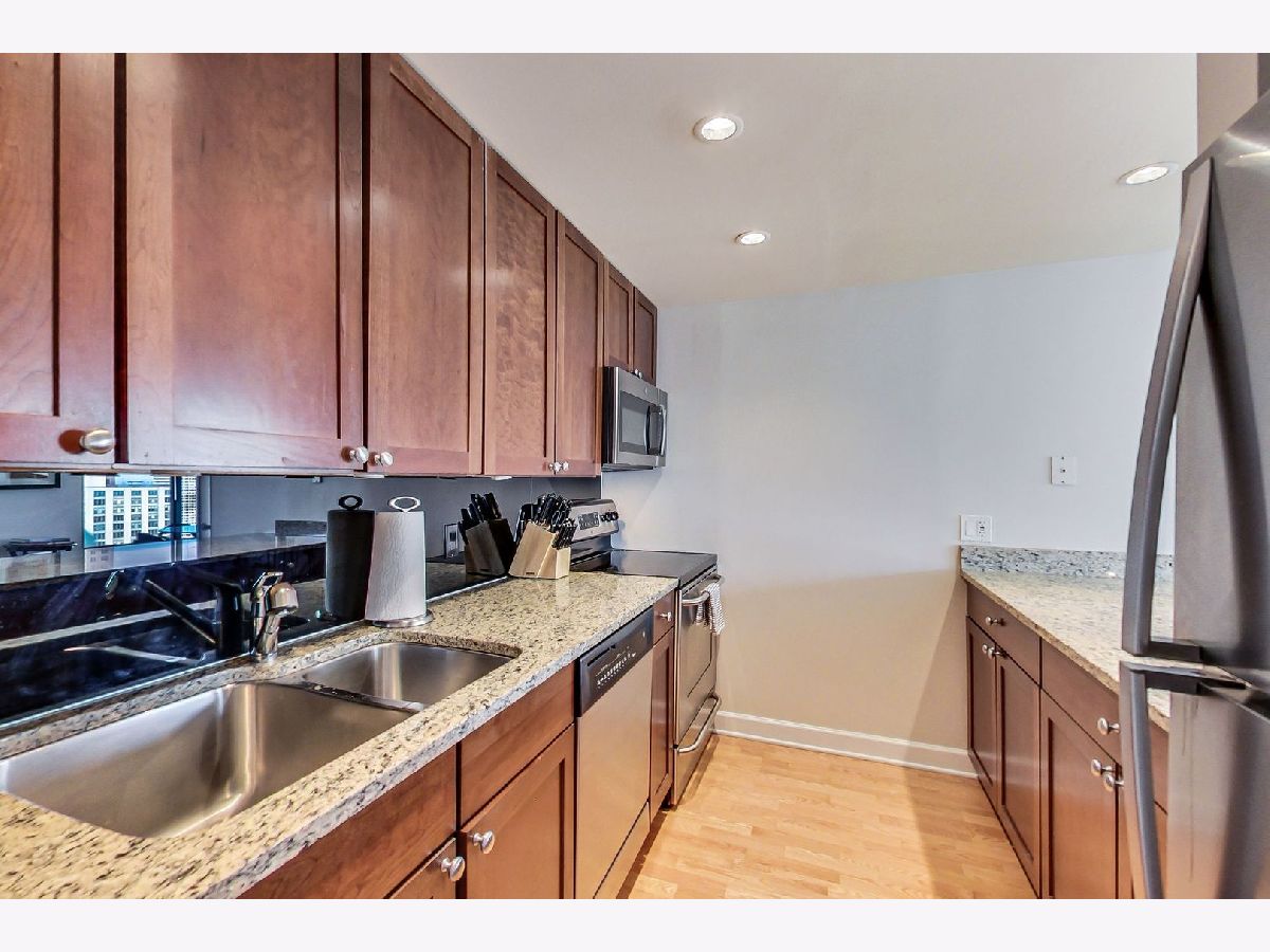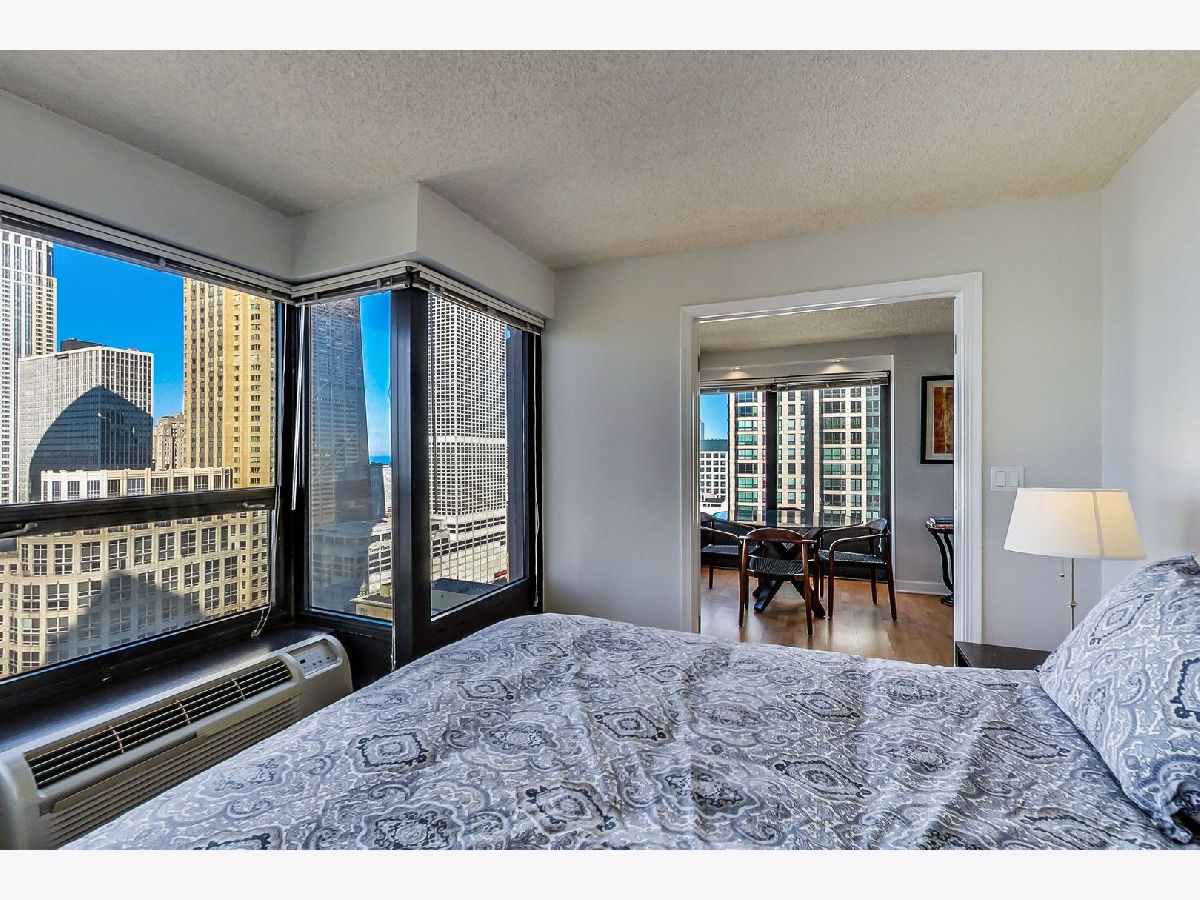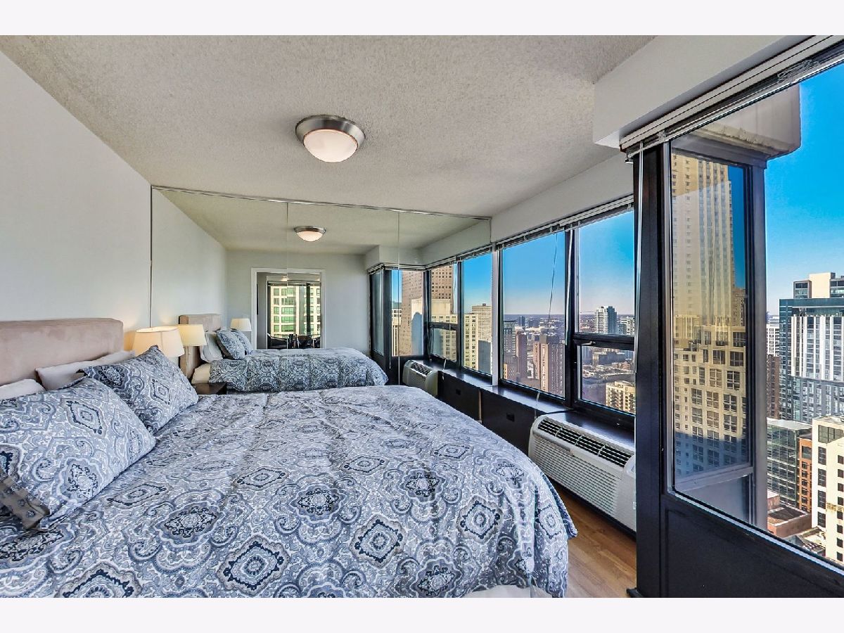 Meticulously well maintained 2 bed 1 bath NE corner unit with incredible city views! New custom paint throughout, Maple HW floors, IN-UNIT washer and dryer. Cook's kitchen features 42" maple cabinets, stainless steel appliances, granite counters & breakfast bar overlooking the living & dining room. Perfect open, split bedroom floor plan. Glass french doors open to 2nd bedroom/den. Upgraded granite & stone bathroom w/ seamless glass shower door & two vanities. Excellent closet & storage throughout. This bright corner home has gorgeous open city views out of every window! Prime walk to everything location in the heart of the Mag Mile/River North. Full amenity building: huge workout room, theatre, party room, sundeck w/grills, heated pool, dry cleaning & more! Premium deeded parking space available additional.