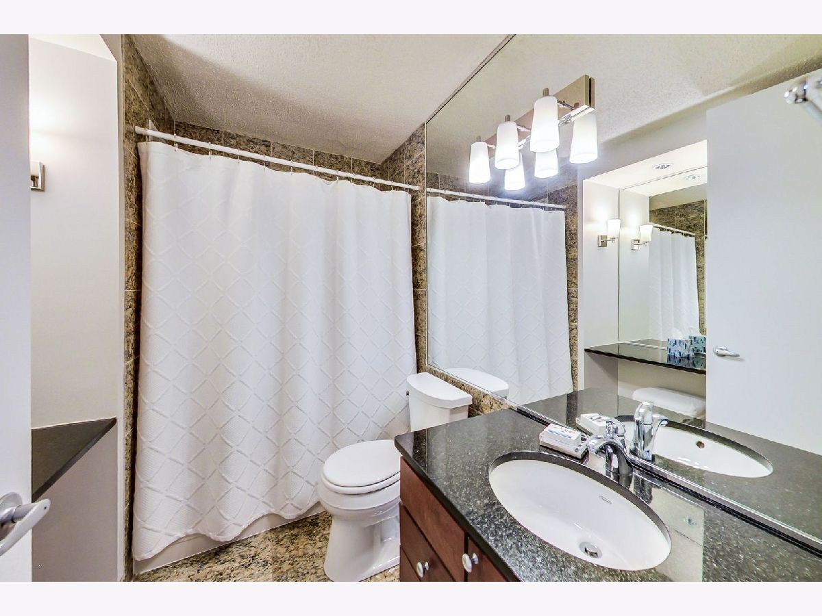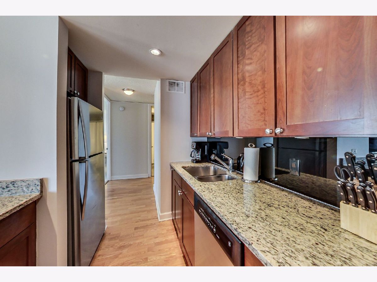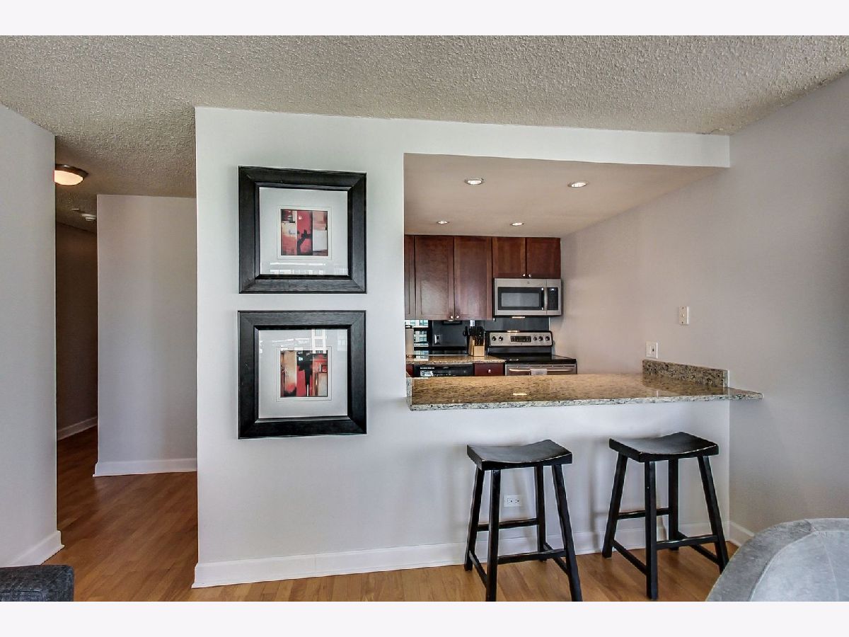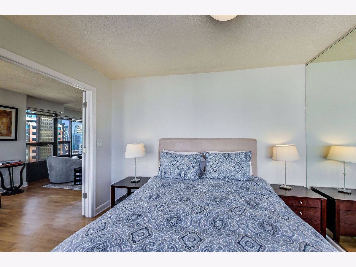 Meticulously well maintained 2 bed 1 bath NE corner unit with incredible city views! New custom paint throughout, Maple HW floors, IN-UNIT washer and dryer. Cook's kitchen features 42" maple cabinets, stainless steel appliances, granite counters & breakfast bar overlooking the living & dining room. Perfect open, split bedroom floor plan. Glass french doors open to 2nd bedroom/den. Upgraded granite & stone bathroom w/ seamless glass shower door & two vanities. Excellent closet & storage throughout. This bright corner home has gorgeous open city views out of every window! Prime walk to everything location in the heart of the Mag Mile/River North. Full amenity building: huge workout room, theatre, party room, sundeck w/grills, heated pool, dry cleaning & more! Premium deeded parking space available additional.