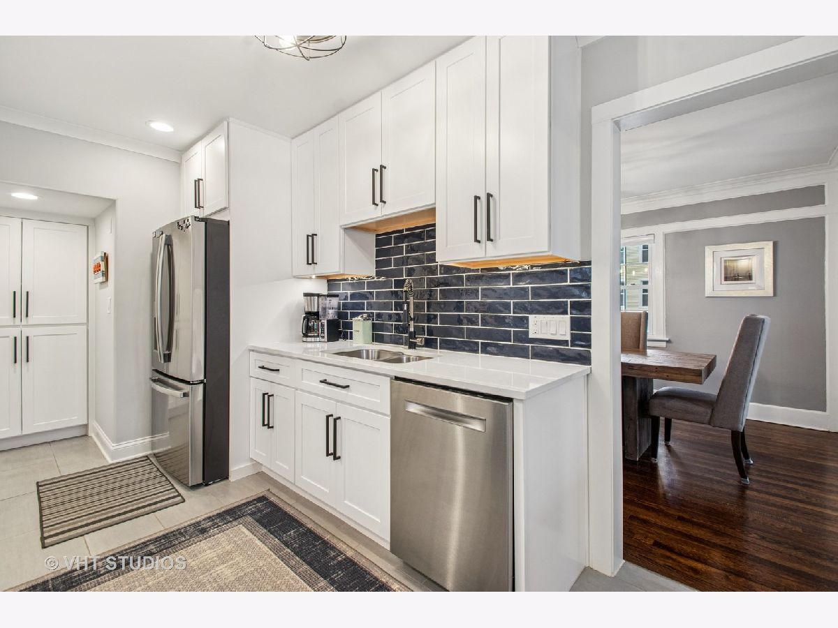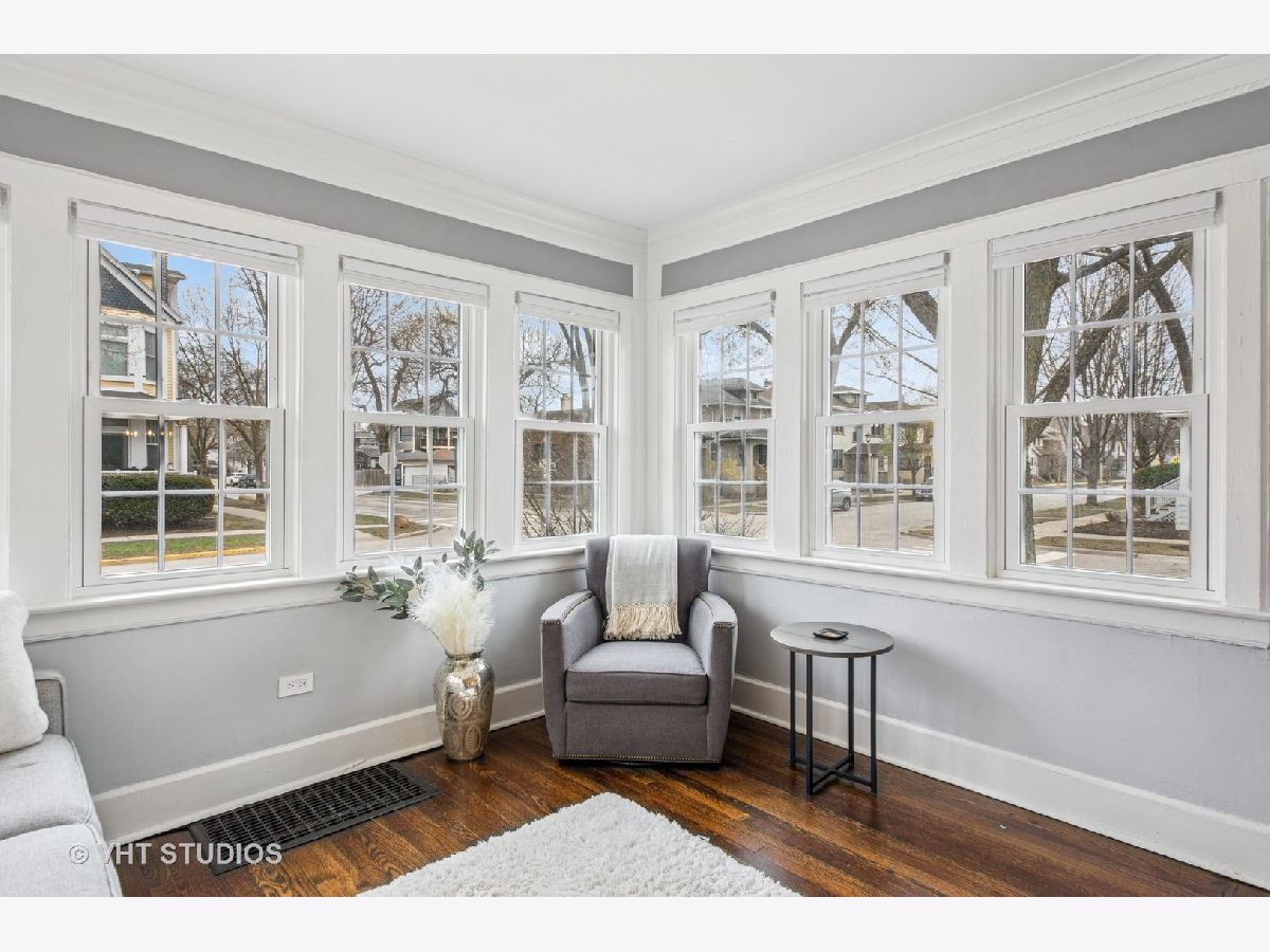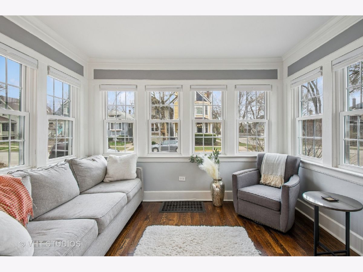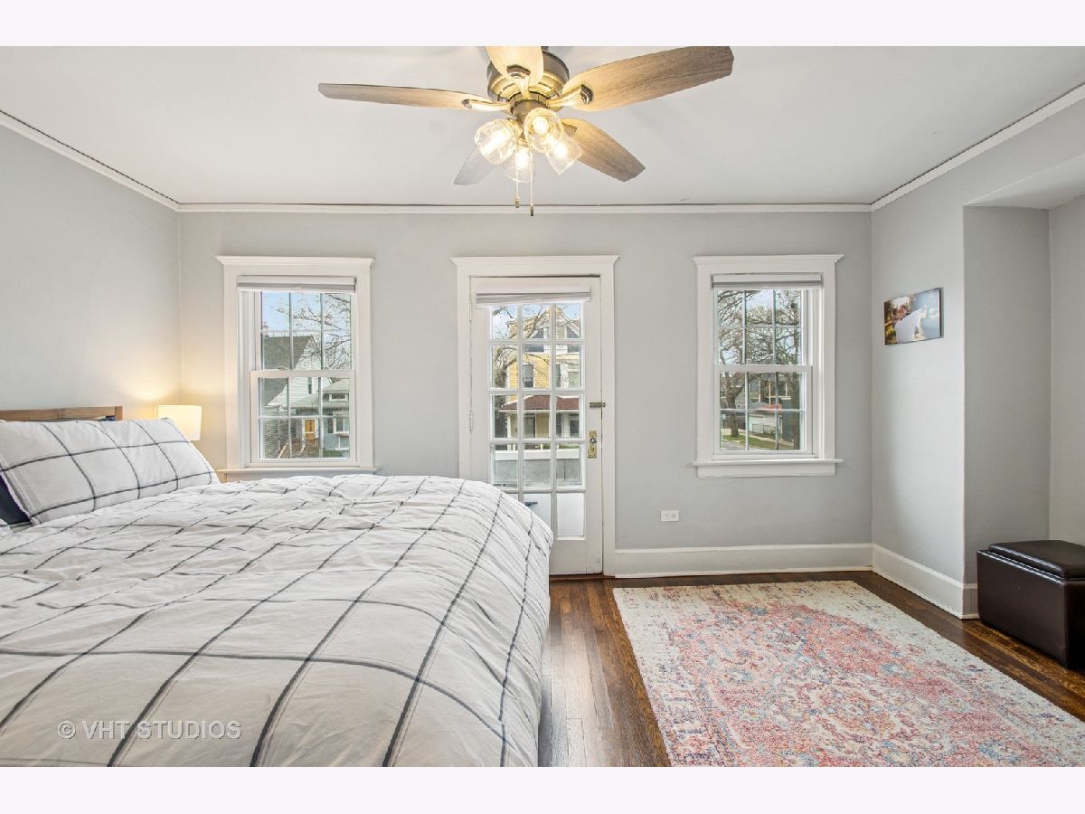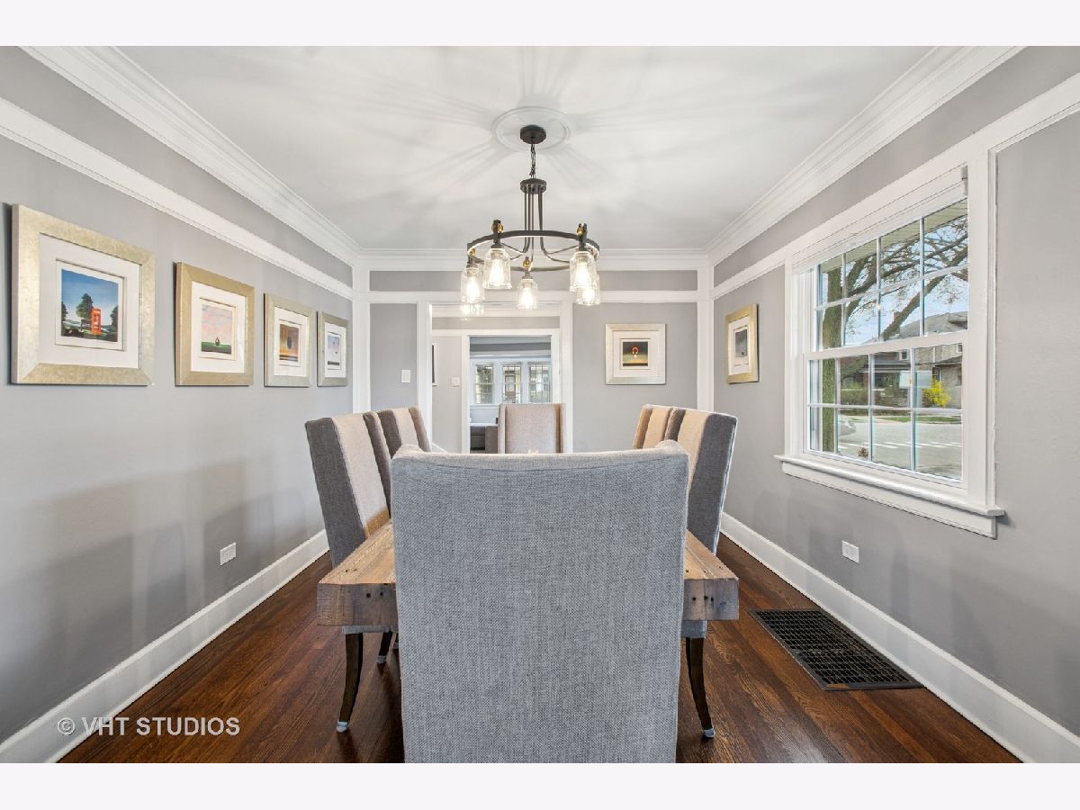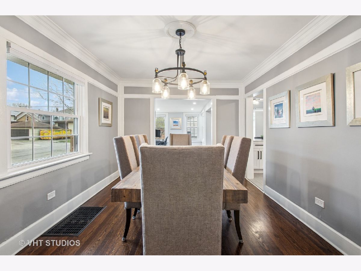 Designed by Meyer & Cook, this classic Center Dutch Colonial blends vintage charm with thoughtful updates-just 9 miles from downtown Chicago on a picturesque, tree-lined street in Oak Park. Step into a gracious foyer and main level where hardwood floors, intricate moldings, and rich architectural details set the tone. French doors lead to a sunroom and a living room anchored by a fireplace and built-in shelving. A separate formal dining room easily seats eight, perfect for gatherings. The 2022 renovated kitchen is a standout, featuring white cabinetry, stainless steel appliances, custom blue Art Deco tile-work, and a breakfast bar that seats four-opening to a cozy seating area for casual lounging. Upstairs, you'll find three spacious bedrooms and a full bath with mosaic tile flooring. The sun-filled primary bedroom opens onto a large private balcony, offering a quiet retreat. The full basement includes a finished rec room, ample storage, and a dedicated workroom. Out back, enjoy a private, fenced-in yard with an expansive deck that seats twelve-ideal for summer entertaining-and a two-car garage. This beautifully updated home sits in a family-friendly neighborhood, steps from Longfellow Park and School, the New Park Community Recreation Center (offering a gym and kids' programming), and just a short walk to the restaurants and shops of Harrison Street. Equidistant to both the Green and Blue Line and with easy access to I-290, this is a rare blend of charm, convenience, and community-truly a destination of grandeur