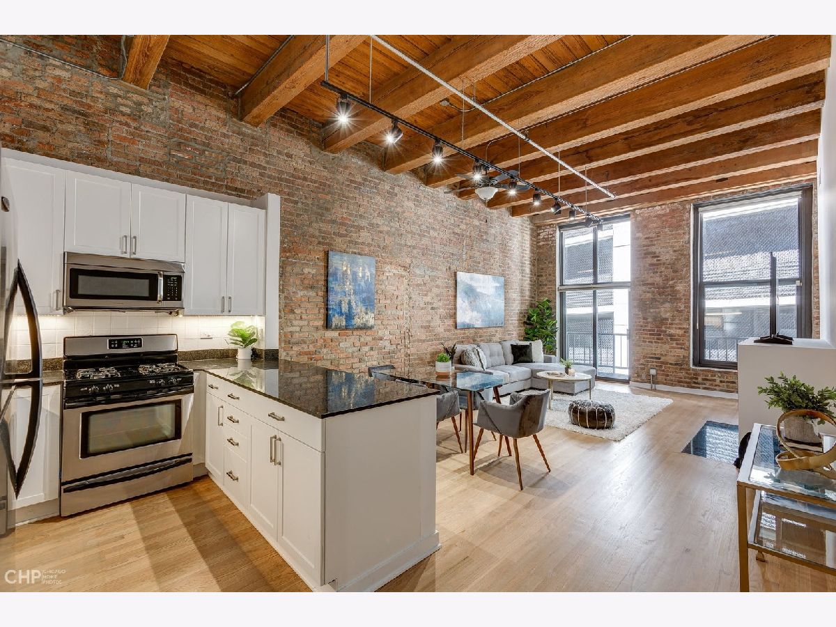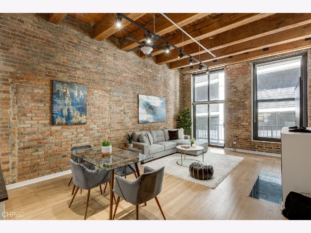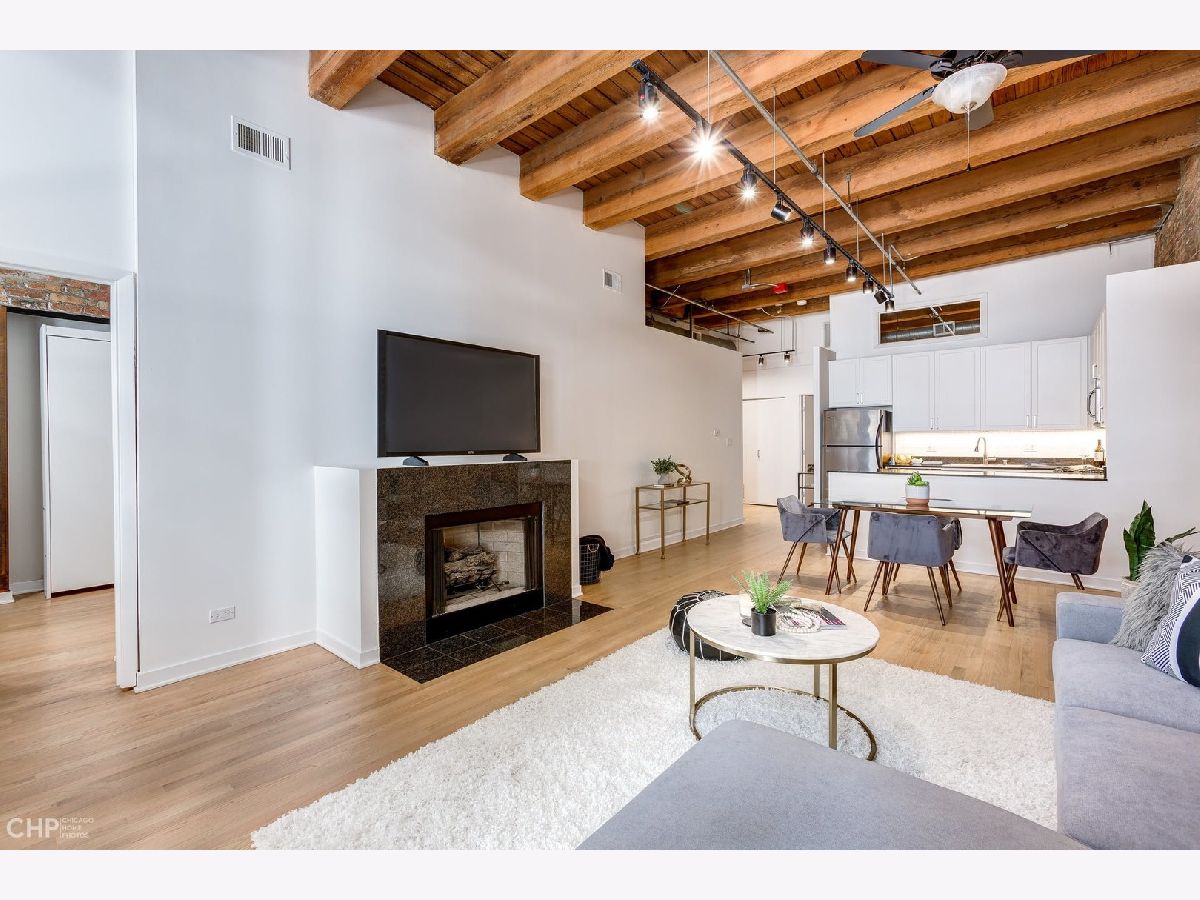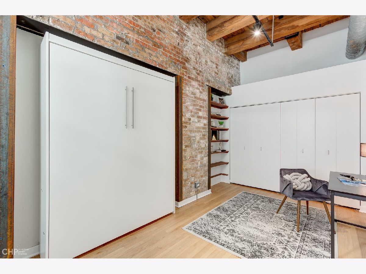 Watch Video Tour by clicking on VIDEO button above! Beautifully updated 2 bed, 2 bath brick and timber loft featuring soaring 13' ceilings and refinished solid white oak hardwood flooring in River North! This unique home features and updated gourmet kitchen with white shaker cabinets, brushed nickel hardware, LED under cabinet lighting, and stainless steel appliances. The kitchen opens into a large, combined living/dining area complete with gas fireplace. Large primary bedroom has ample space for a king bed, and nightstands, dual closets, and ensuite bath. Second bedroom comes with a built-in murphy bed that easily tucks away to add additional functionality to the room for a den or home office space. Large balcony, In unit laundry, extra large storage cage, updated lightning, crisp white paint, and recently updated common rooftop with city views make this the perfect move-in ready city loft! Heated garage parking available for an additional $25K.