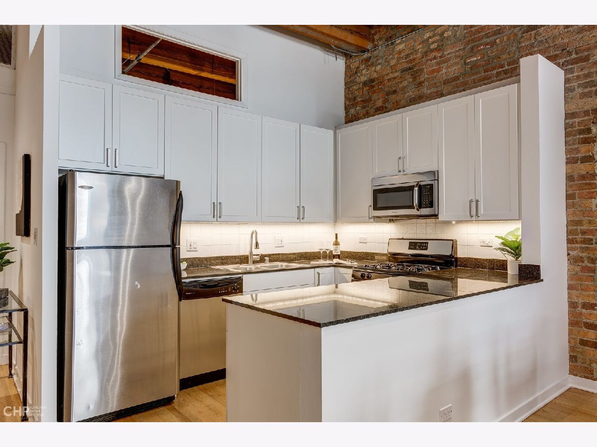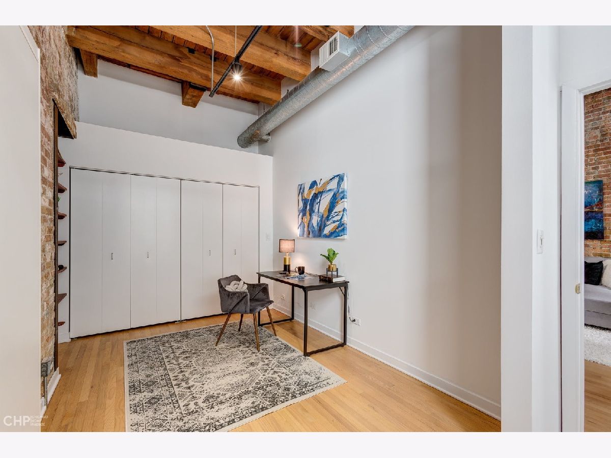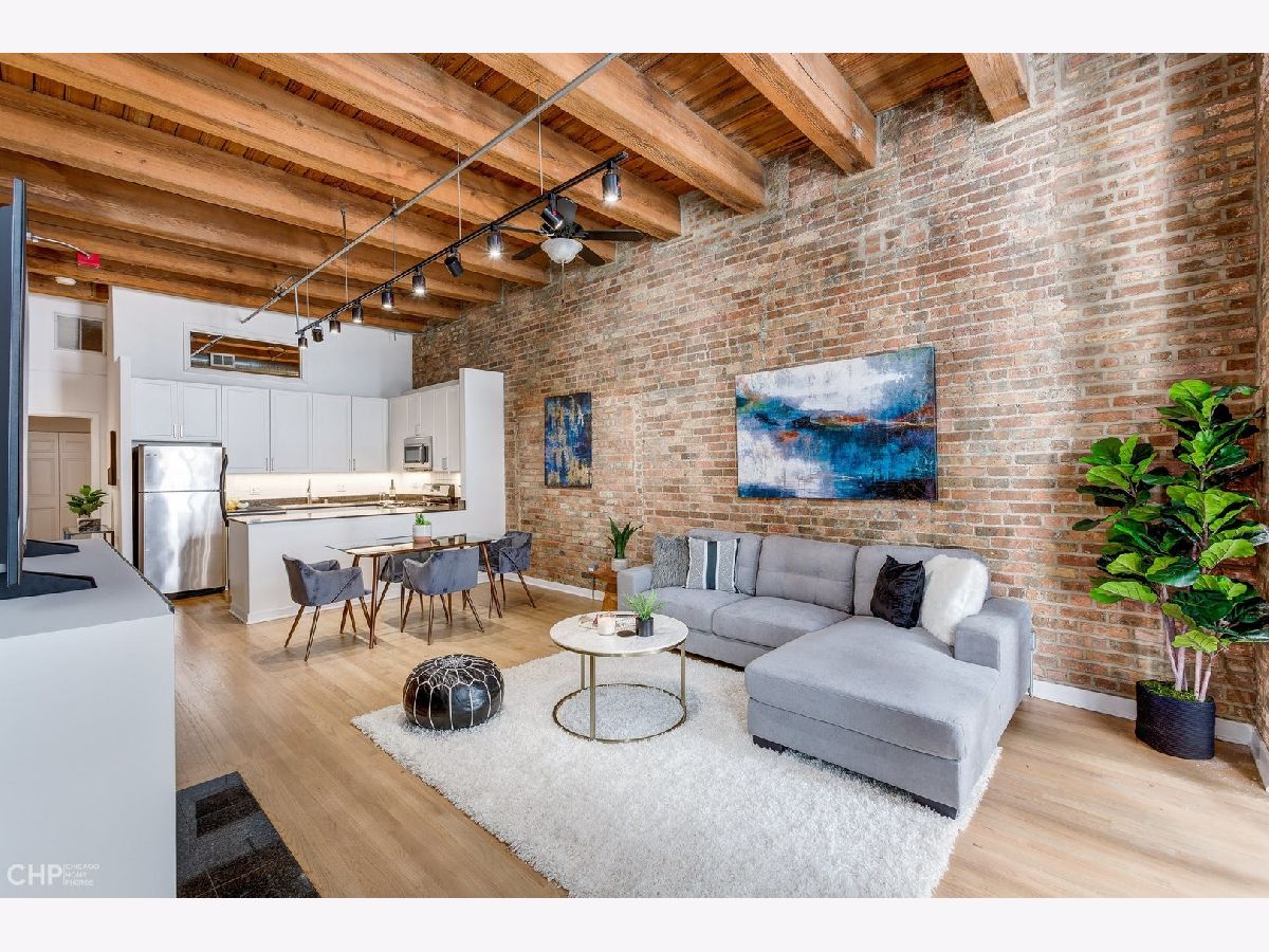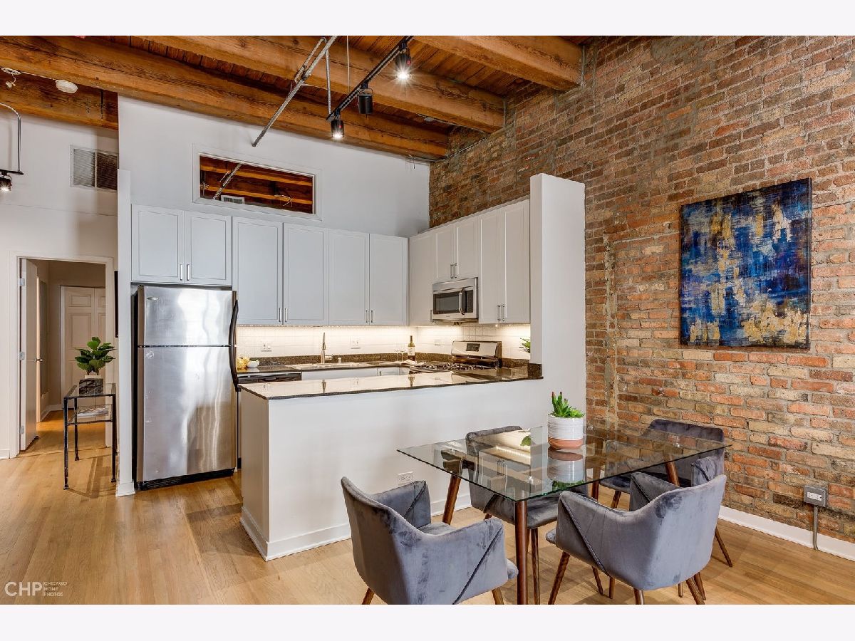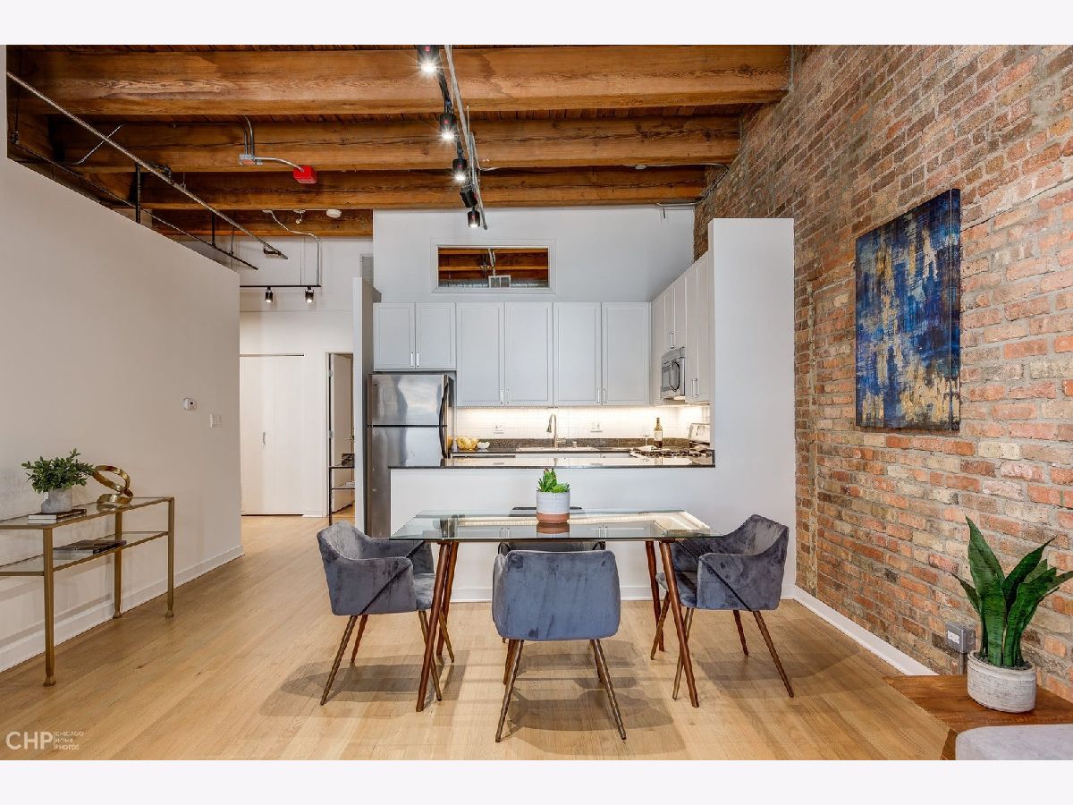 Watch Video Tour by clicking on VIDEO button above! Beautifully updated 2 bed, 2 bath brick and timber loft featuring soaring 13' ceilings and refinished solid white oak hardwood flooring in River North! This unique home features and updated gourmet kitchen with white shaker cabinets, brushed nickel hardware, LED under cabinet lighting, and stainless steel appliances. The kitchen opens into a large, combined living/dining area complete with gas fireplace. Large primary bedroom has ample space for a king bed, and nightstands, dual closets, and ensuite bath. Second bedroom comes with a built-in murphy bed that easily tucks away to add additional functionality to the room for a den or home office space. Large balcony, In unit laundry, extra large storage cage, updated lightning, crisp white paint, and recently updated common rooftop with city views make this the perfect move-in ready city loft! Heated garage parking available for an additional $25K.